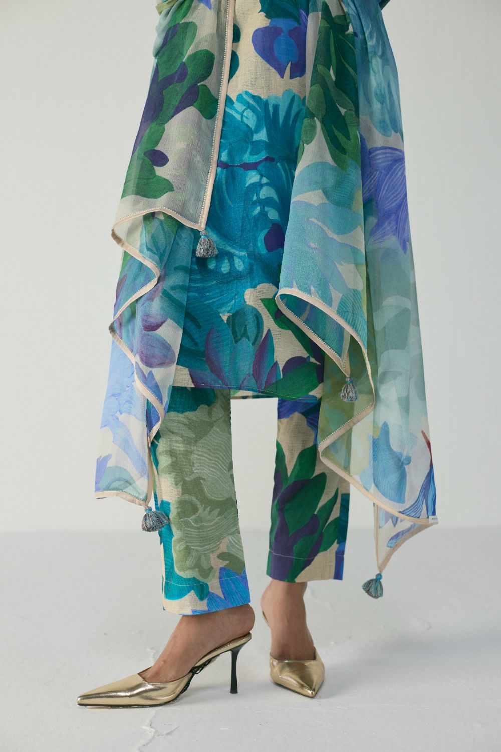 The set is adorned with a striking painterly botanical print, inspired by lush tropical foliage. Oversized leaves and abstract florals unfold in refreshing tones of teal, turquoise, ocean blue, emerald green, and soft lilac, layered over a natural beige textured base. The print blends watercolour gradients and hand-rendered detailing, giving the ensemble an artistic depth and a sense of organic calm. The interplay of cool tones against the neutral backdrop creates a serene yet statement-making visual.