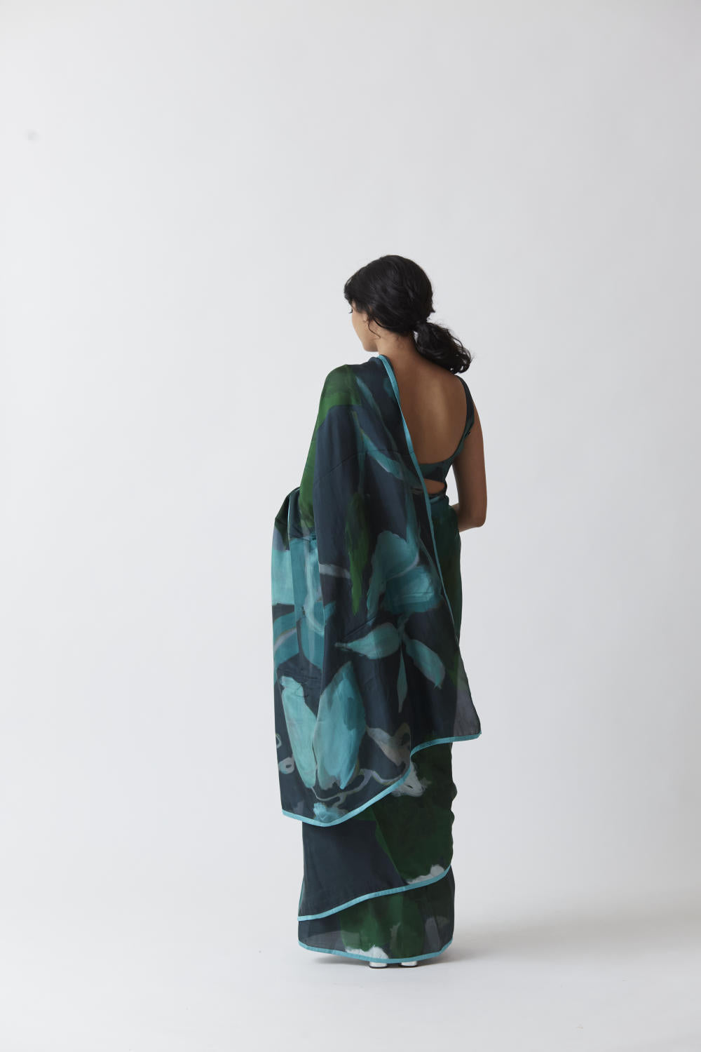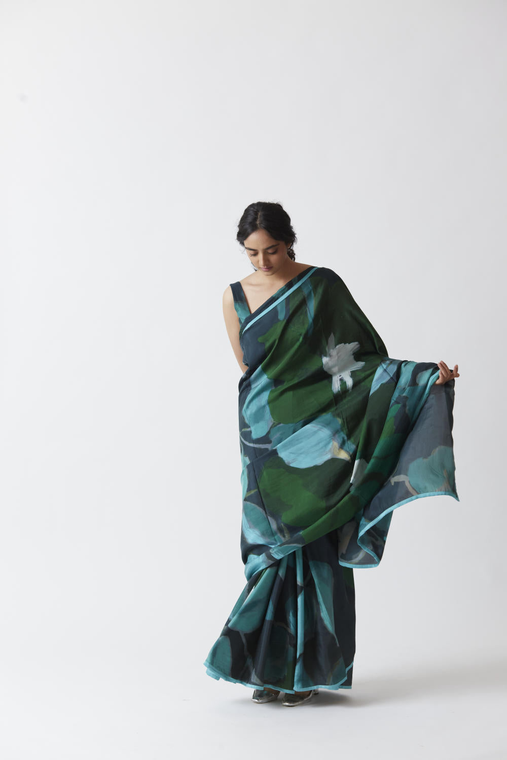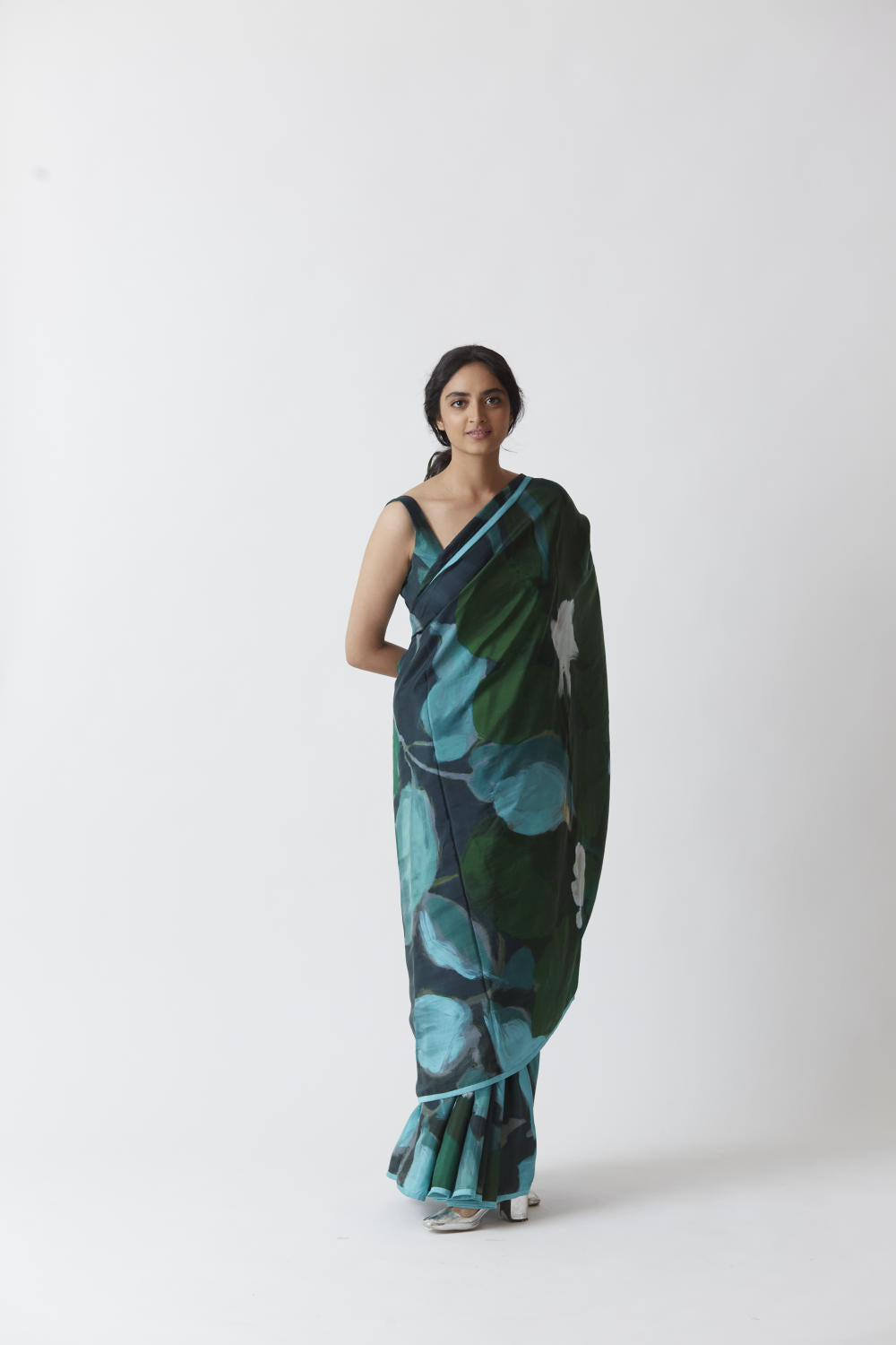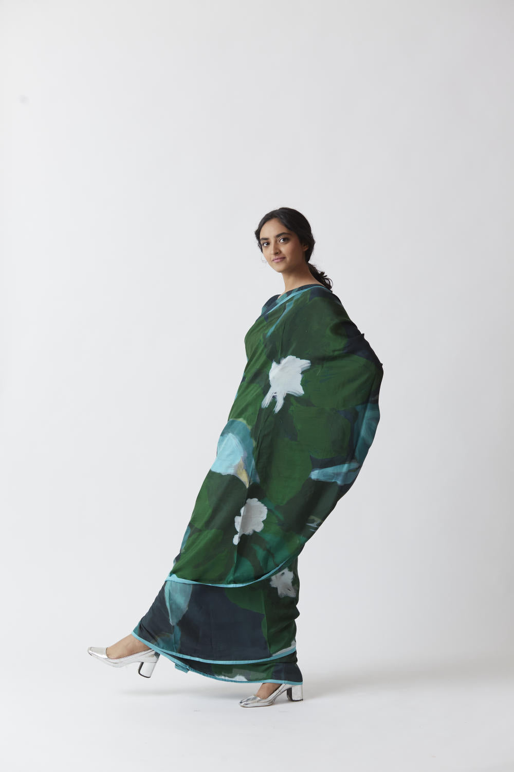 The saree is crafted in the Jade print carefully printed on Pure silk.