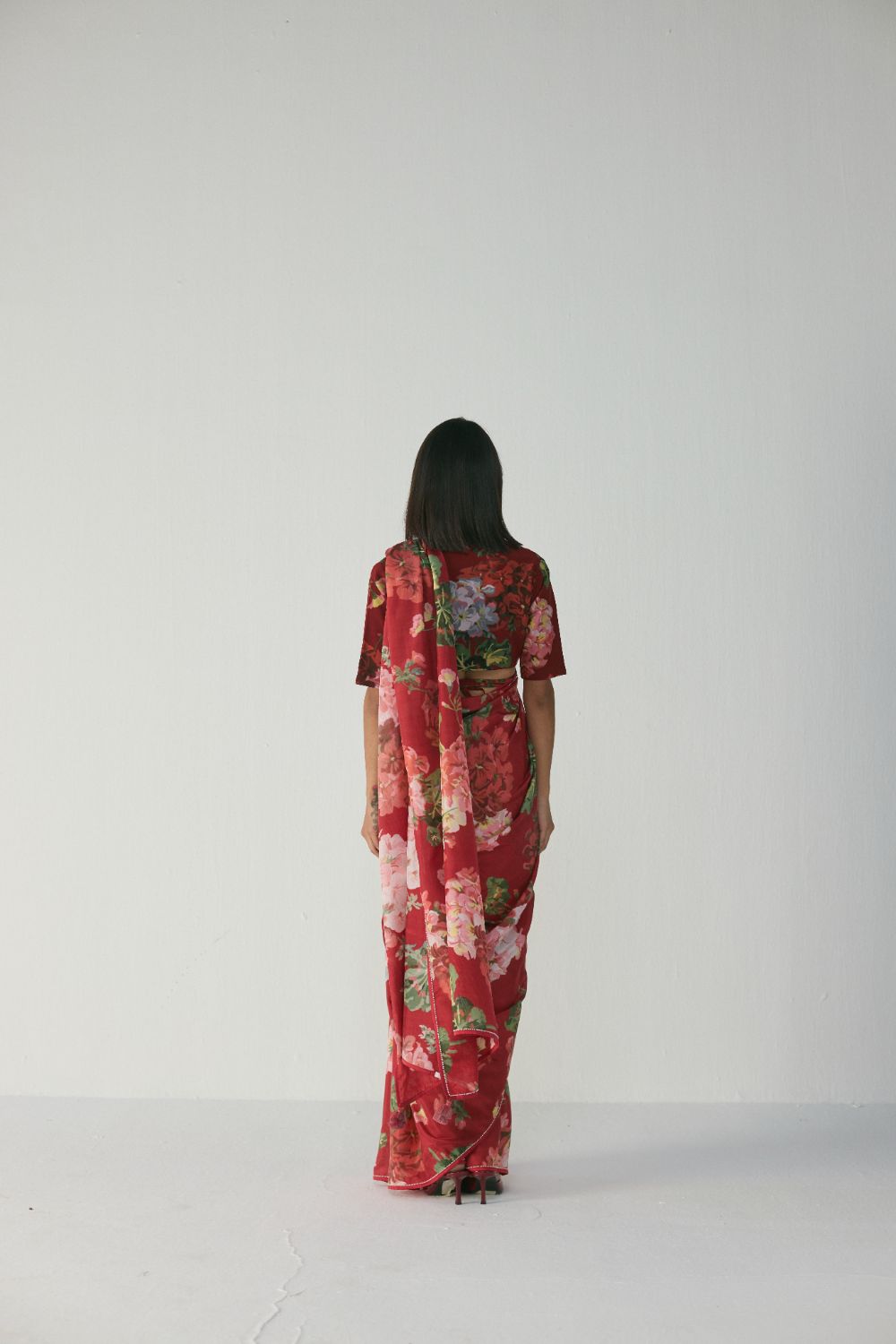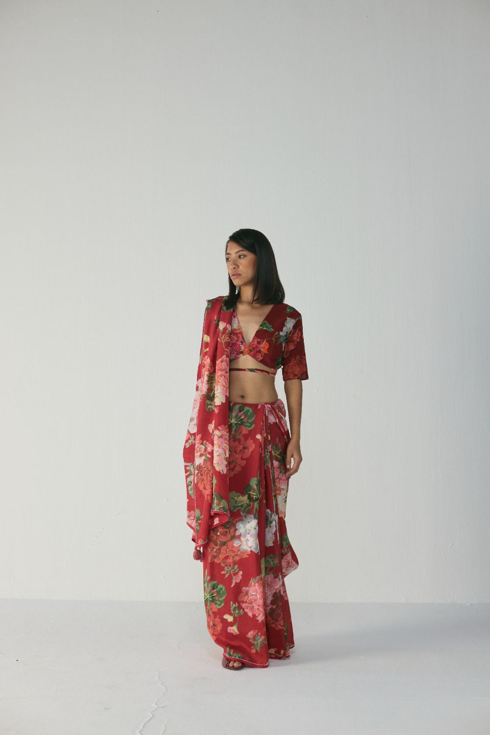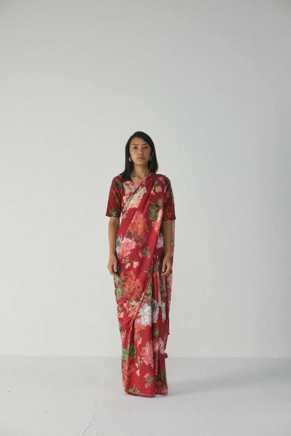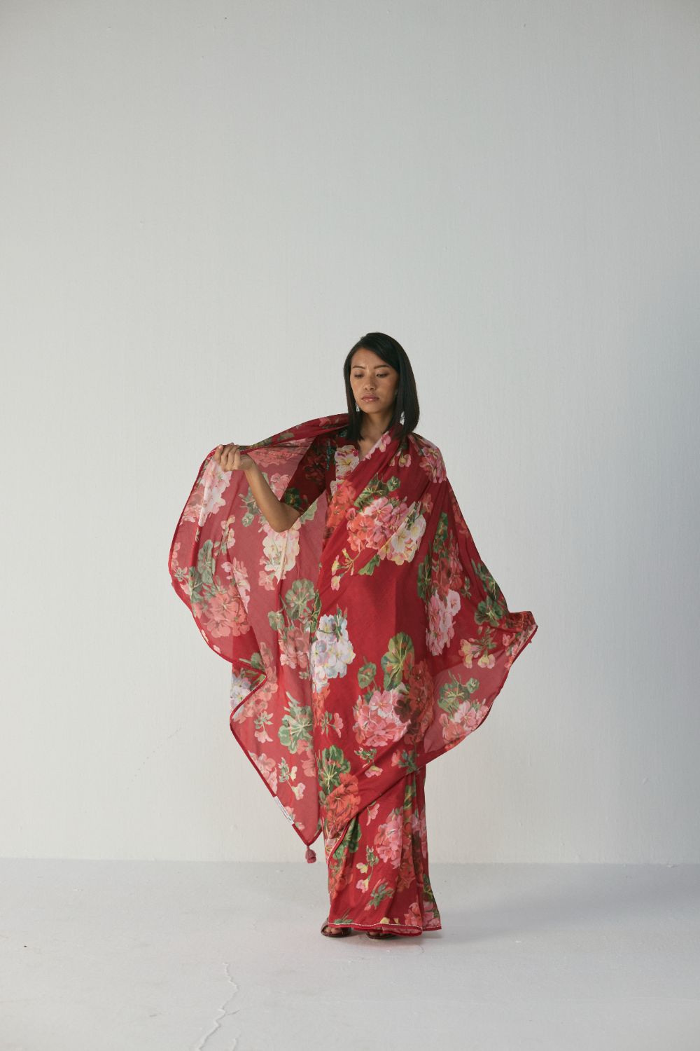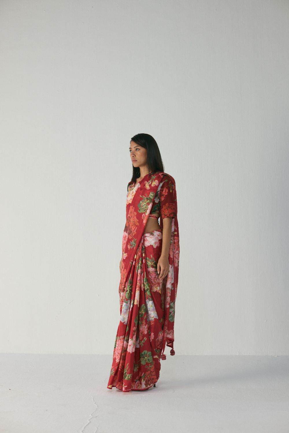 This saree features a striking painterly floral print set on a rich ruby-red base, creating an elegant yet bold visual impact. The artwork showcases blooming roses, daisies, and lush foliage in harmonious shades of blush pink, soft coral, ivory, and leafy greens. The florals carry a hand-painted, watercolour-inspired texture, giving the saree an artistic depth and a luxurious, crafted feel. The placement of the print enhances both the drape and the movement of the saree, making it visually captivating from every angle.