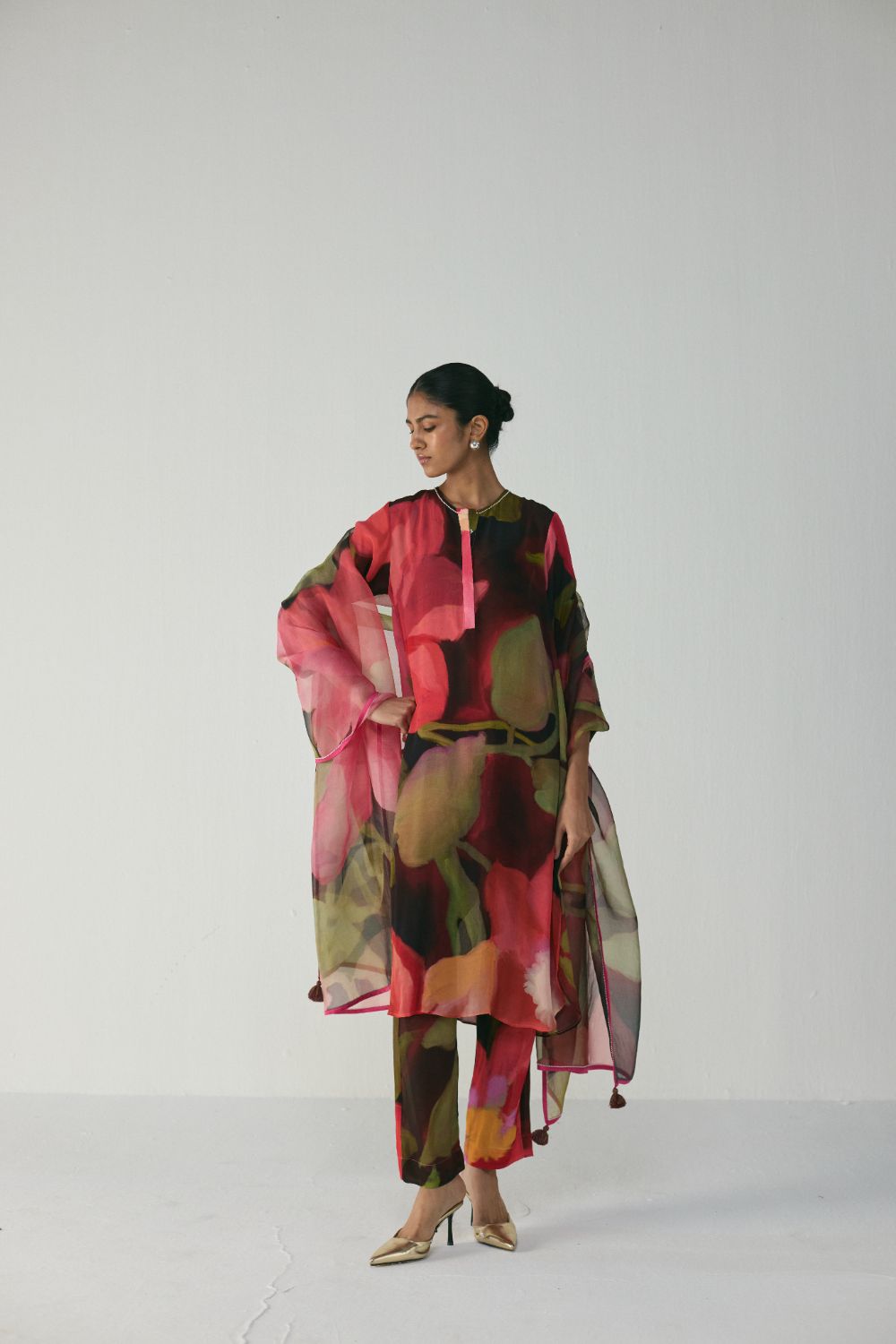 Style this dupatta over a monochrome kurta set to let its fluid print stand out, or drape it loosely over the shoulders with metallic heels for a refined festive look.