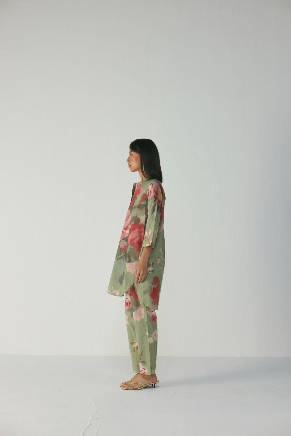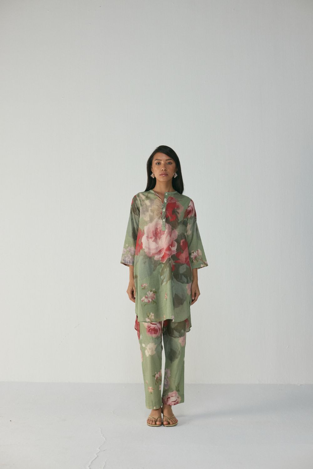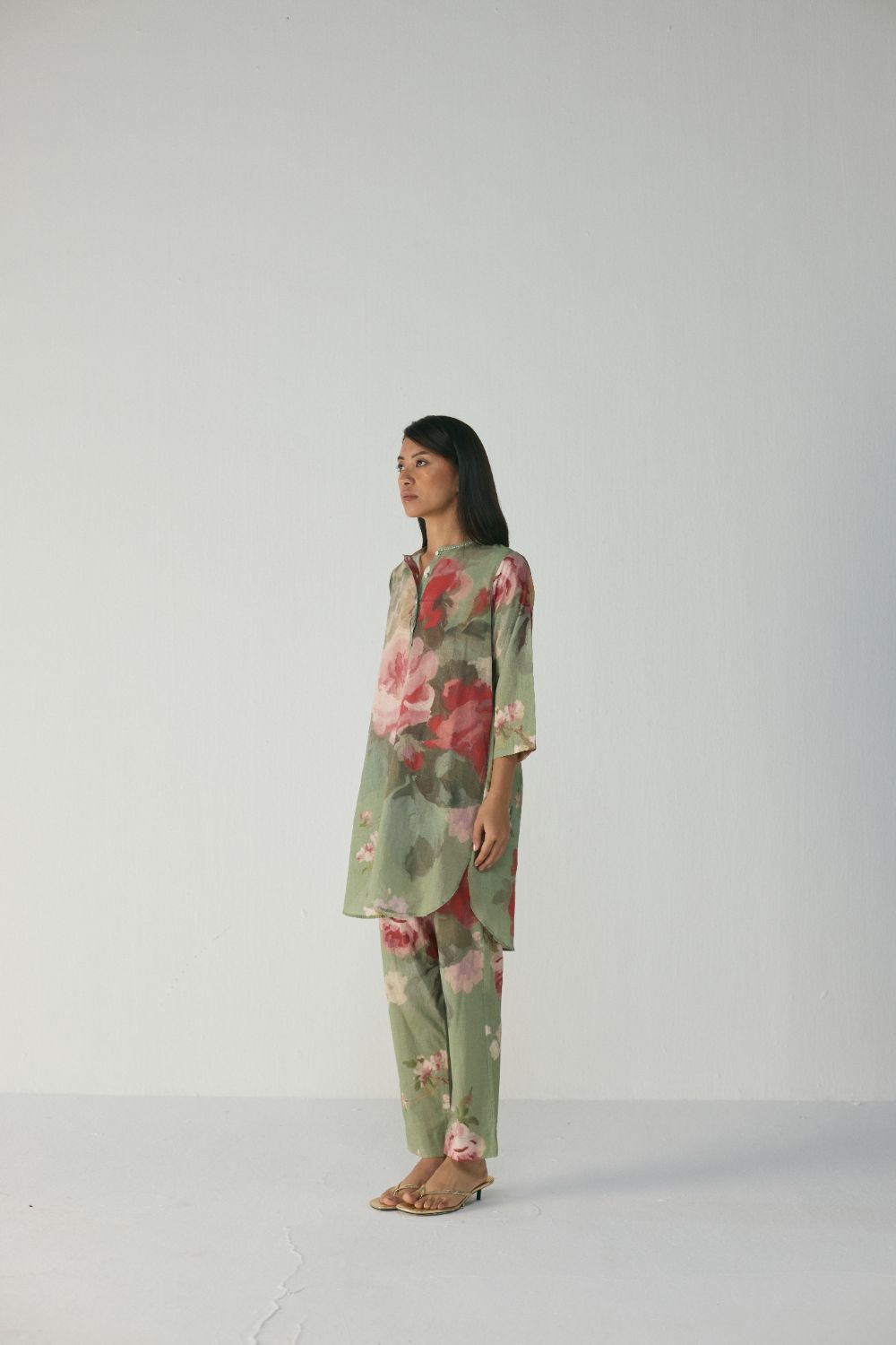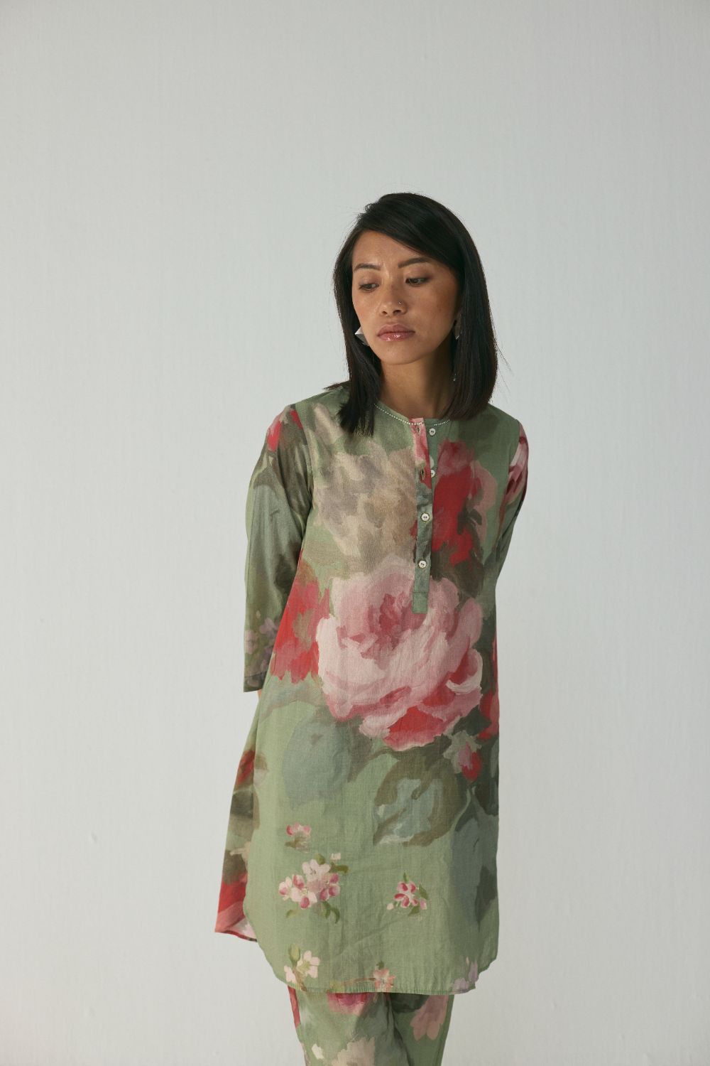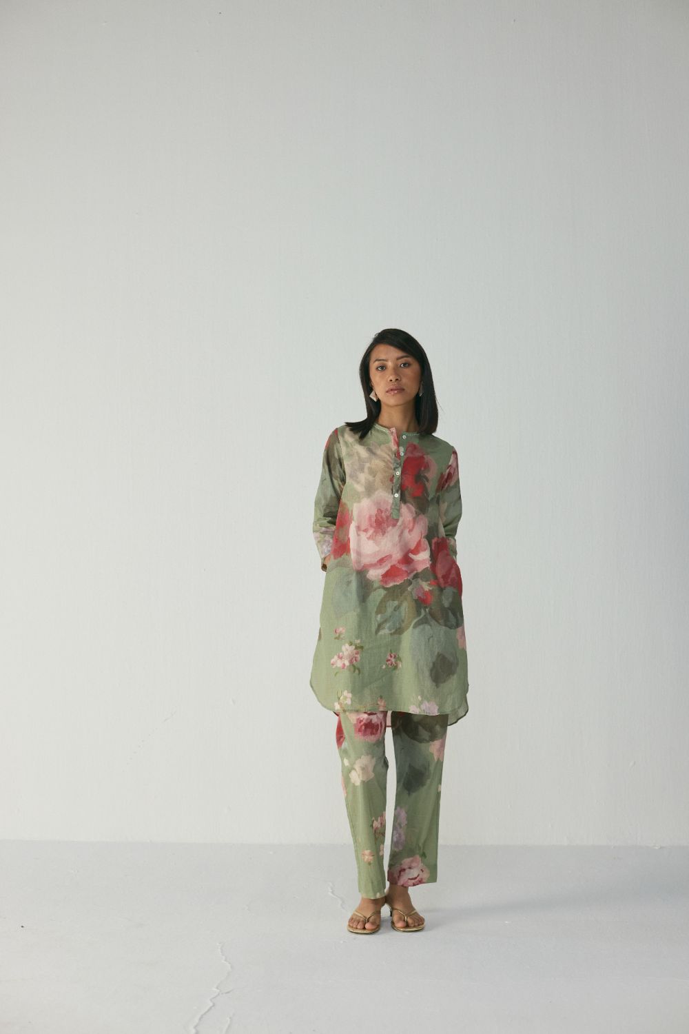 The kurta set is adorned with a stunning painterly floral print inspired by hand-painted botanical artwork. Soft, blurred roses in delicate hues of blush pink, deep rose, and creamy ivory bloom across a calming sage-green backdrop, creating a soothing yet elevated aesthetic.The ensemble is crafted in a lightweight, airy fabric that drapes beautifully while allowing ease of movement, making it ideal for both casual outings and refined daytime gatherings.