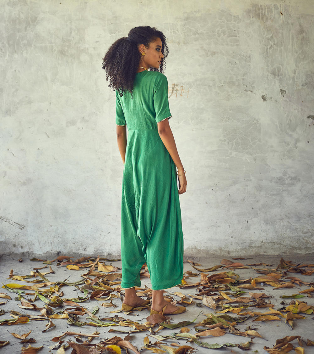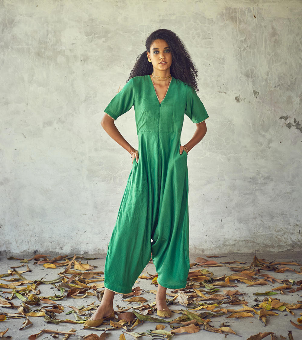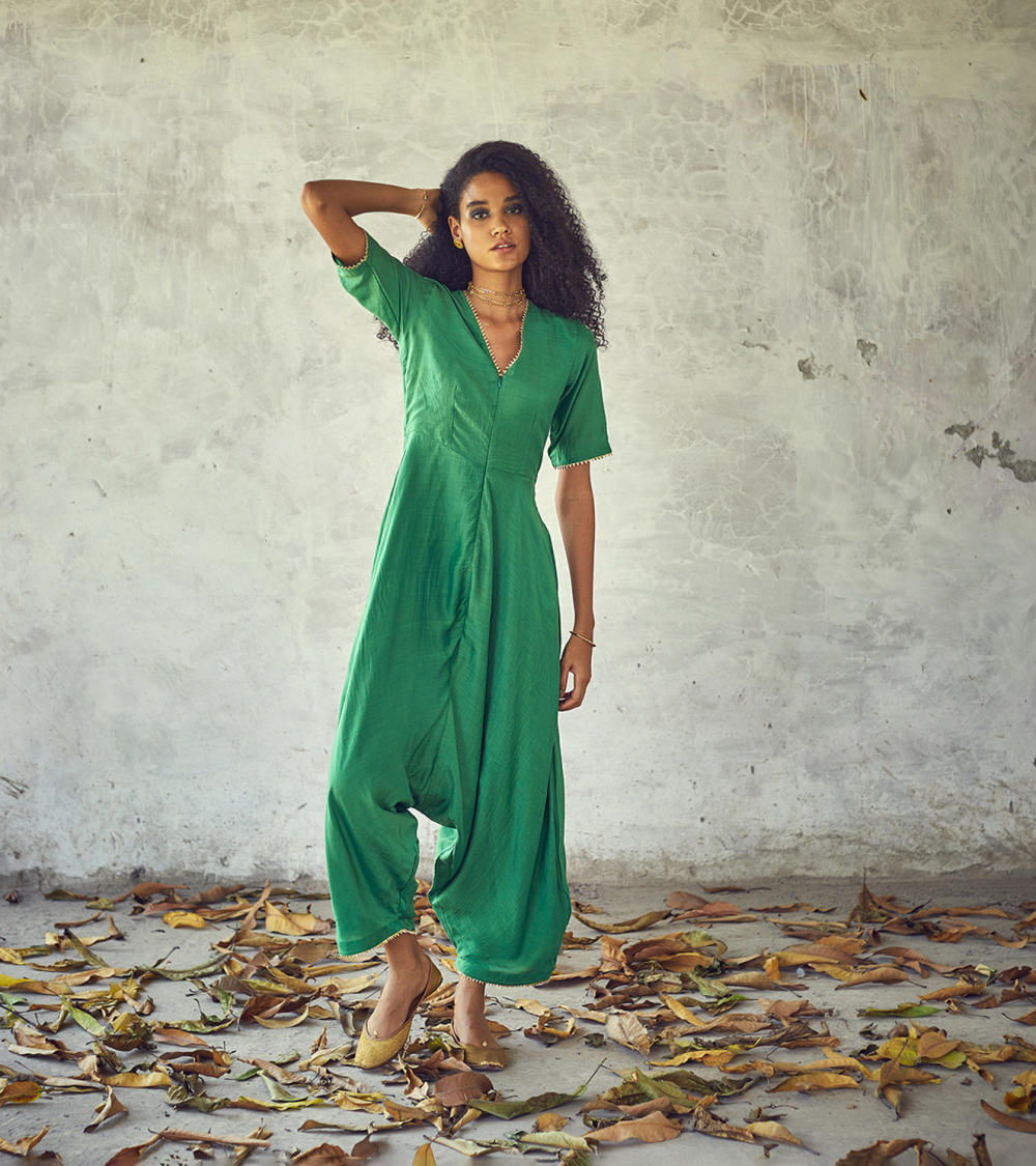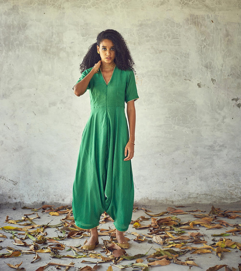Fresh green drop - crotch harem bottom jumpsuit for the indie souls. Yoke with a V - neck front zipper opening and short sleeves and minimal use of gota trims.