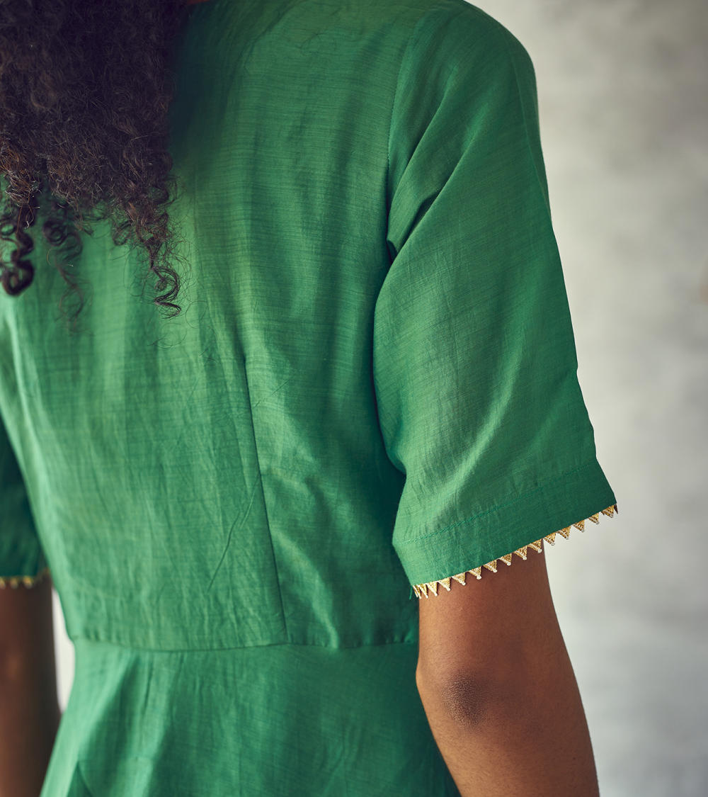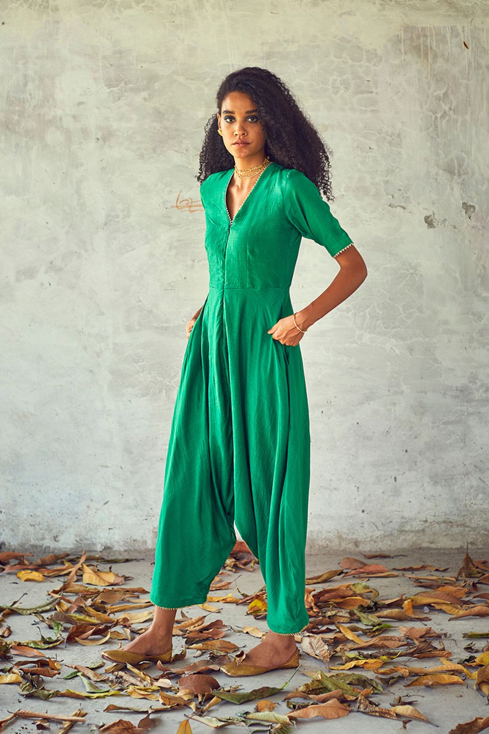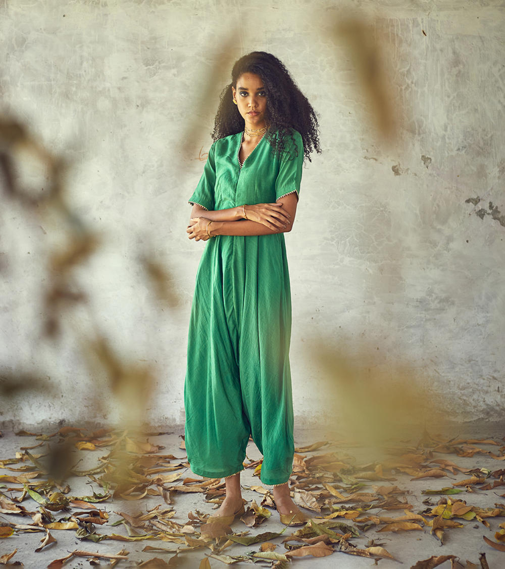 Fresh green drop - crotch harem bottom jumpsuit for the indie souls. Yoke with a V - neck front zipper opening and short sleeves and minimal use of gota trims.