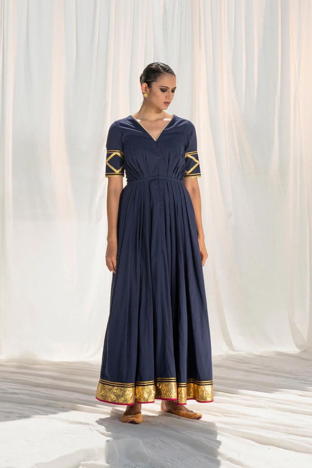Stand out in a flash with this sweeping maxi dress. Crafted in 100% pure mulmul fabric, this gorgeous piece features a front button panel and a fitted body that flares down from the waist below. This breath-taking beauty is a standout with its multiple layers, contrasting piping and delicate gota work that runs all along the hemline.