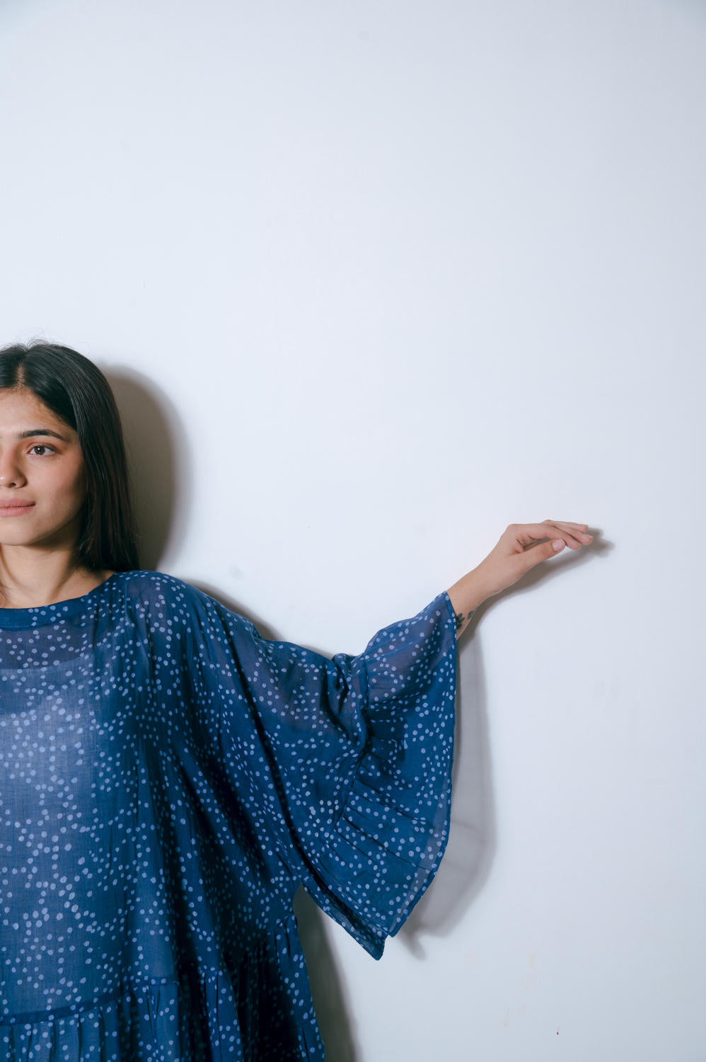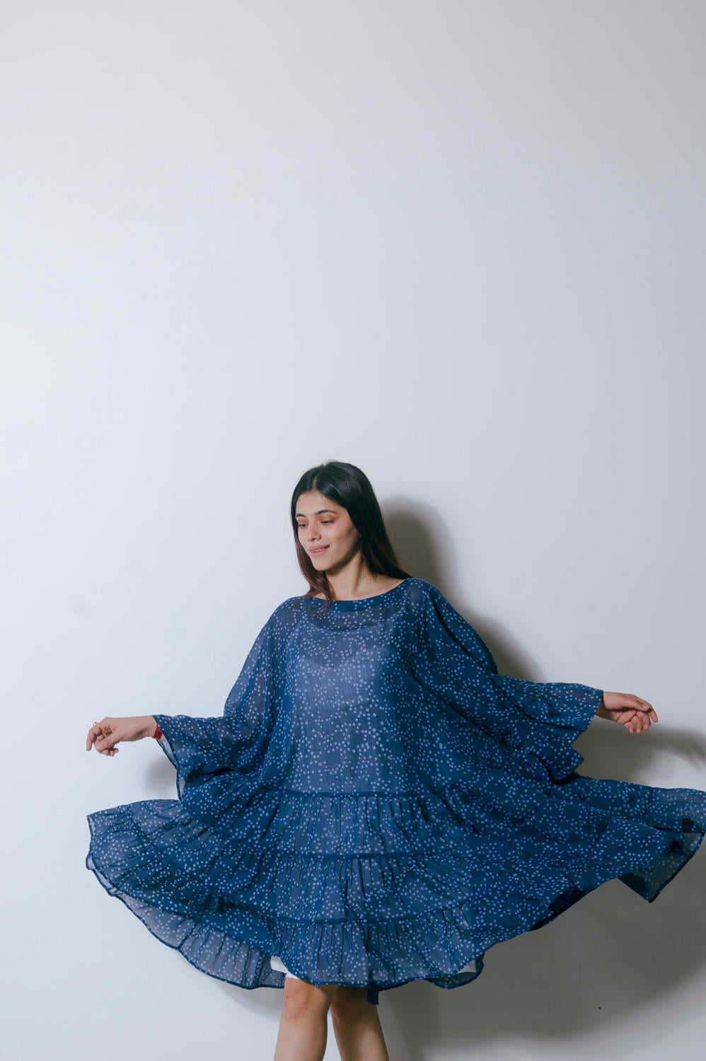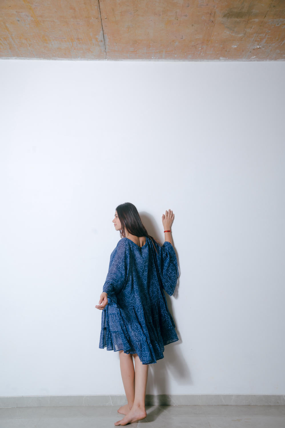 A product of exquisite craftsmanship, our Arabian Dress showcases an indigo colour palette. Handcrafted in soft mulmul cotton fabric, this elegant dress comes embellished with an extremely flared sleeve along with the three layers of gathers on this short summer dress.