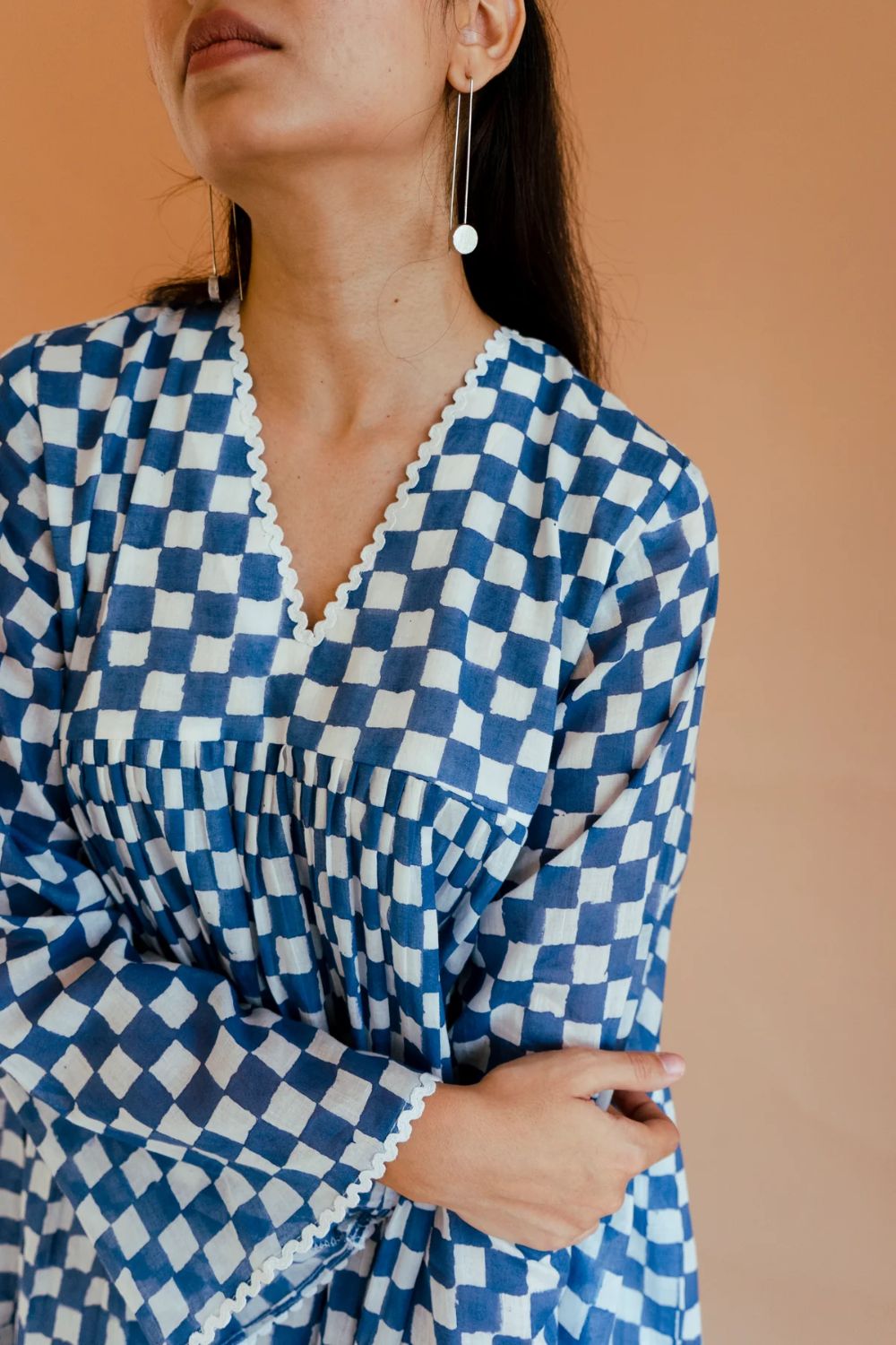 This ivory and blue checked cotton dress features a flattering V-neckline and full sleeves, offering a timeless silhouette. The short yoke is adorned with delicate pleating, adding texture and visual interest to the design. Crafted from breathable cotton, making it an ideal choice for both casual outings and semi-formal occasions. Its classic checkered pattern and thoughtful detailing make it a versatile addition to any wardrobe.