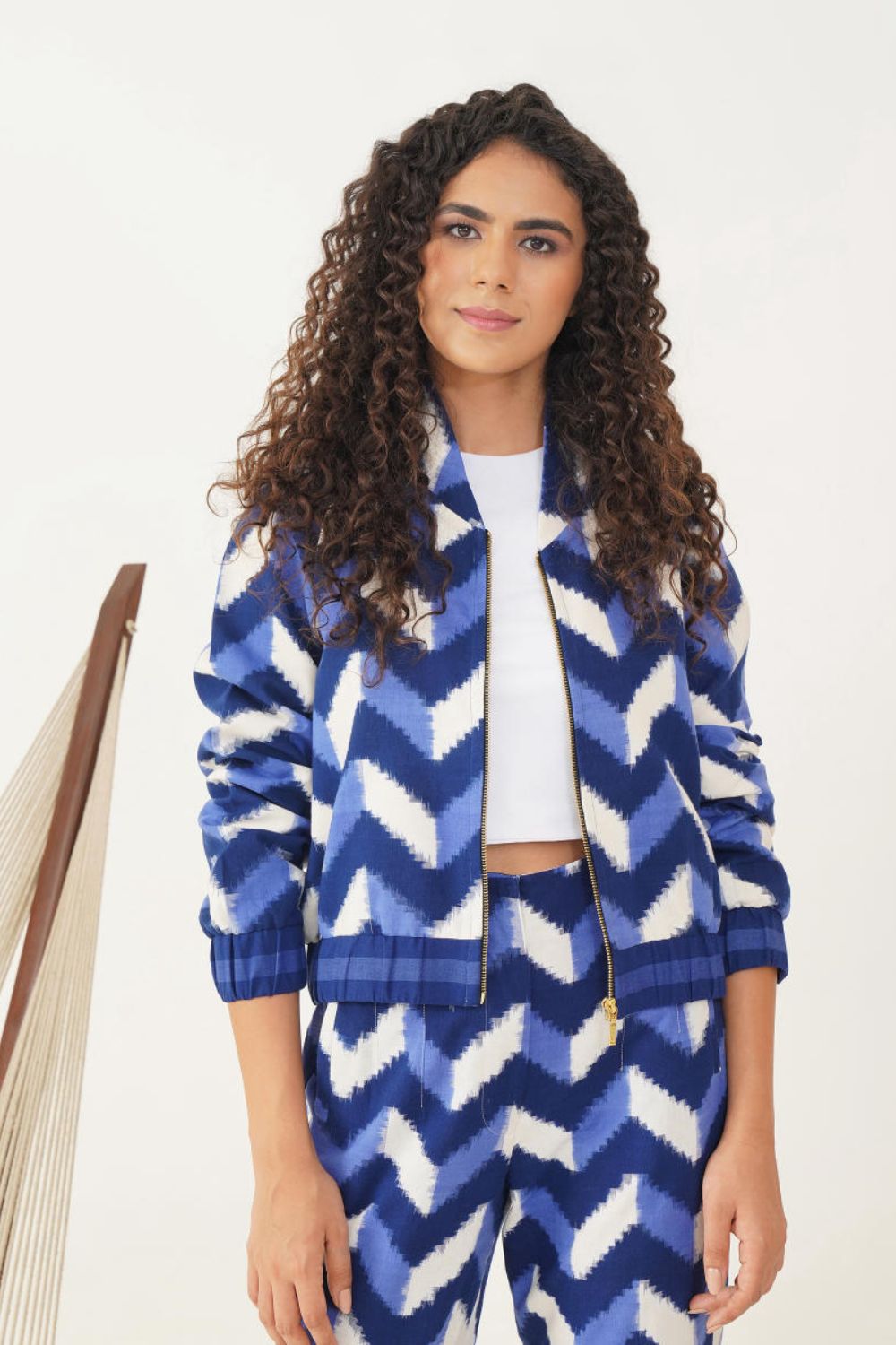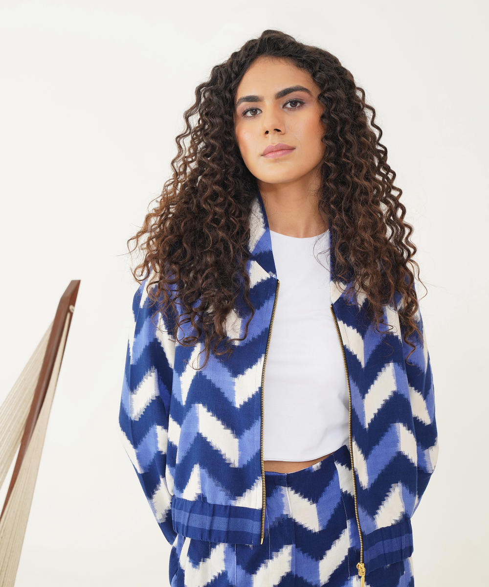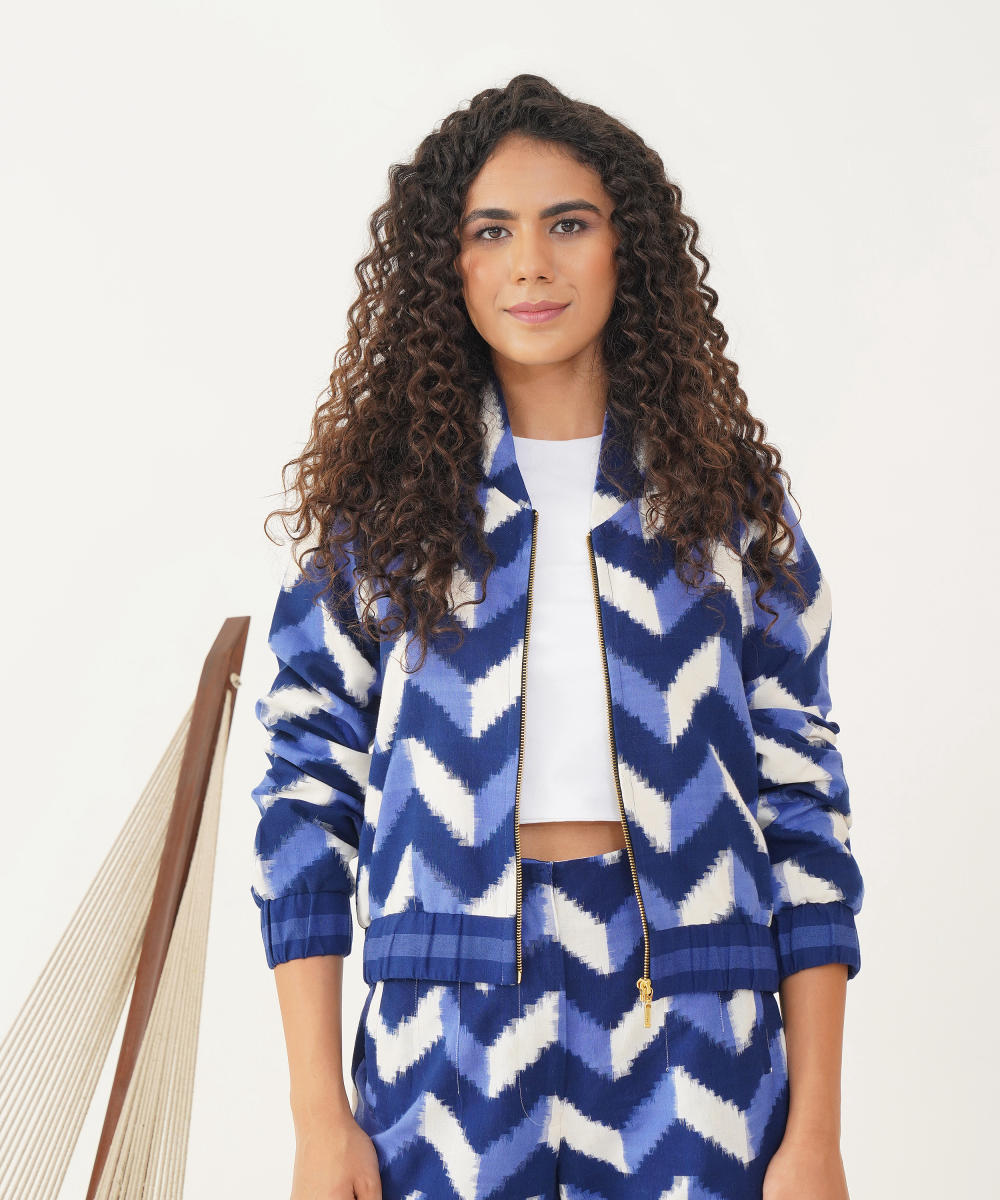 The ikat bomber jacket features a vibrant zigzag pattern, blending traditional craftsmanship with modern style. Its lightweight fabric offers comfort, while the bold design adds a playful touch, making it a versatile statement piece for any outfit.