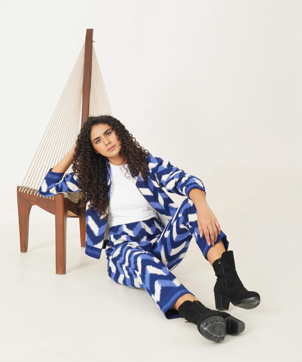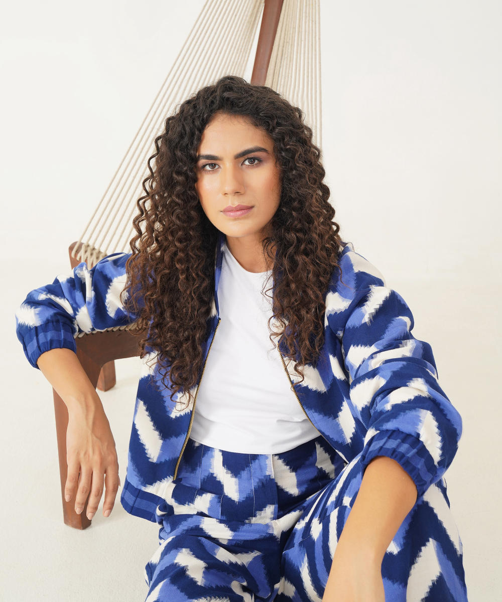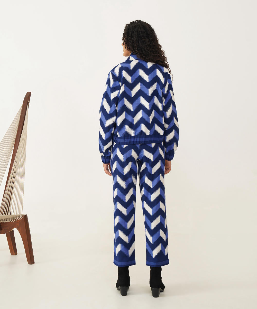 The ikat bomber jacket features a vibrant zigzag pattern, blending traditional craftsmanship with modern style. Its lightweight fabric offers comfort, while the bold design adds a playful touch, making it a versatile statement piece for any outfit.