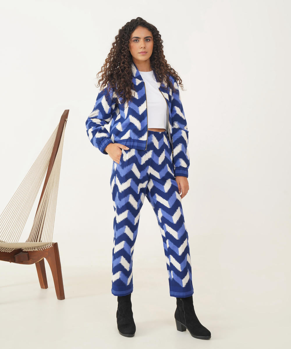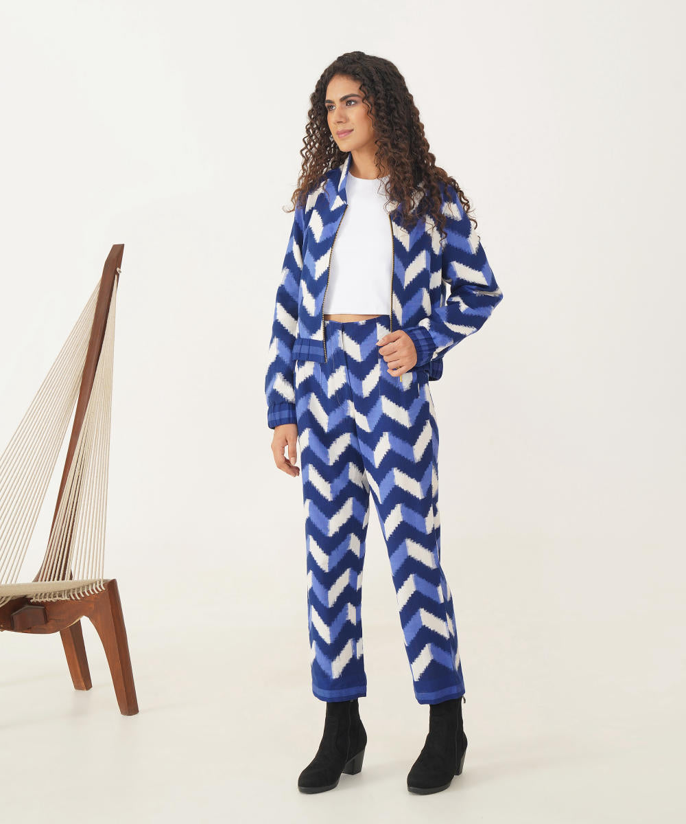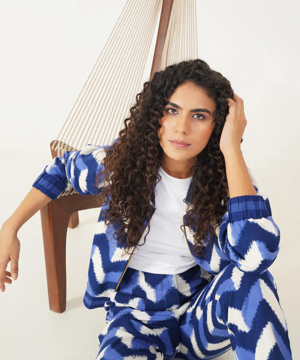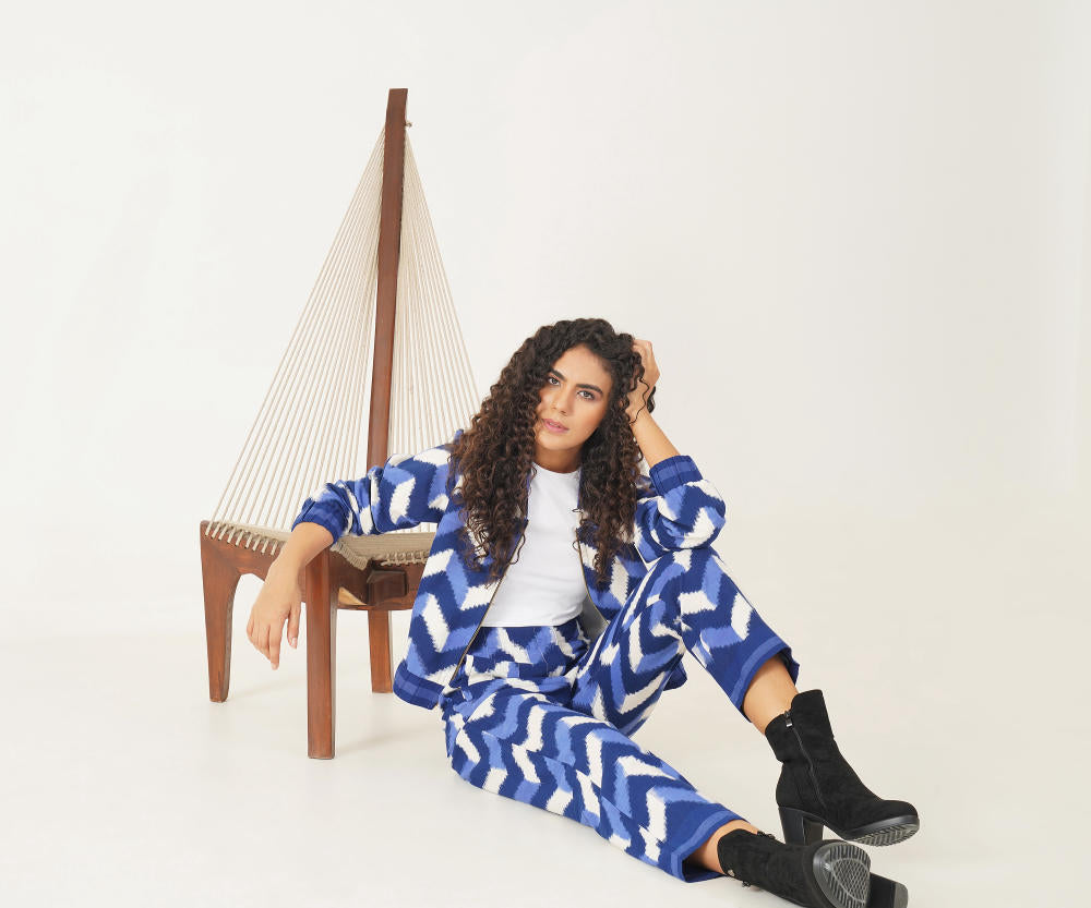 Stunning bomber jacket and trouser set is meticulously handcrafted by master Indian artisans, featuring a striking chevron pattern in deep, rich blues and crisp whites. The bomber jacket boasts a chic, cropped silhouette that flows seamlessly with the expertly tailored trousers, creating a look that blends traditional craftsmanship with contemporary fashion. Perfect for both casual outings and elevated events, this ensemble adds a unique, artisanal flair to any wardrobe—making it a timeless yet trendy statement piece.