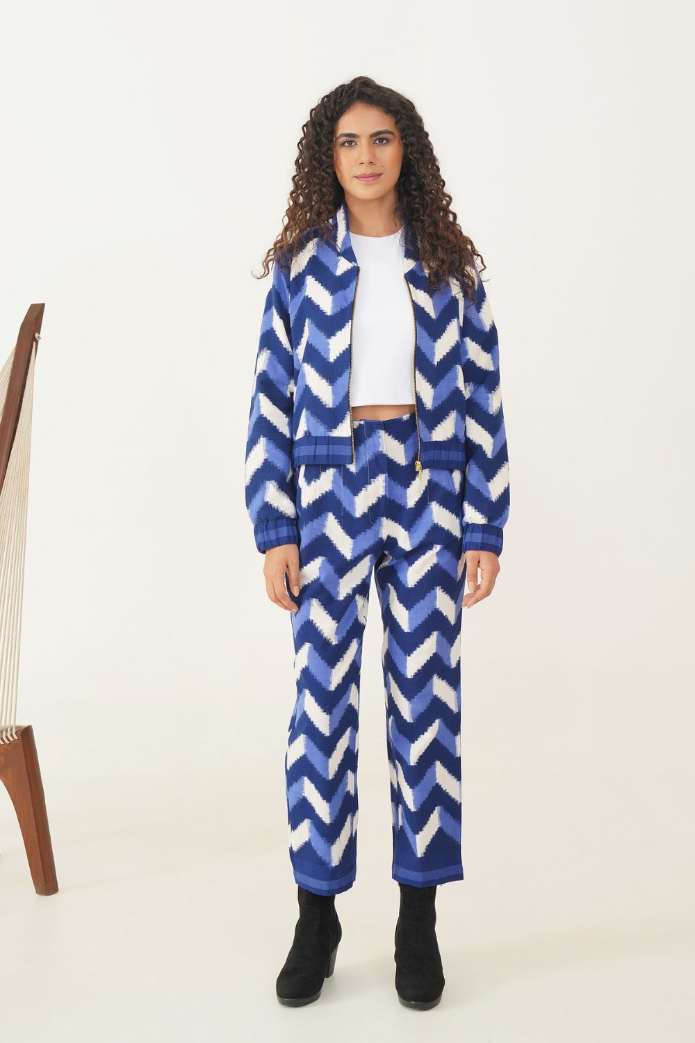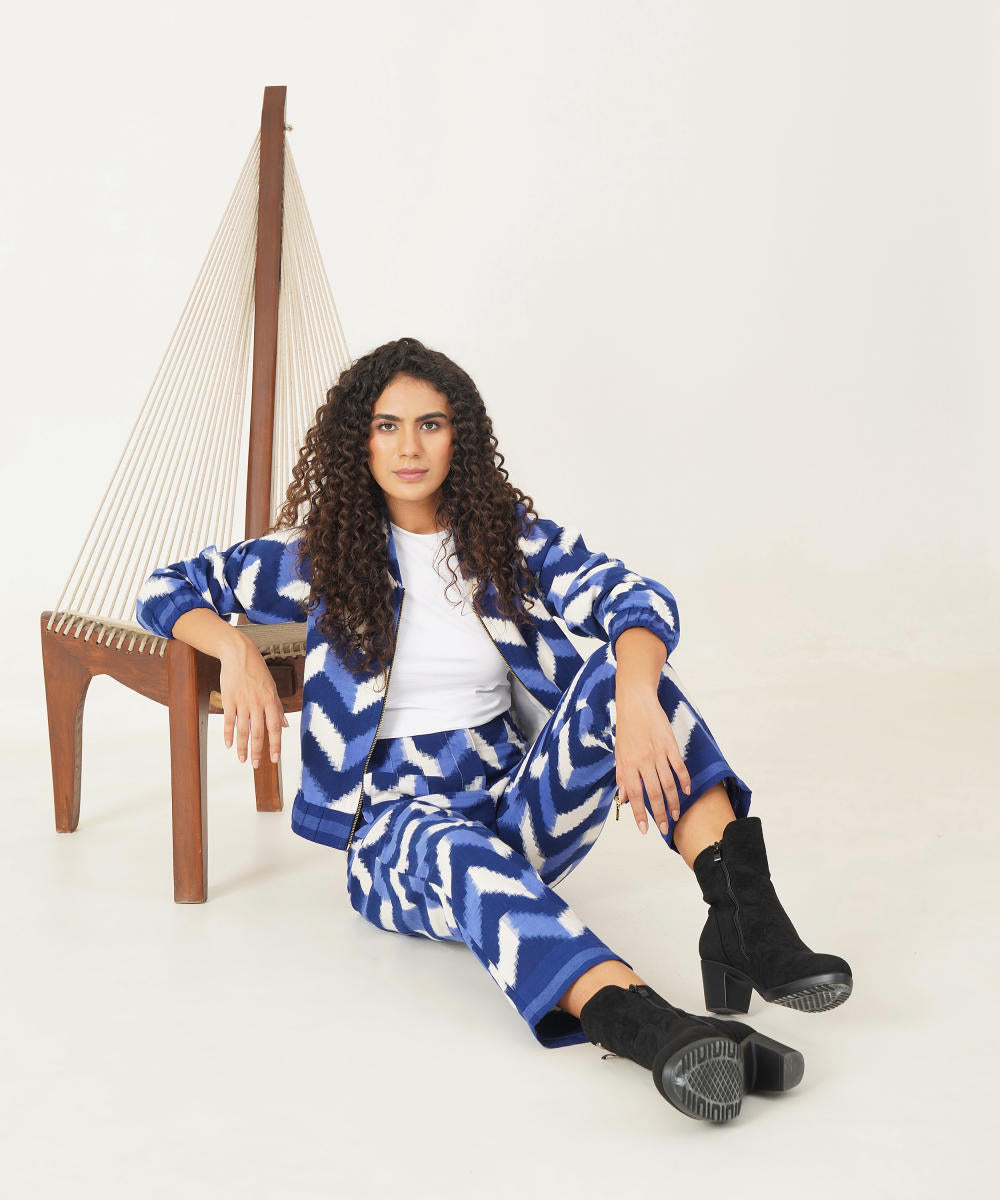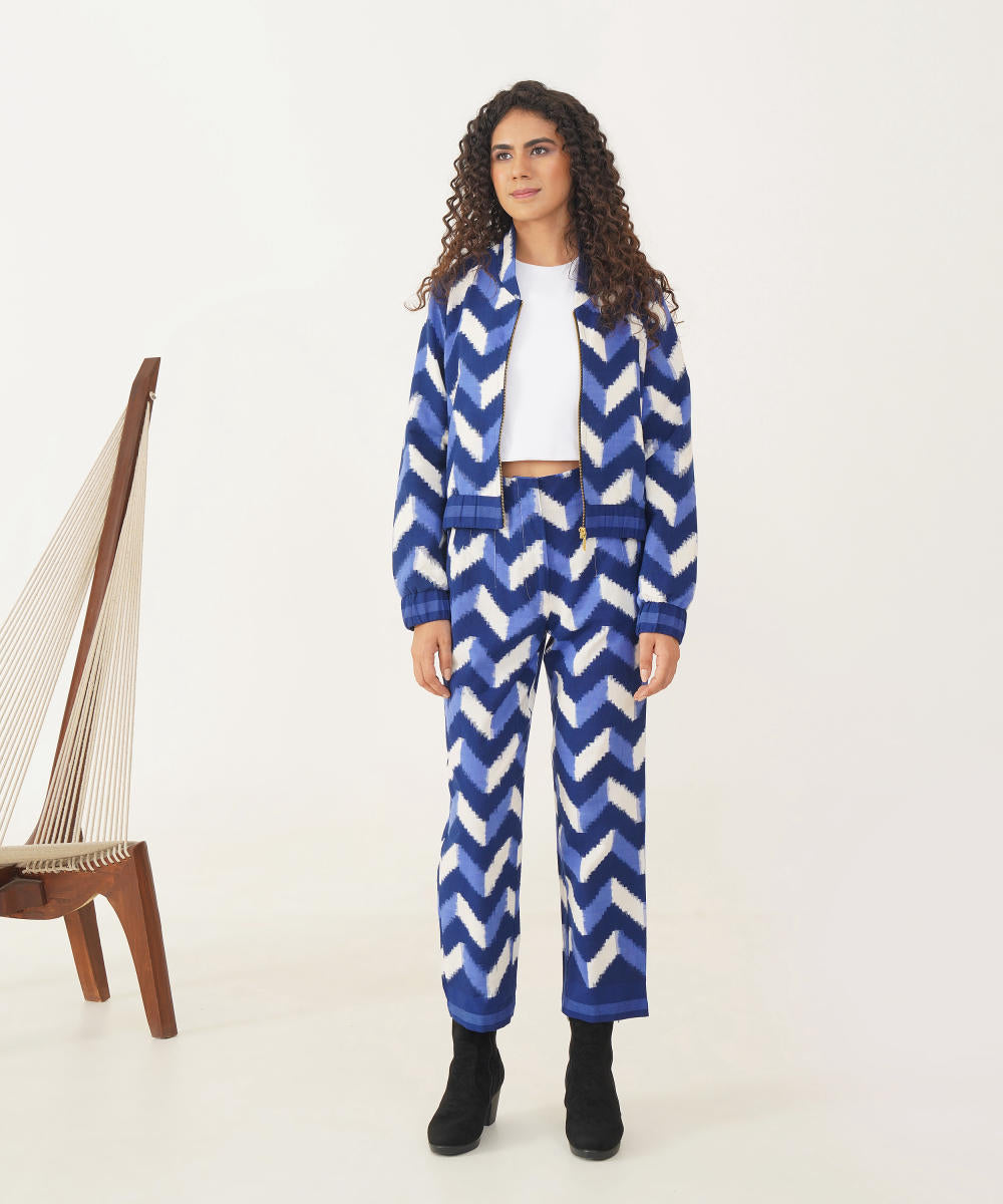 Stunning bomber jacket and trouser set is meticulously handcrafted by master Indian artisans, featuring a striking chevron pattern in deep, rich blues and crisp whites. The bomber jacket boasts a chic, cropped silhouette that flows seamlessly with the expertly tailored trousers, creating a look that blends traditional craftsmanship with contemporary fashion. Perfect for both casual outings and elevated events, this ensemble adds a unique, artisanal flair to any wardrobe—making it a timeless yet trendy statement piece.