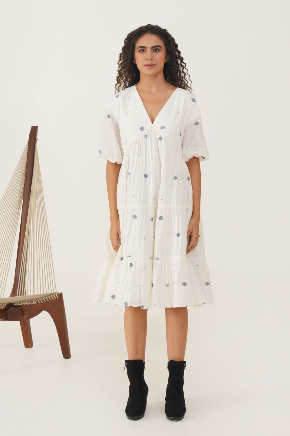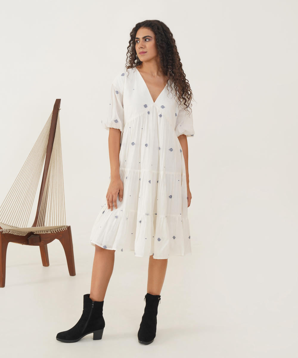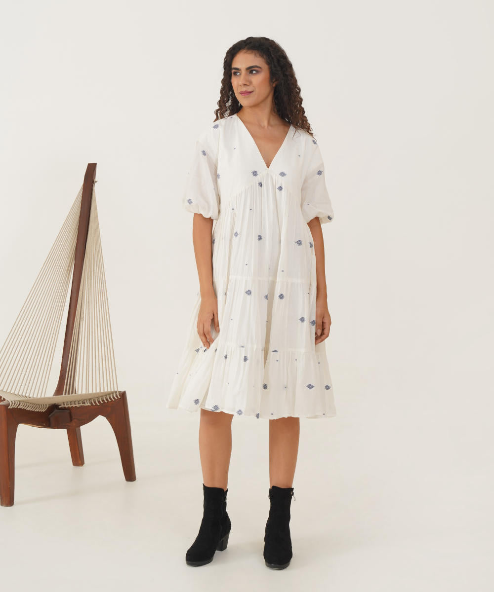 A timeless Jamdani dress designed with comfort and effortless movement in mind. This versatile piece showcases a plunging V-neckline, relaxed drop shoulders, and airy bubble sleeves that create a beautiful sense of flow. Delicate gathers add a playful touch of volume, making this dress a perfect blend of elegance and ease.