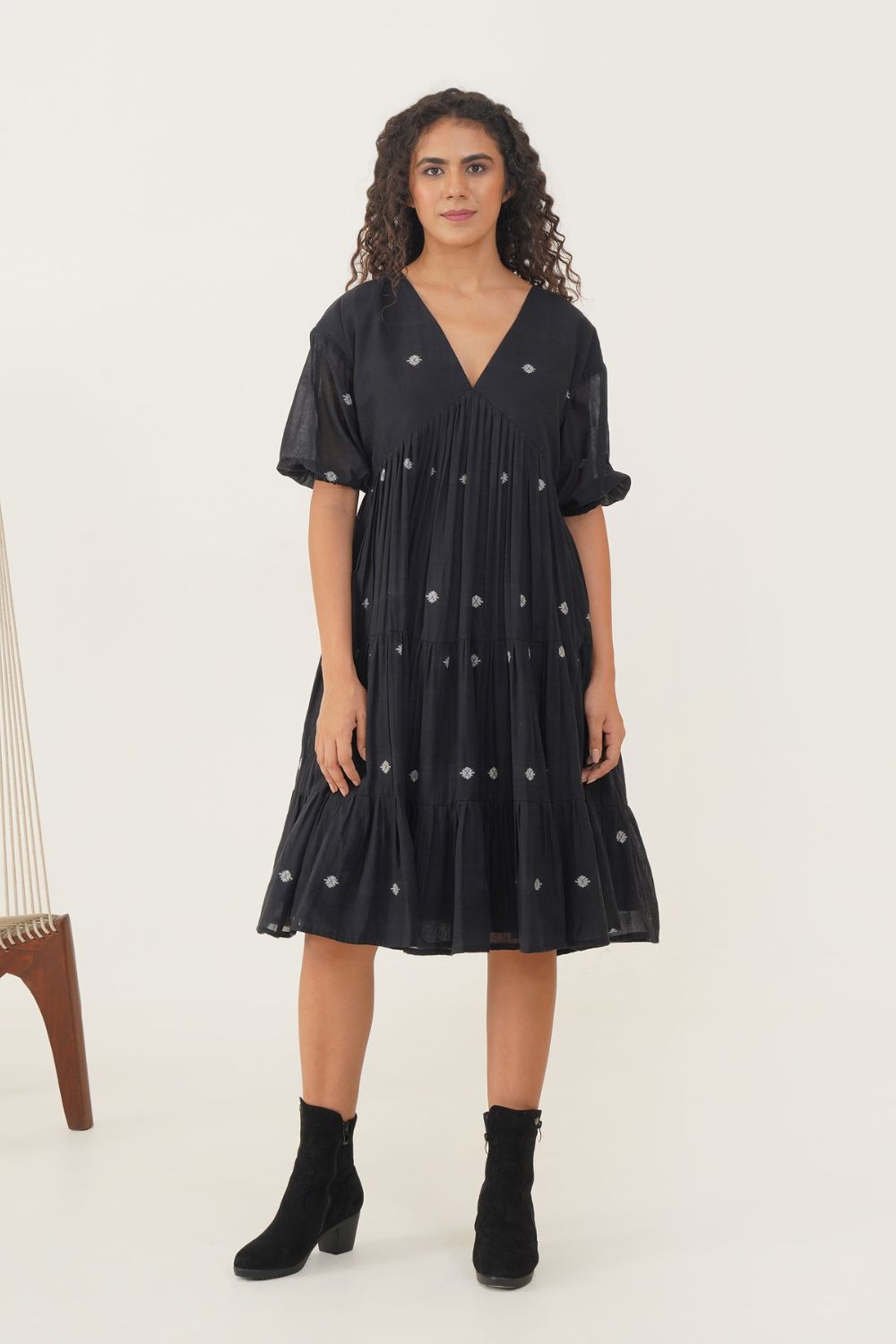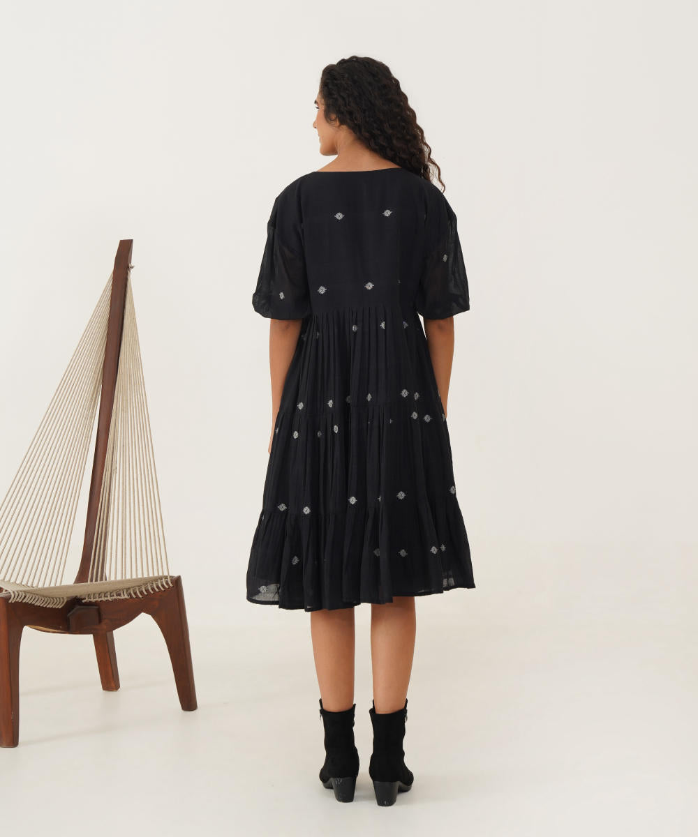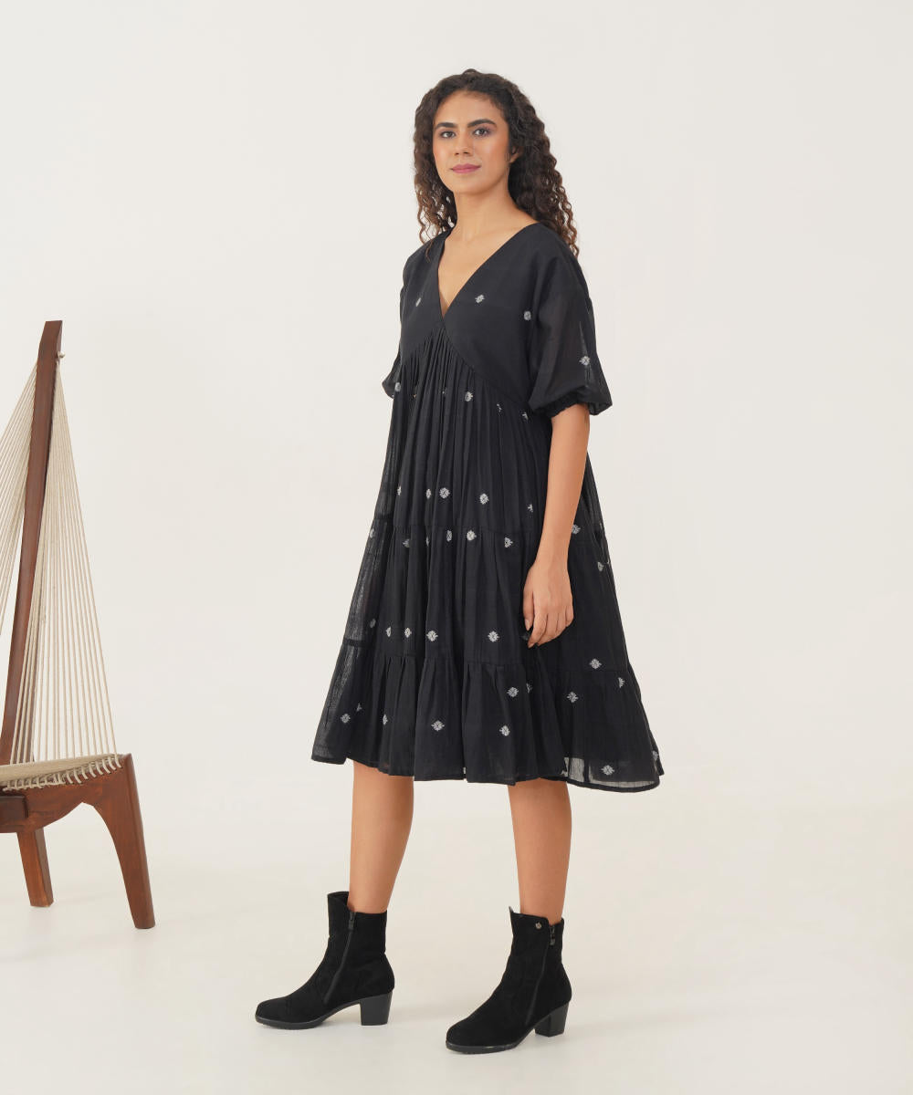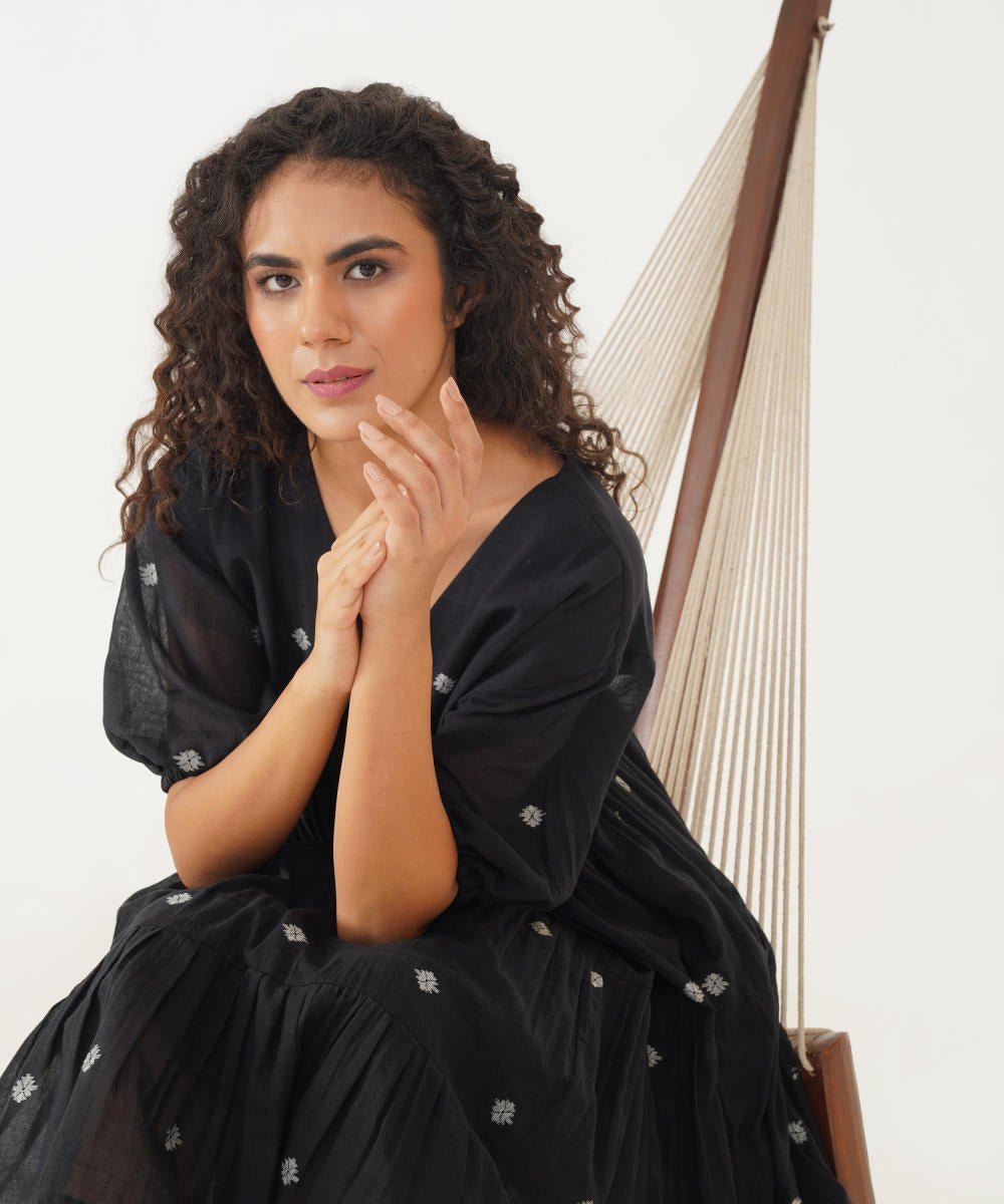 A refined Jamdani dress crafted for ultimate comfort and effortless grace, featuring a plunging V-neckline that adds a hint of allure. The relaxed drop shoulders and voluminous bubble sleeves create a soft, flowing silhouette, while delicate gathers bring a playful touch of volume. Designed with ease and movement in mind, this classic piece perfectly balances elegance and relaxed charm.