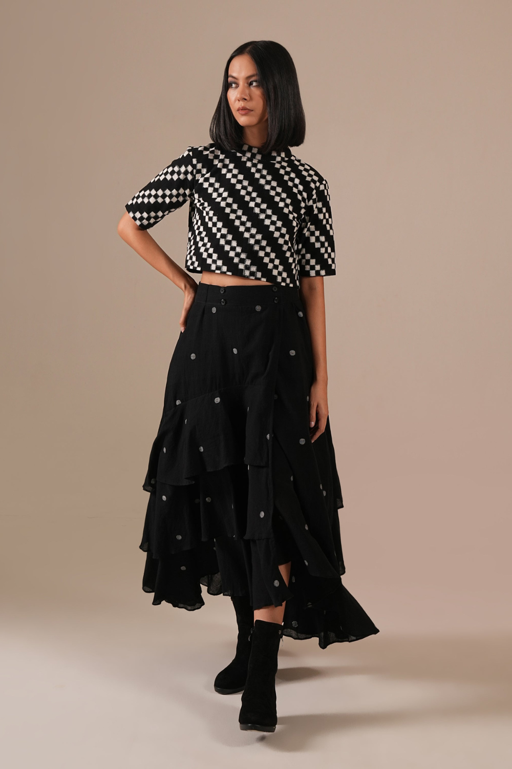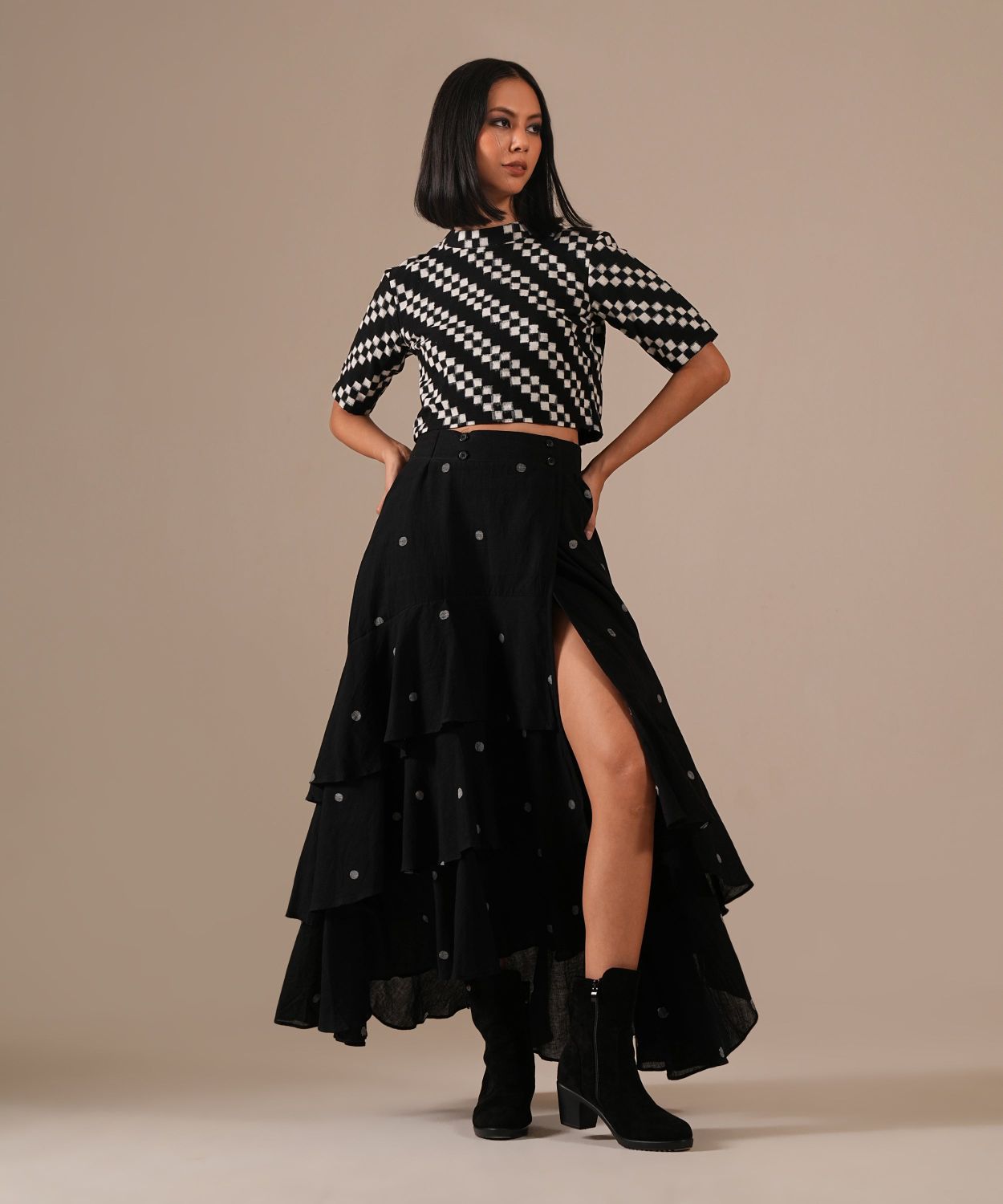 An exquisite amalgamation of handwoven Ikat blouse (stand collar, back zipper) and a layered Jamdani wrap skirt with a soft ruffled hem. A celebration of textile artistry that is striking yet timeless.