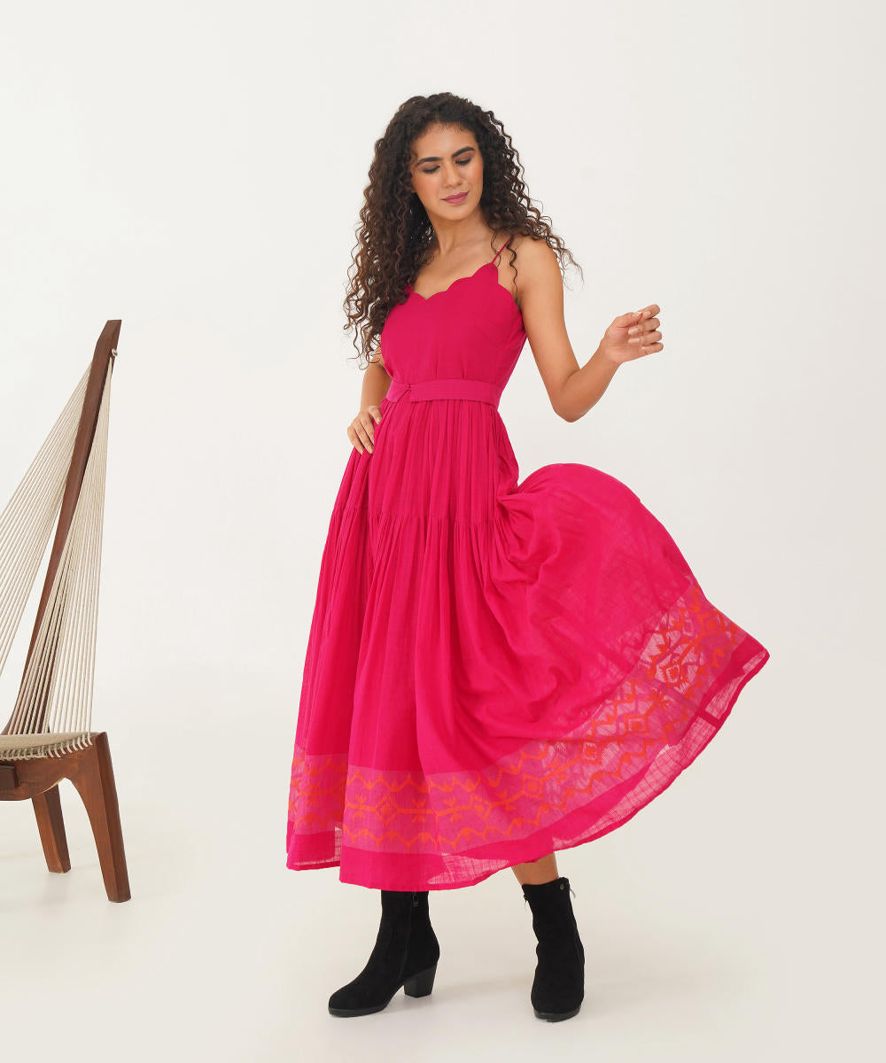 A timeless Jamdani dress featuring a delicate scallop neckline and graceful noodle straps, complemented by soft gathers that add a touch of elegance. The dress is tailored to perfection with a discreet back zipper fastening for a sleek silhouette. Handcrafted by skilled Indian artisans, this exquisite piece also includes convenient side pockets and a coordinating Jamdani belt, offering both style and practicality in one beautifully crafted dress.