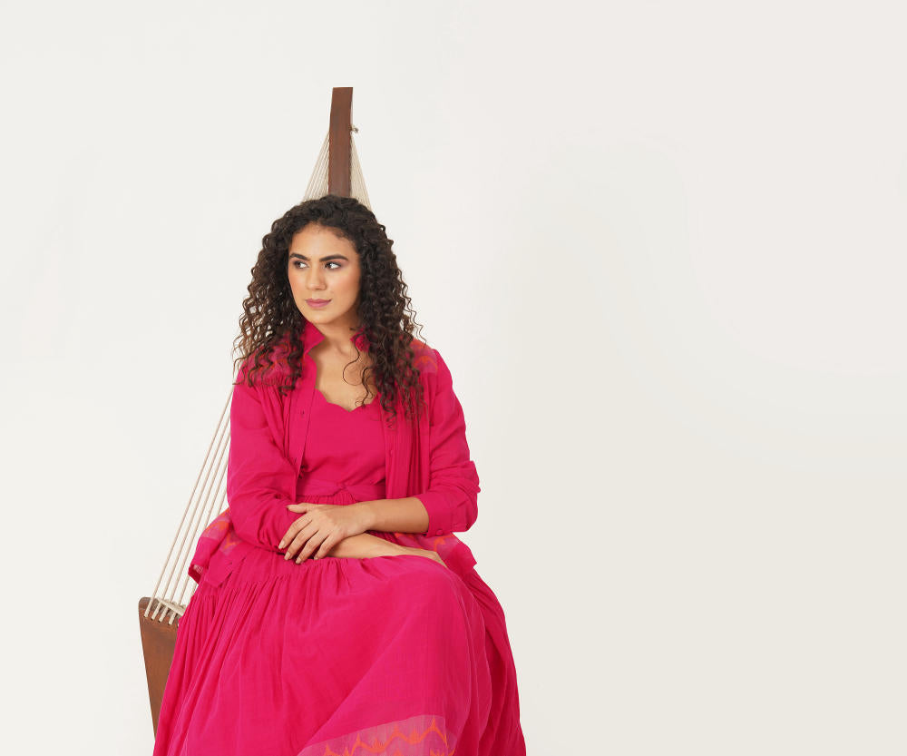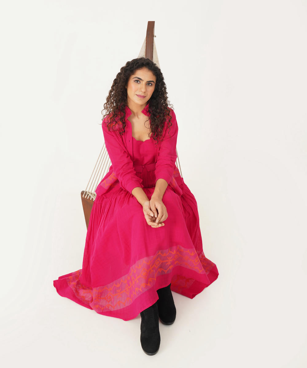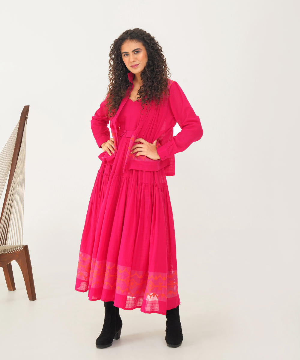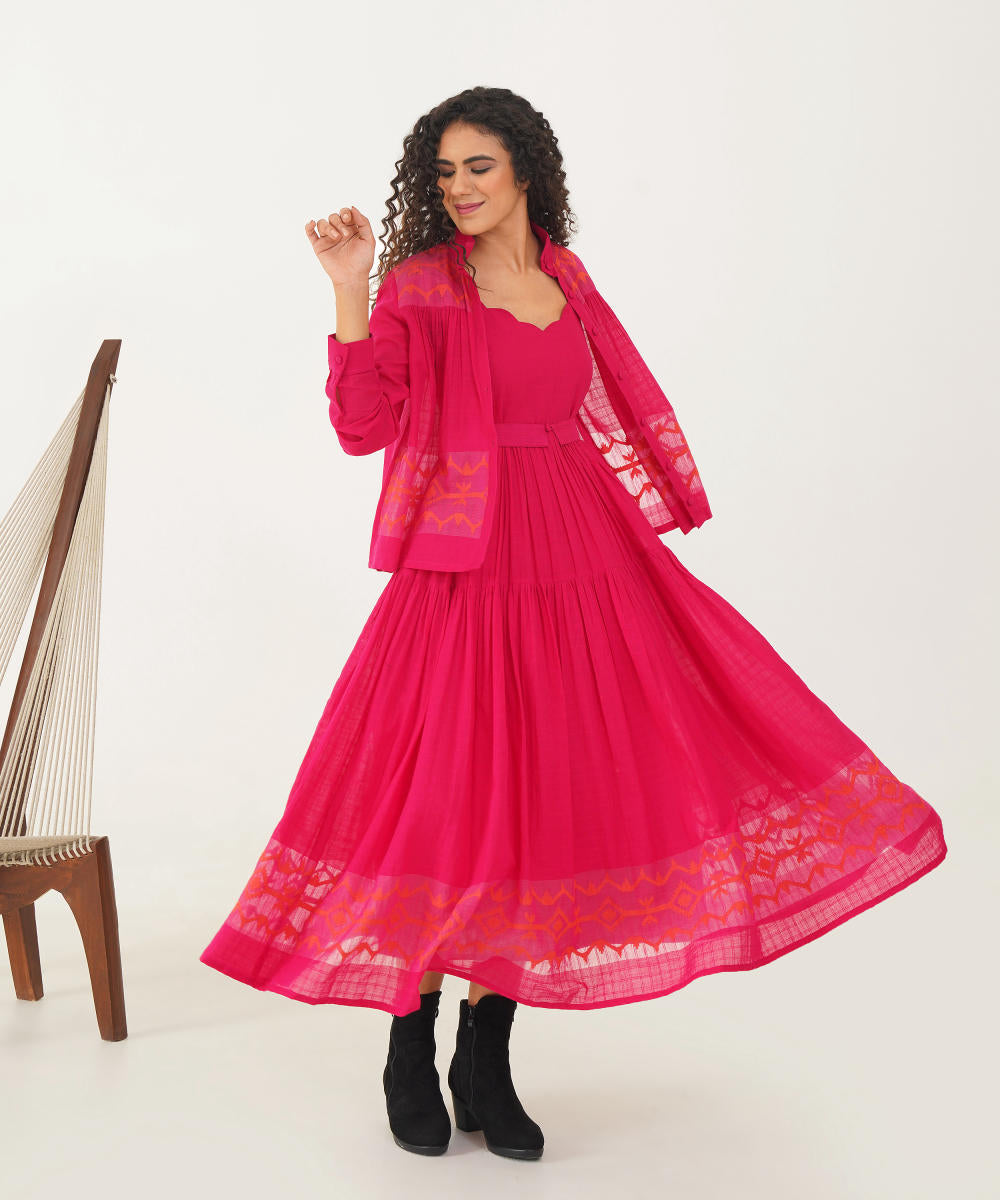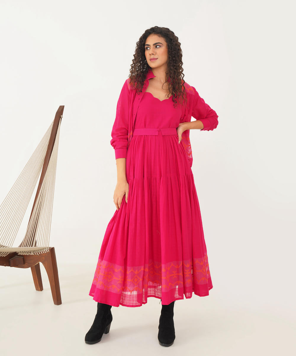 An exquisite Jamdani ensemble blending tradition with modern sophistication. The set features a scallop-neck dress adorned with delicate noodle straps and gentle gathers that create a soft, flowing silhouette. A discreet back zipper ensures a flawless fit, while practical side pockets offer added convenience. Accompanying the dress is a versatile high-collar Jamdani shirt that doubles as a stylish overlay, allowing for endless styling possibilities. Handcrafted with meticulous care by Indian artisans, the ensemble is completed with a matching Jamdani belt for an effortlessly elegant look.
