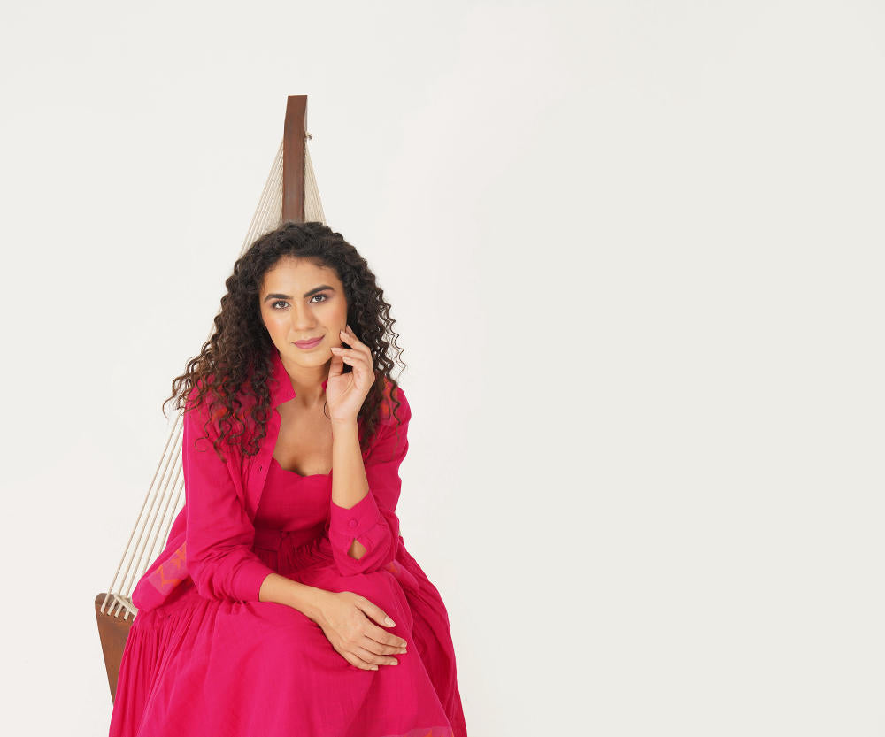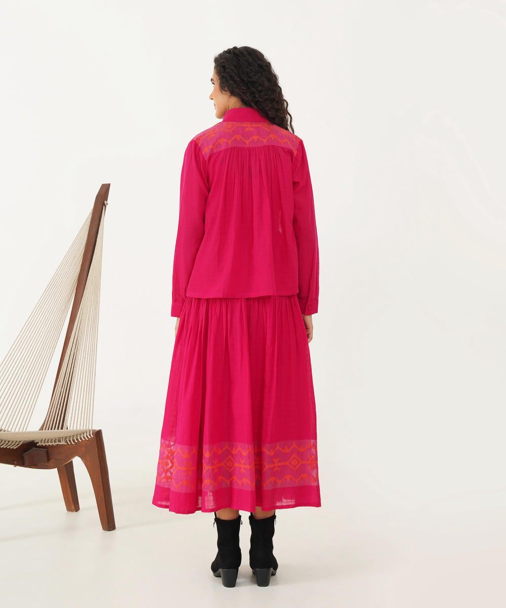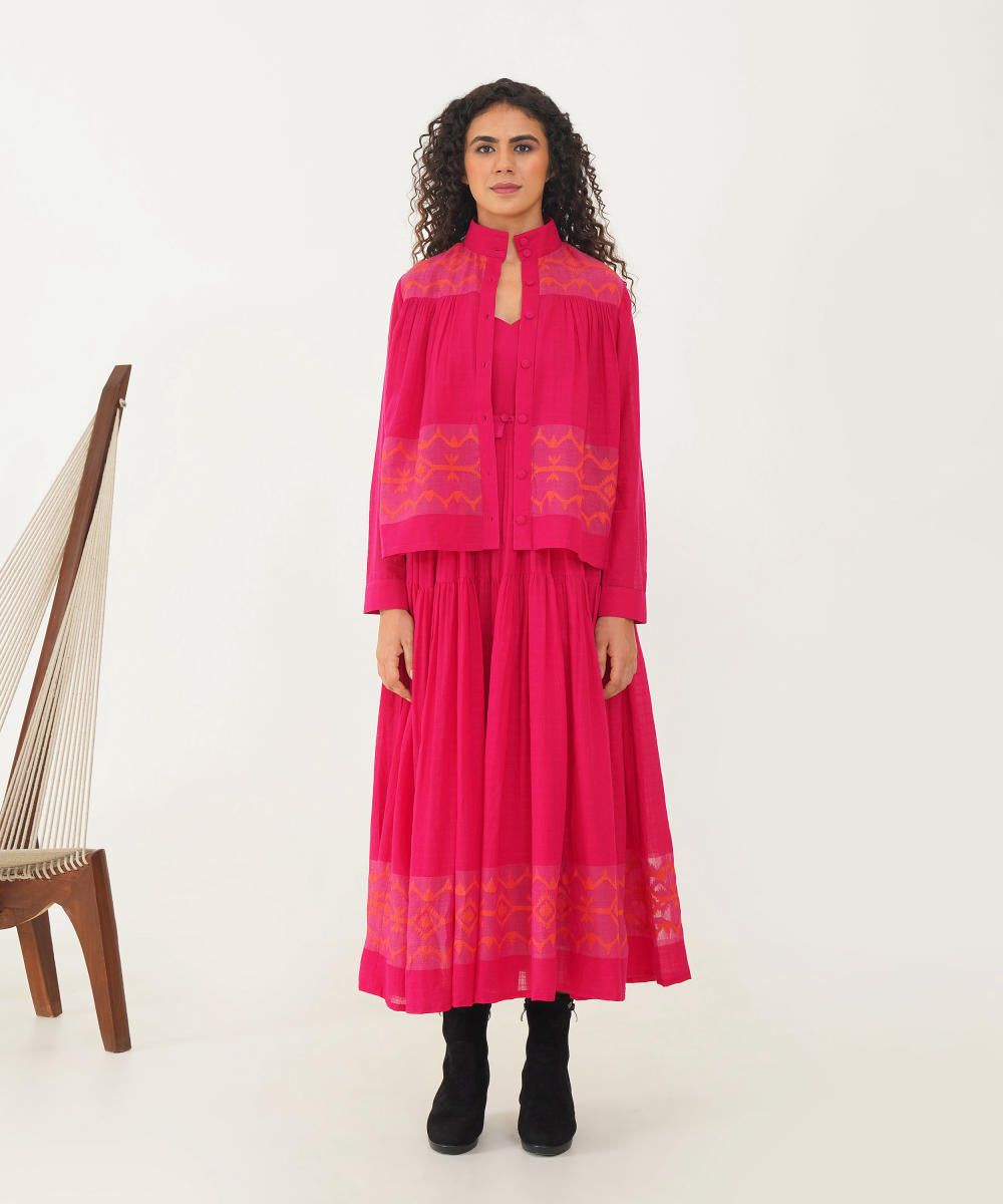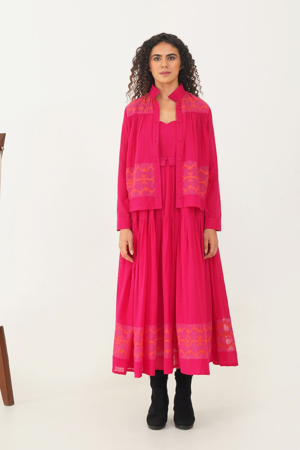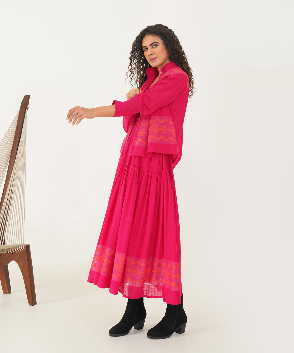 An exquisite Jamdani ensemble blending tradition with modern sophistication. The set features a scallop-neck dress adorned with delicate noodle straps and gentle gathers that create a soft, flowing silhouette. A discreet back zipper ensures a flawless fit, while practical side pockets offer added convenience. Accompanying the dress is a versatile high-collar Jamdani shirt that doubles as a stylish overlay, allowing for endless styling possibilities. Handcrafted with meticulous care by Indian artisans, the ensemble is completed with a matching Jamdani belt for an effortlessly elegant look.