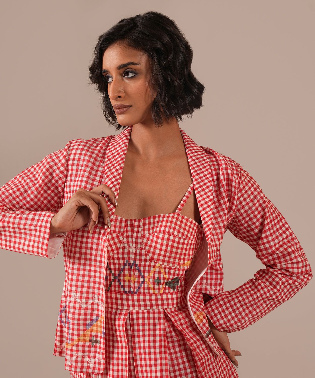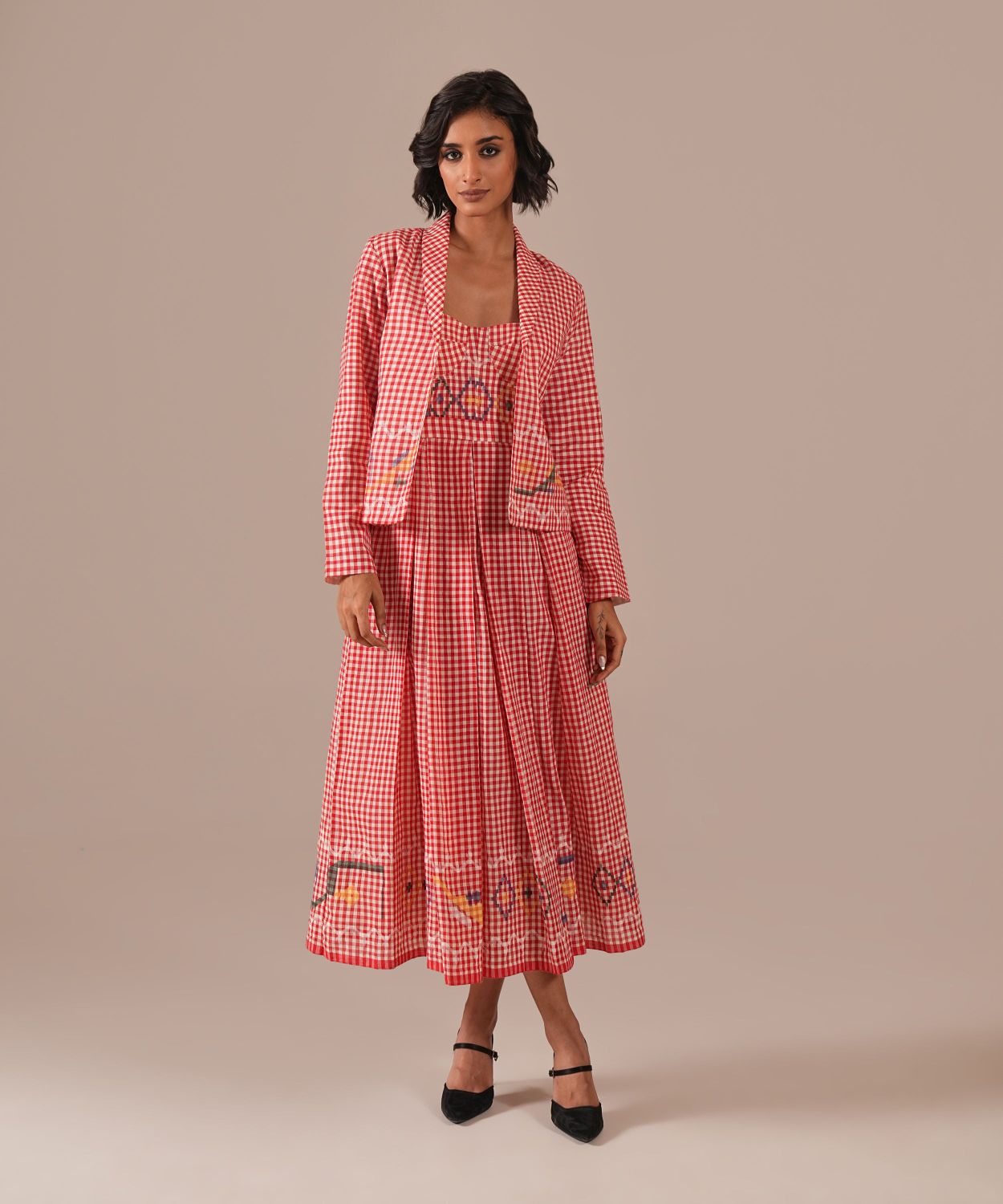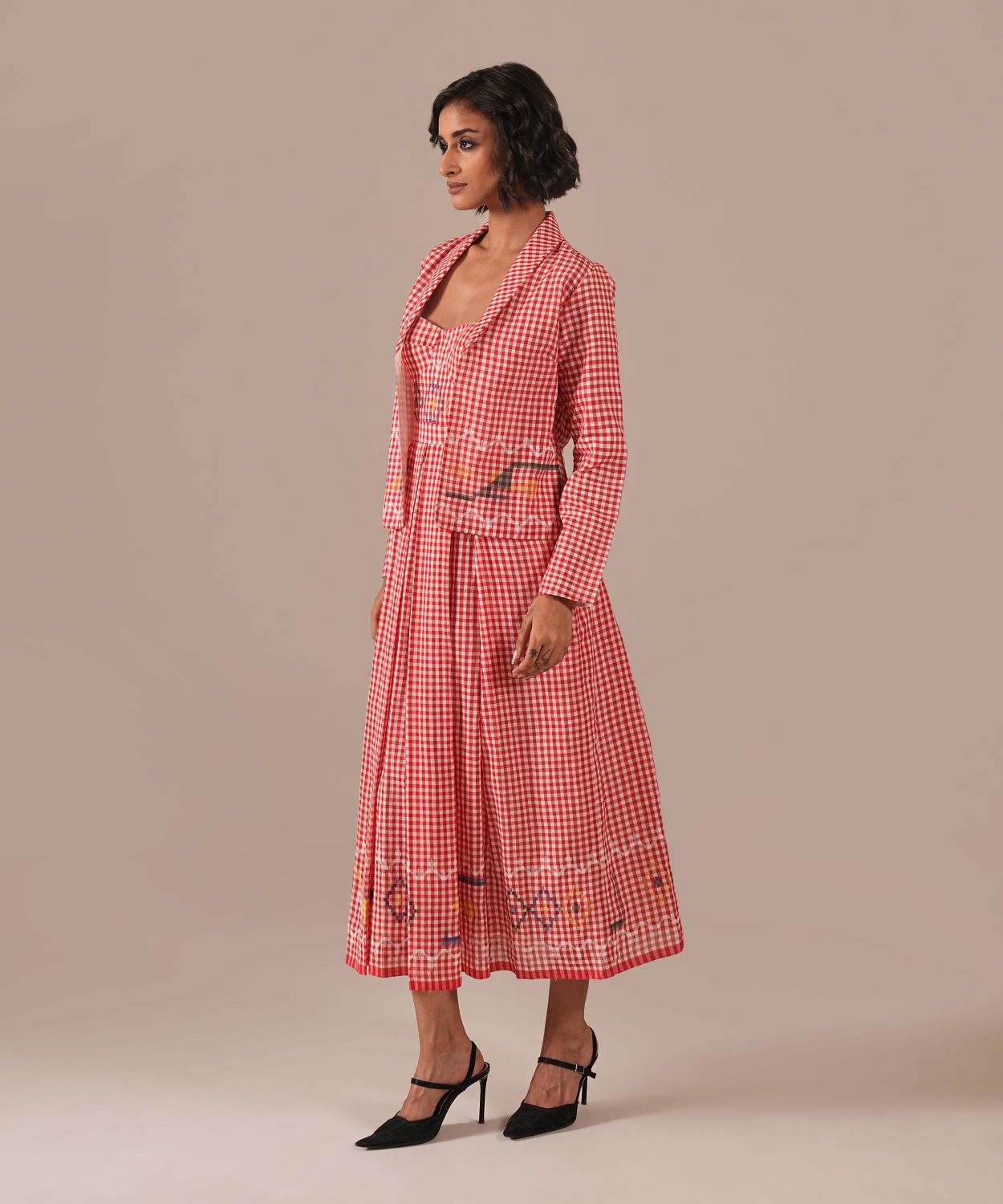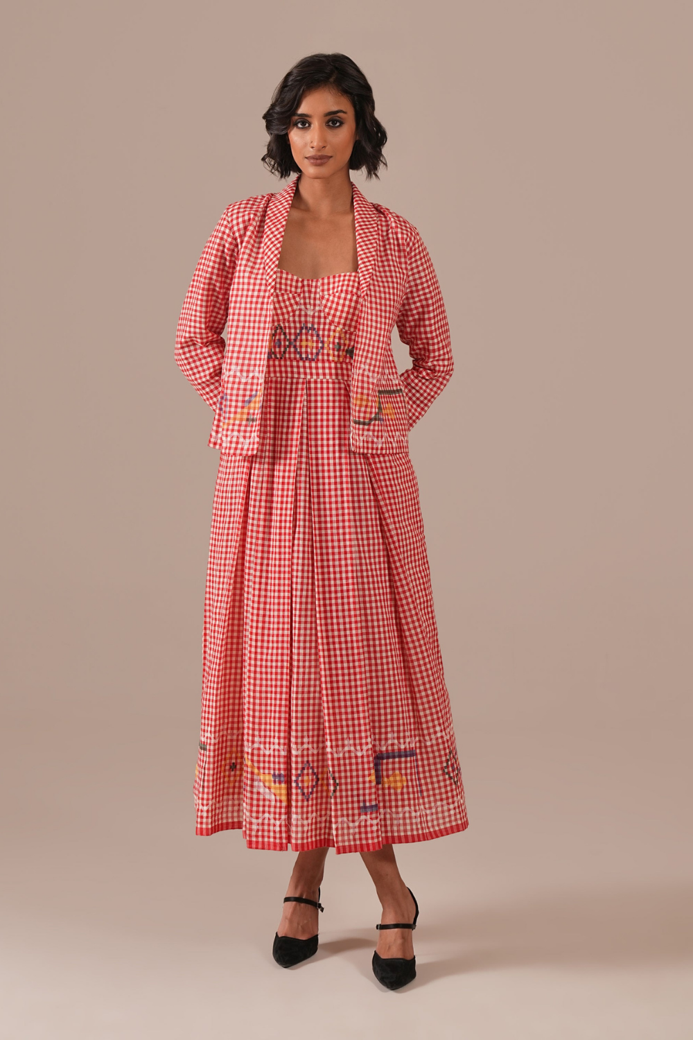 Discover our Jamdani Bralette Dress paired with a tailored co-ord jacket, meticulously handwoven by skilled artisans. Featuring elegant box pleats, functional side pockets, and adjustable straps for a perfect fit, this ensemble effortlessly combines traditional craftsmanship with contemporary style, offering versatile, timeless elegance for any wardrobe.
