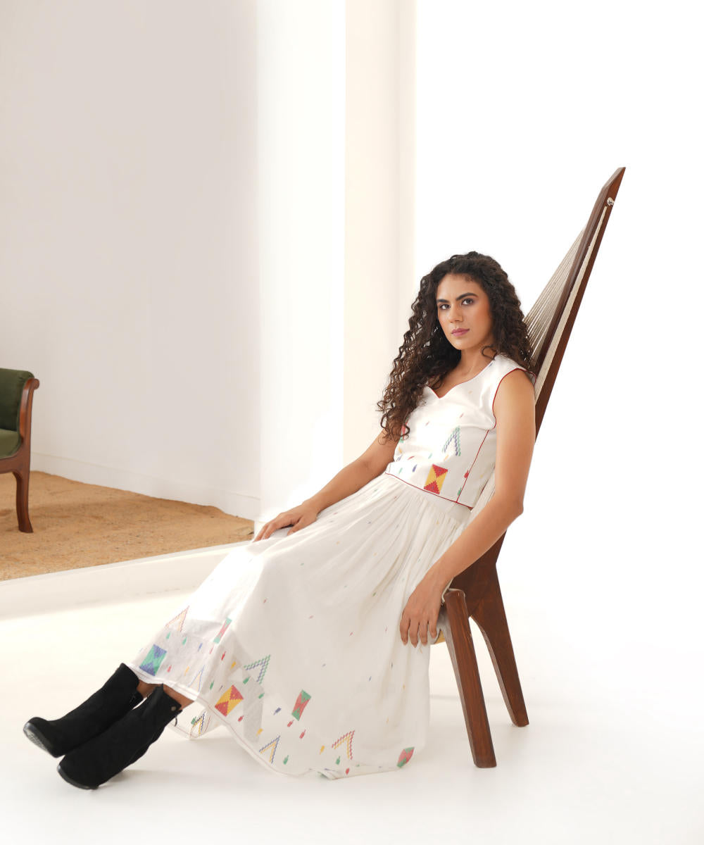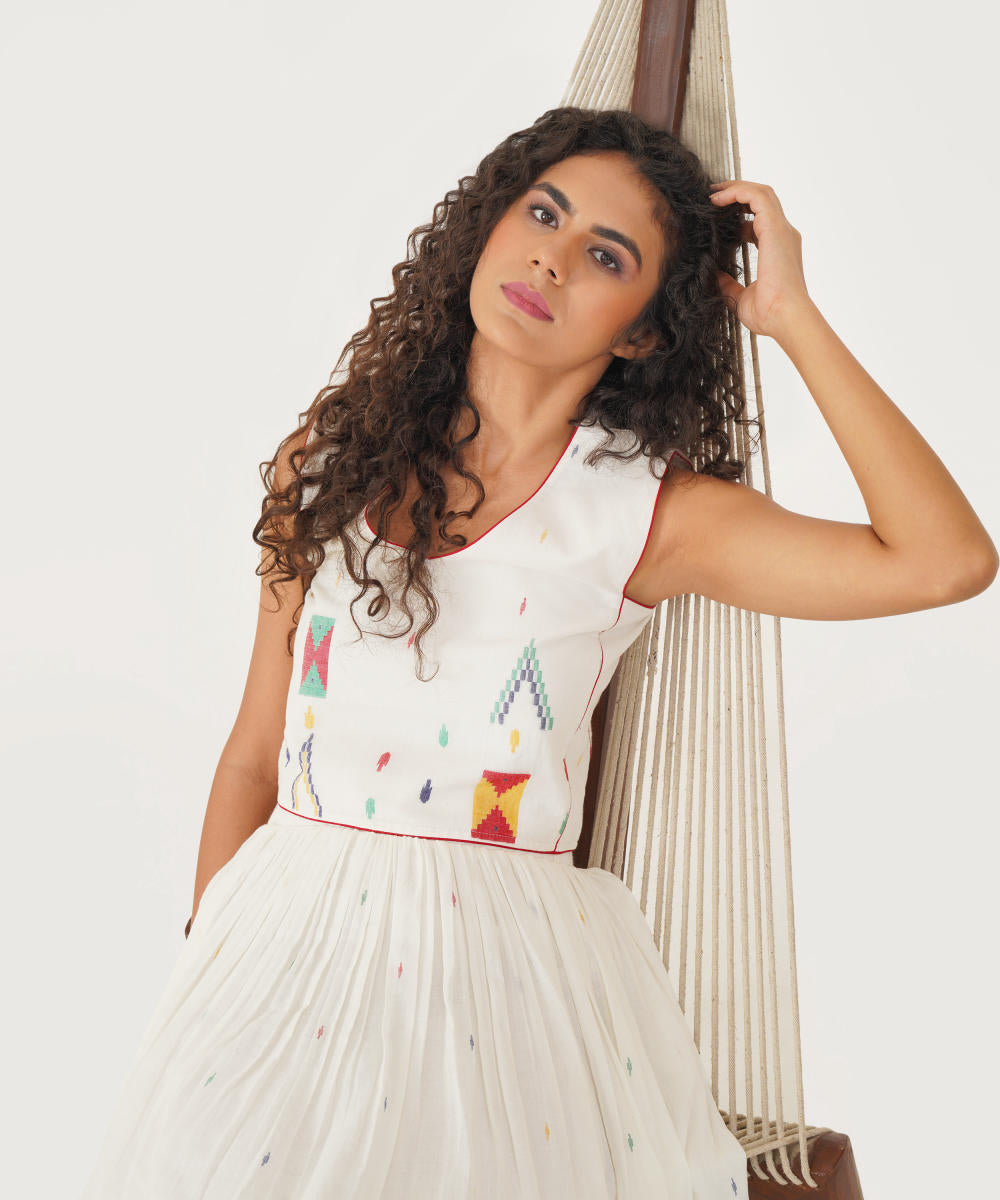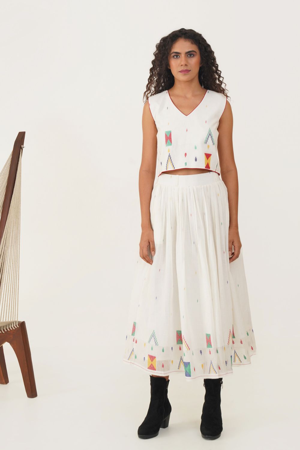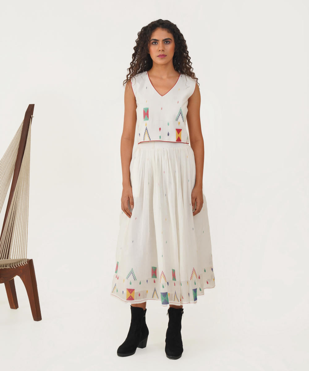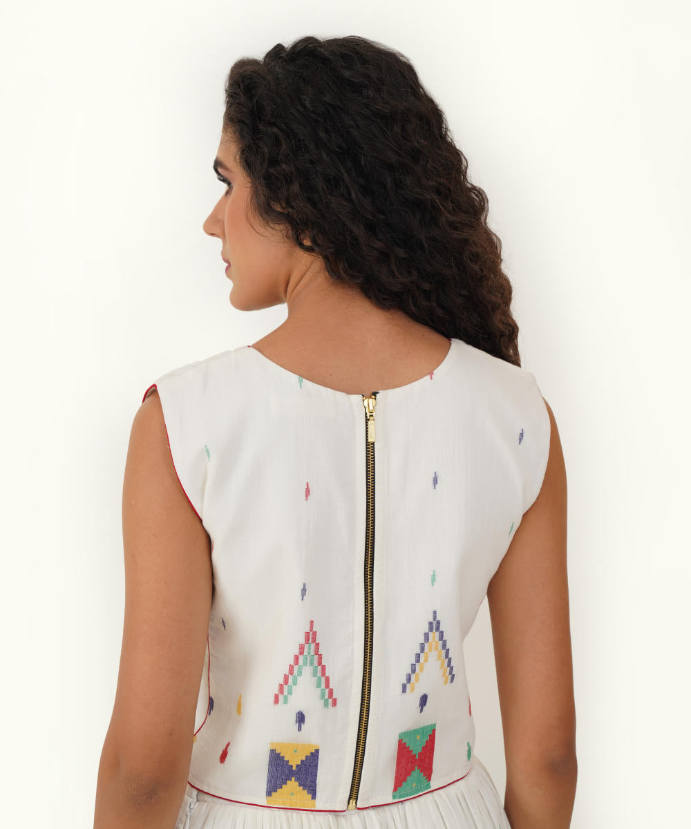 A stunning Jamdani ensemble that merges elegance with sustainability. This beautiful set features a delicately gathered skirt with convenient side pockets, offering both style and practicality. The coordinating top is enhanced with striking contrast piping detailing, and the back zipper closure adds a modern touch. Thoughtfully crafted with sustainability in mind, this ensemble is a perfect addition to a mindful wardrobe, combining timeless design with eco-conscious appeal.
