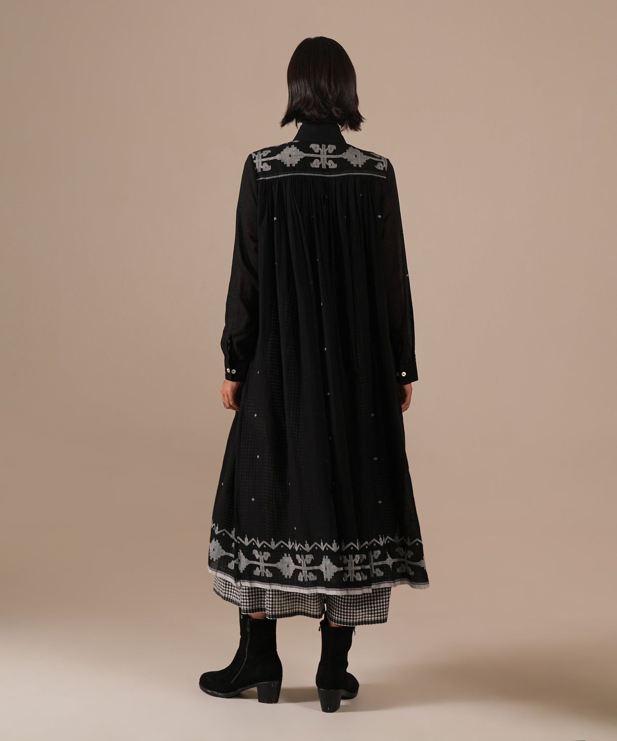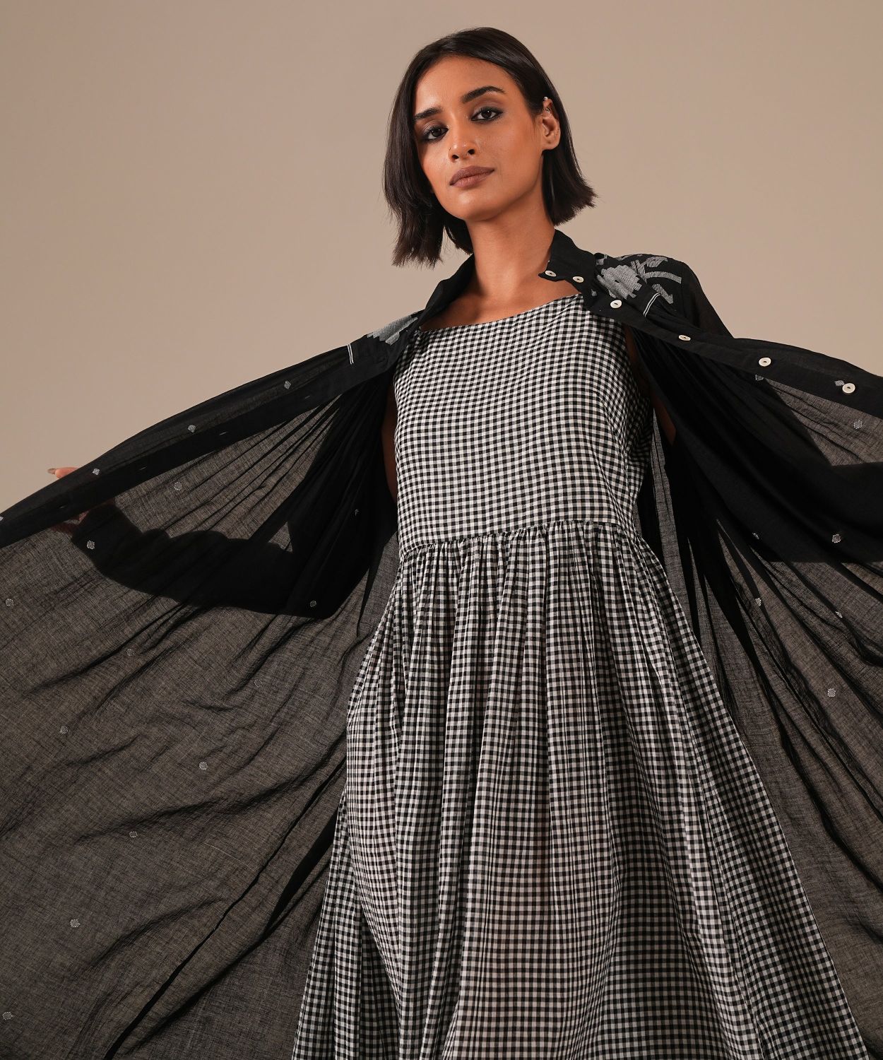 A classic gathered dress with high collar neck, front button fastening, full sleeves and gentle front/back pleats, paired with a handwoven slip dress with side pockets.