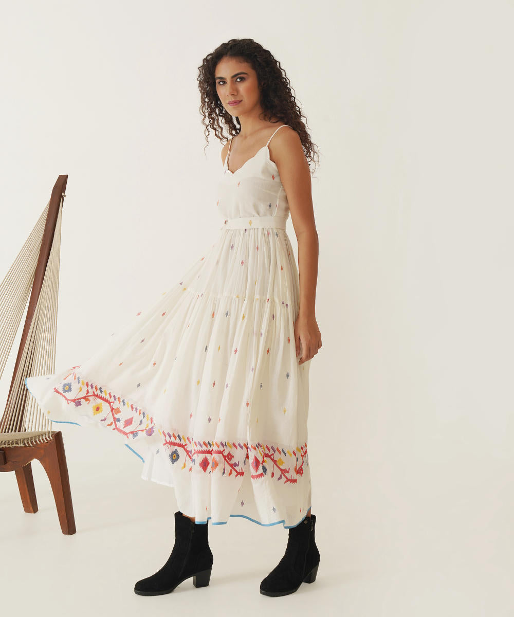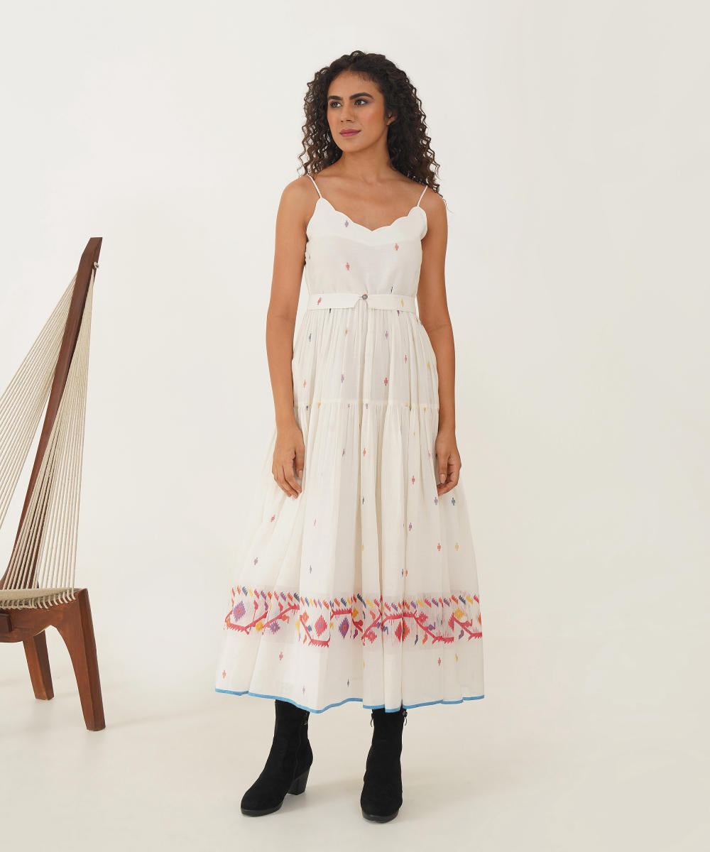 An elegant Jamdani dress that beautifully combines classic charm with contemporary design. The dress features a delicate scallop neckline with soft gathers that cascade gracefully, enhanced by a sleek back zipper fastening for a refined fit. Handcrafted by Indian artisans, this timeless piece is designed with thoughtful details, including practical side pockets and a matching Jamdani belt that adds the perfect finishing touch. A true masterpiece of craftsmanship and style.