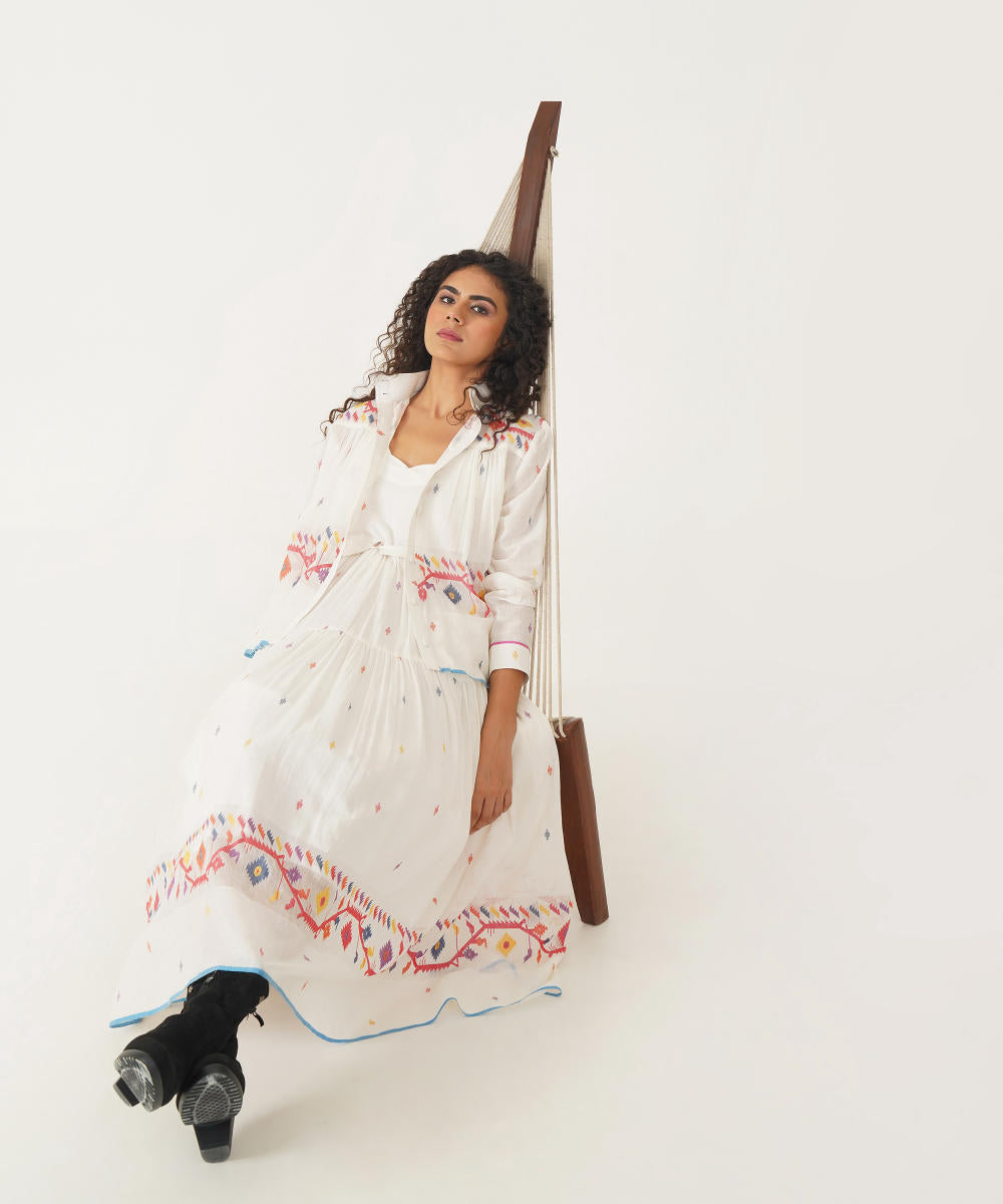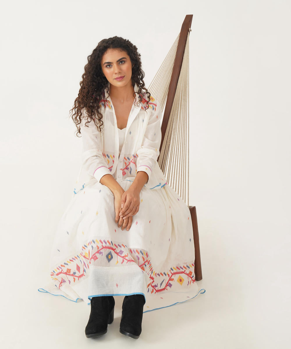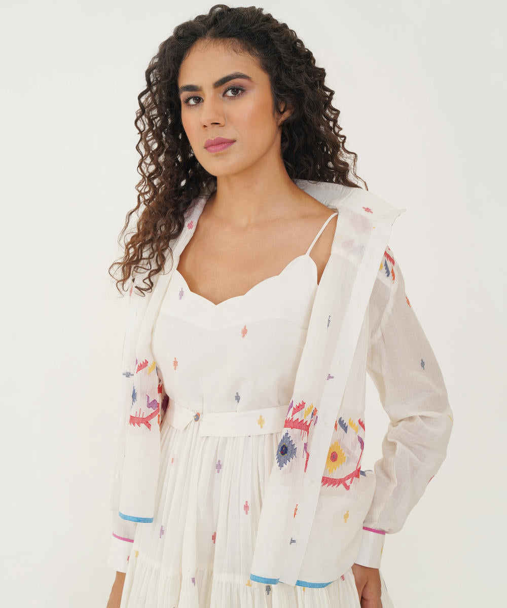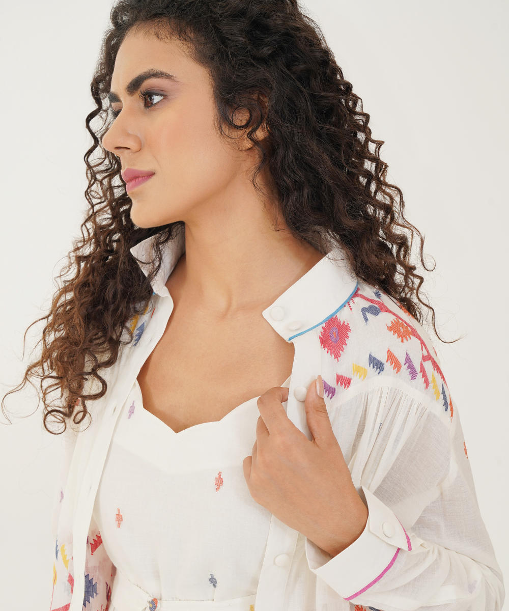 Elevate your wardrobe with our intricately handwoven button-down top, designed to double as a sophisticated overlay. The high collar and cuffed sleeves add a touch of refined elegance, while gentle gathers at both the front and back provide fluidity and ease of movement. This versatile piece beautifully merges traditional craftsmanship with modern versatility, making it a standout addition to any collection.