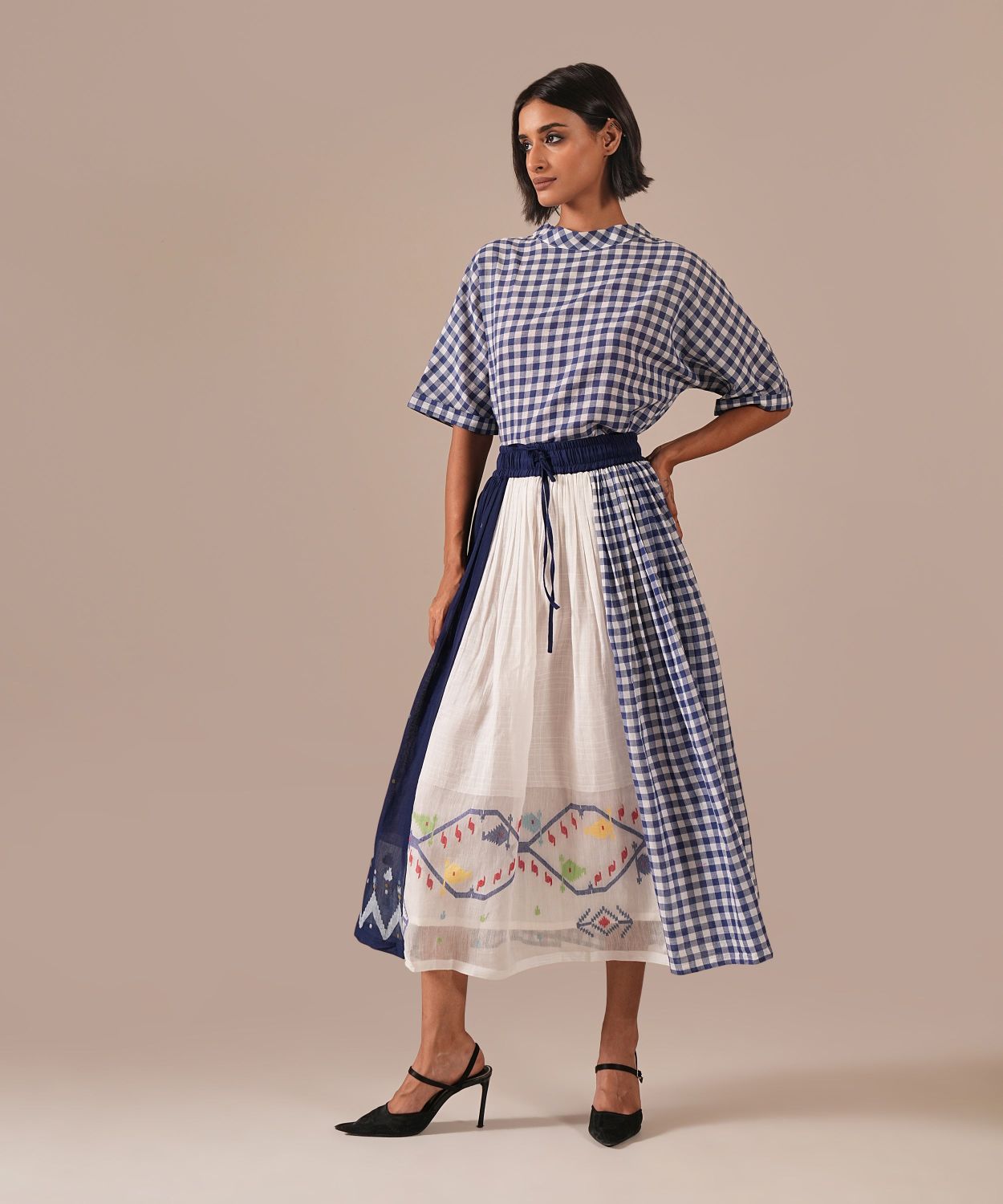 A classic Jamdani ensemble with a boxy top and a gathered skirt, accented with contrast Jamdani panel details, an elasticated waist for effortless comfort, and convenient side pockets where timeless craftsmanship meets everyday ease.