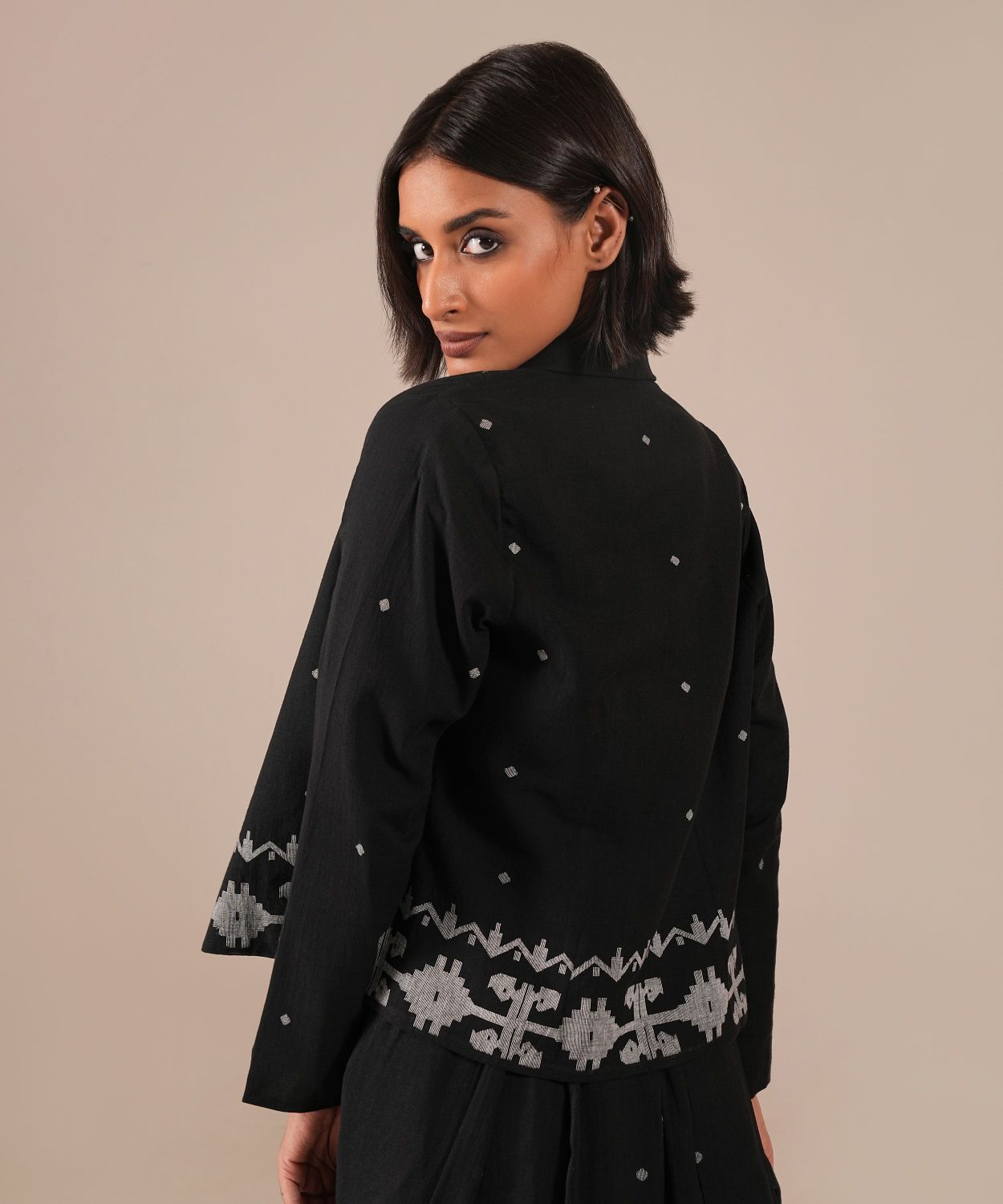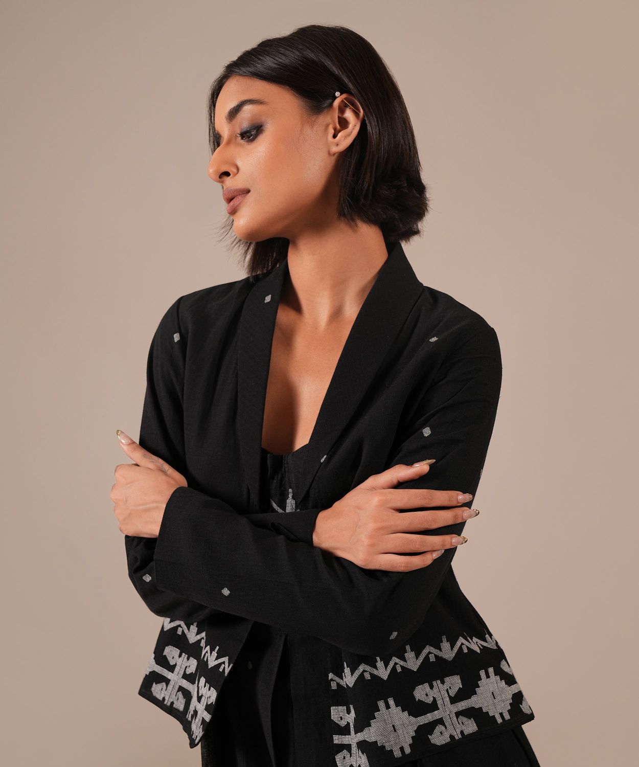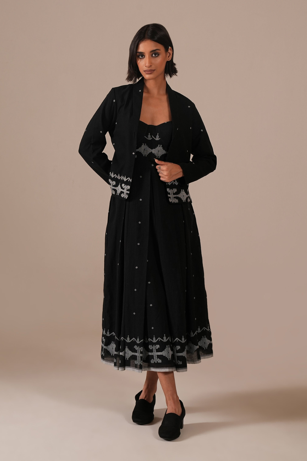 A Jamdani bralette dress with elegant box pleats, adjustable straps and side pockets, paired with a tailored co-ord jacket. Handwoven by skilled artisans, combining traditional craftsmanship with contemporary style.