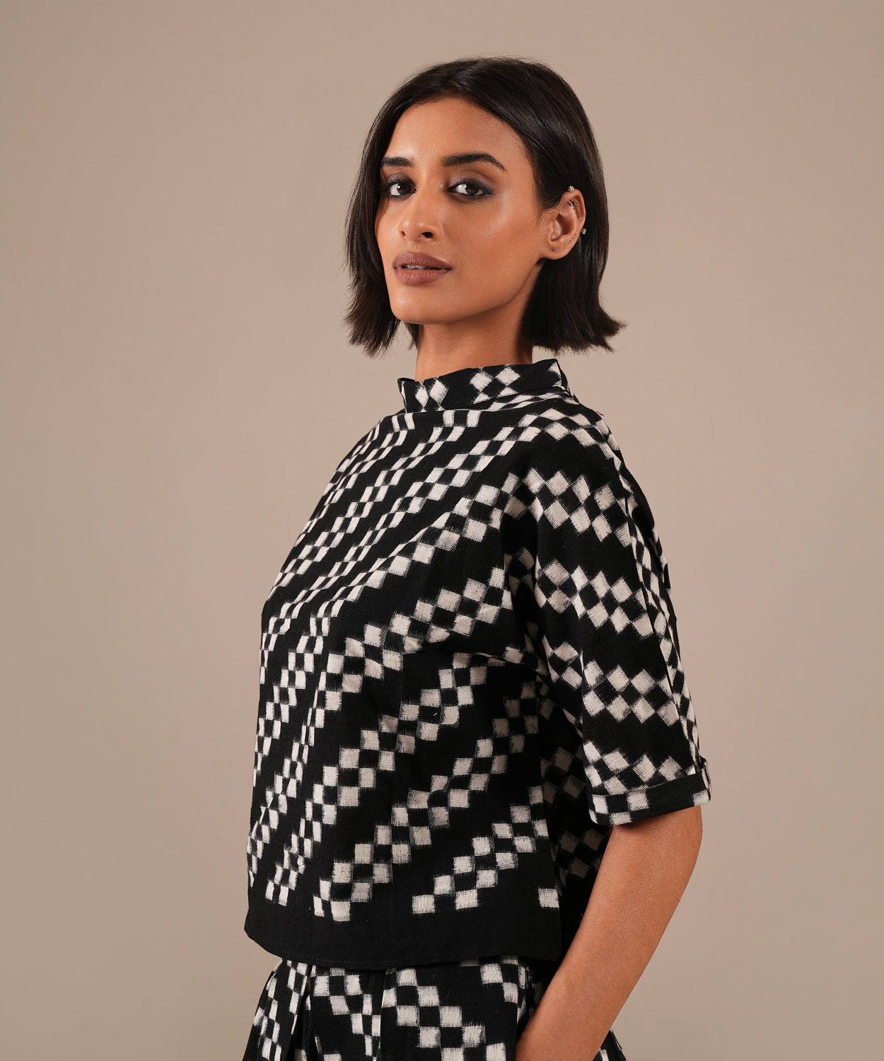 A classic Ikat co-ord set featuring a gathered skirt with side pockets and a boxy top. Handwoven by Indian artisans — a perfect choice for any wardrobe.