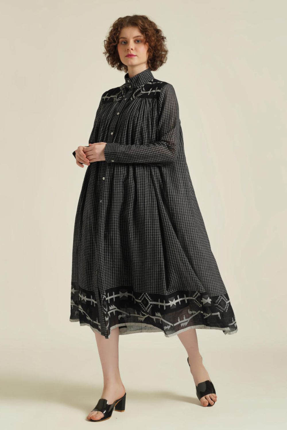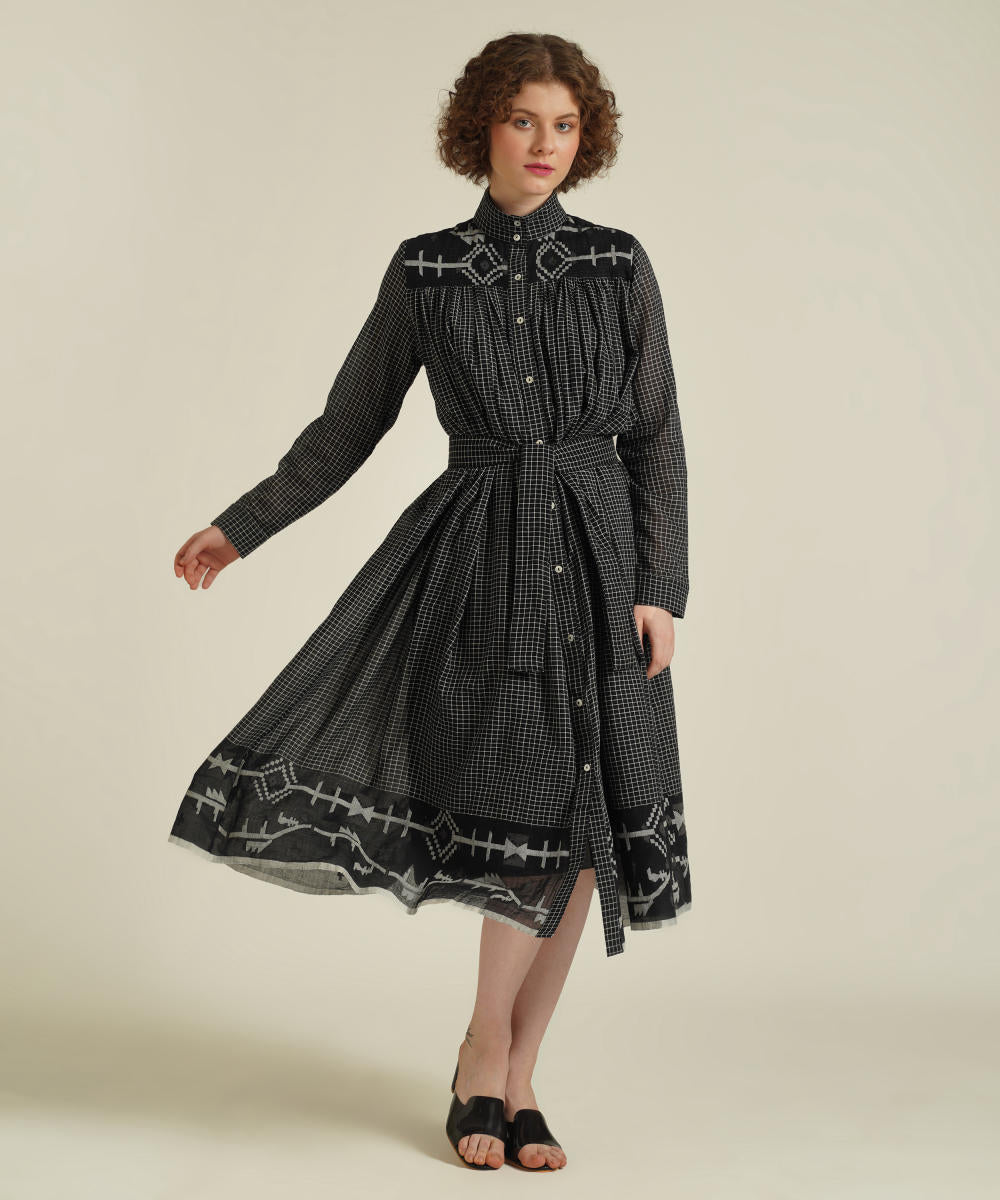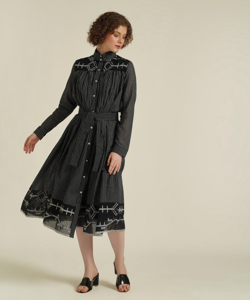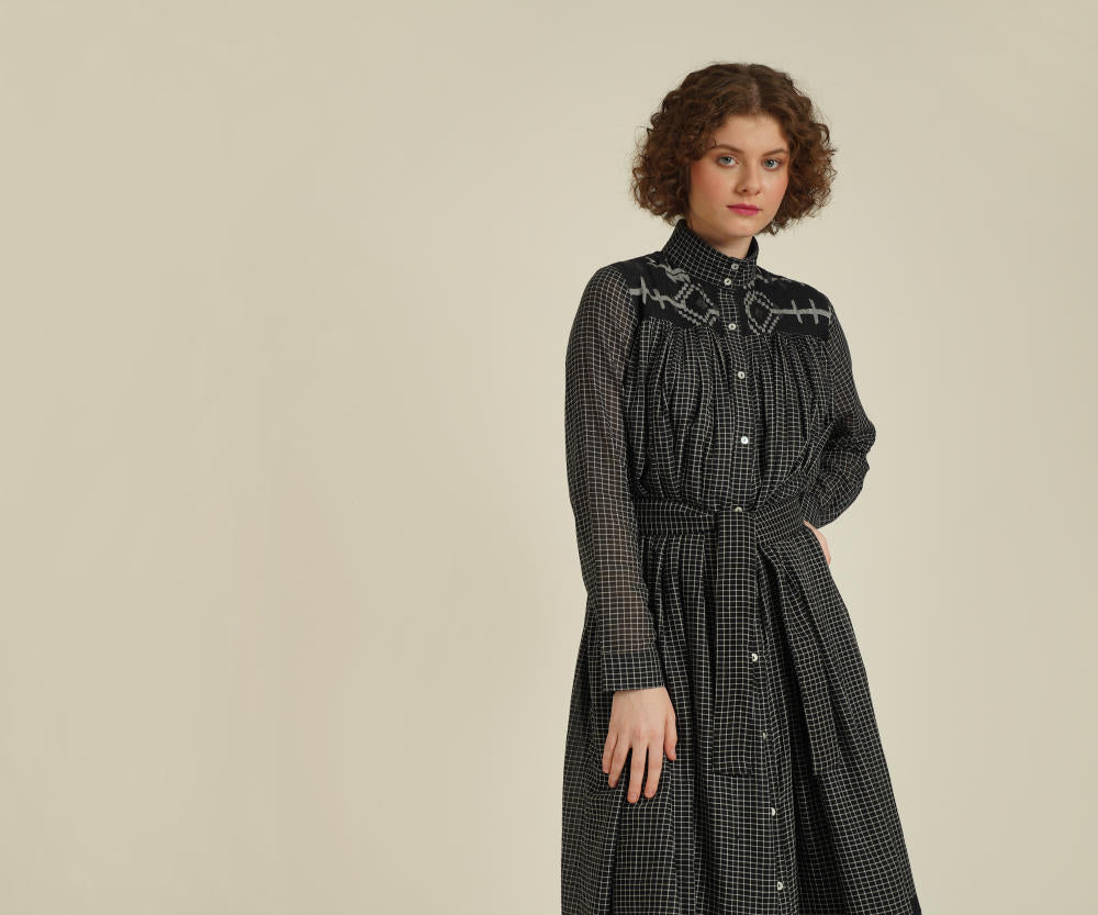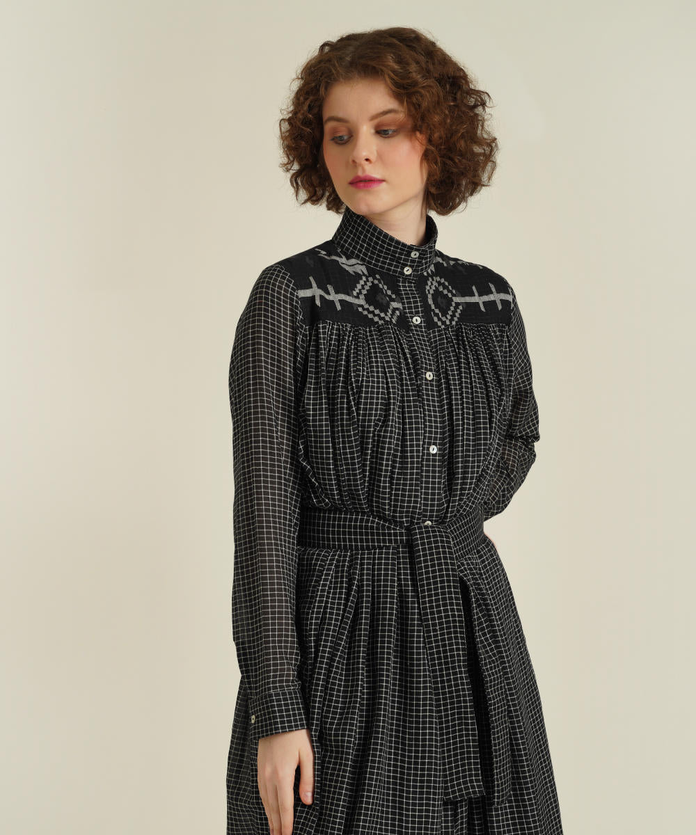 A minimalistic gathered shirt dress featuring high collar neck, front button fastening, full sleeves that comes with gentle pleats at the front and back which be styled in multiple ways. This dress also comes with a removable tie belt and a separate