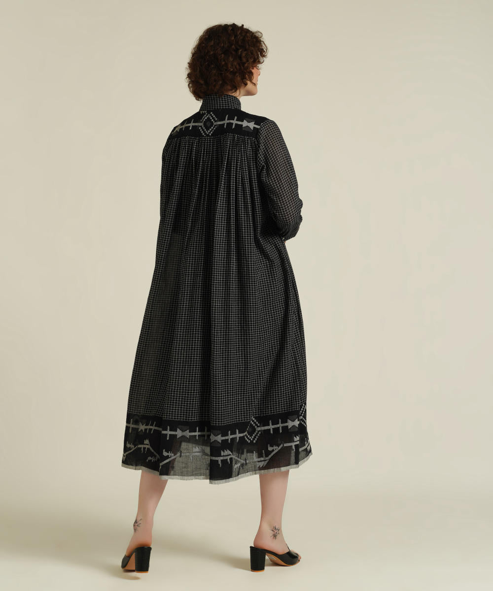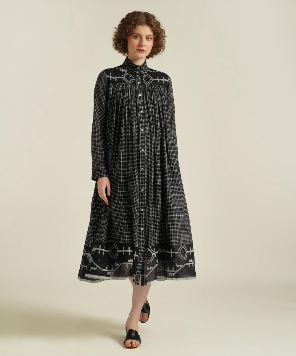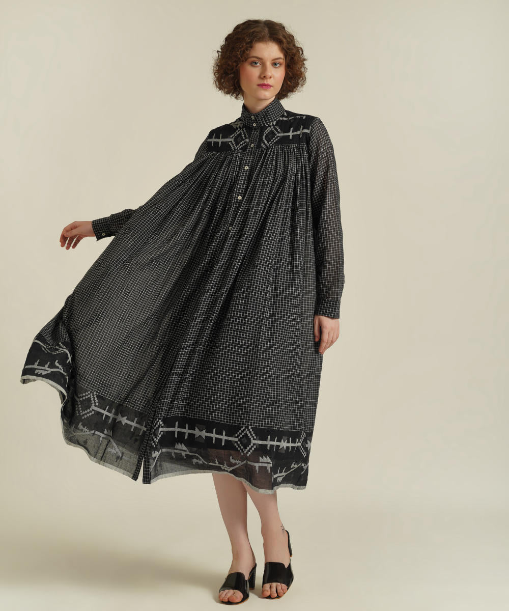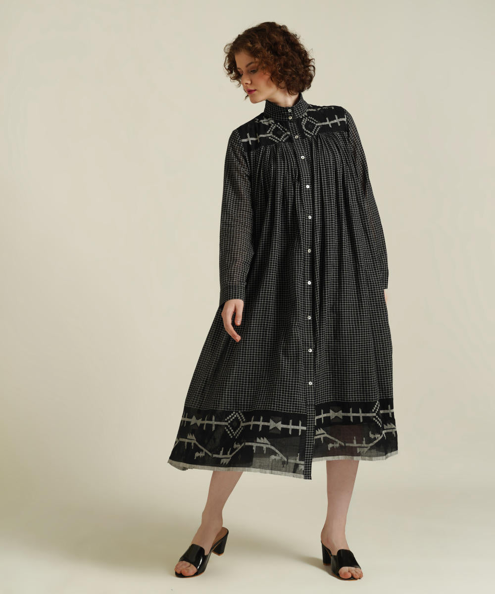 A minimalistic gathered shirt dress featuring high collar neck, front button fastening, full sleeves that comes with gentle pleats at the front and back which be styled in multiple ways. This dress also comes with a removable tie belt and a separate