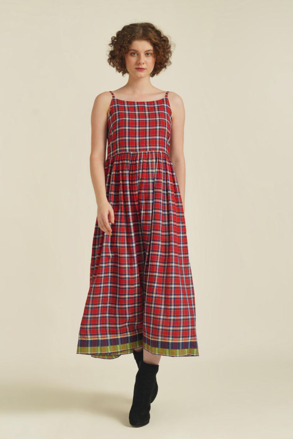 Slip dress featuring straight neck line, adjustable spaghetti strap, back zipper fastening that comes with side pockets.