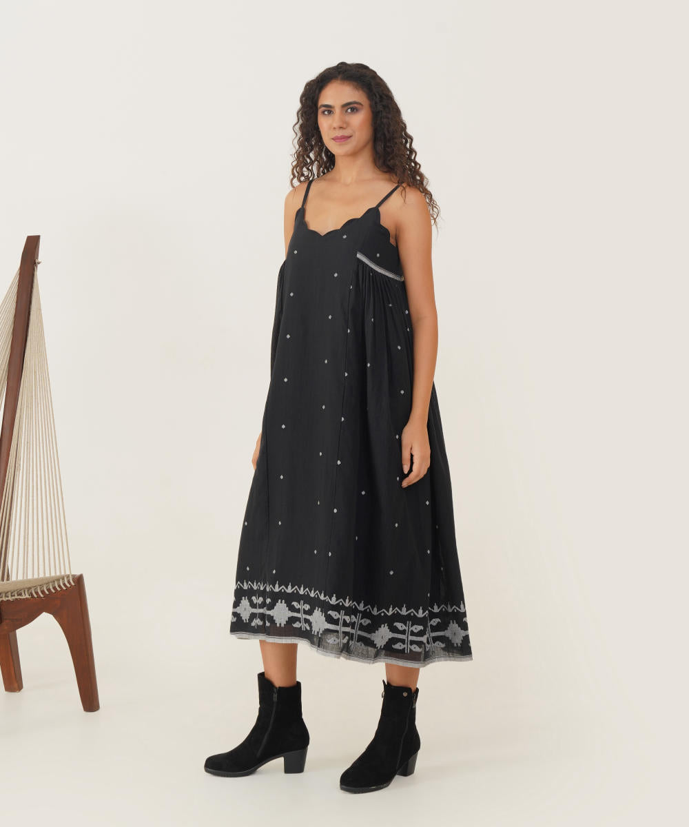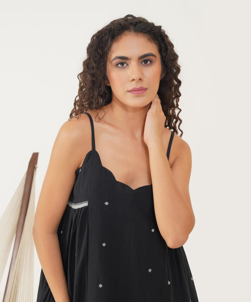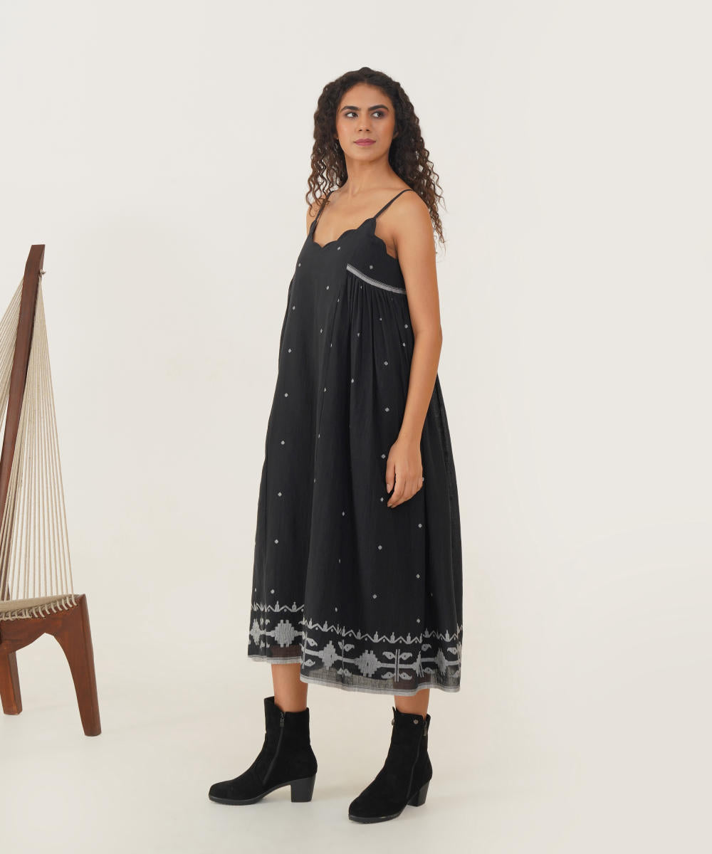 Discover refined elegance with our Jamdani dress, designed with a scalloped neckline and slender spaghetti straps for a touch of grace. The relaxed silhouette drapes effortlessly, enhanced by delicate side gathers that allow for easy, fluid movement. This dress combines timeless sophistication with a breezy, comfortable fit, perfect for any occasion where style and ease are paramount.