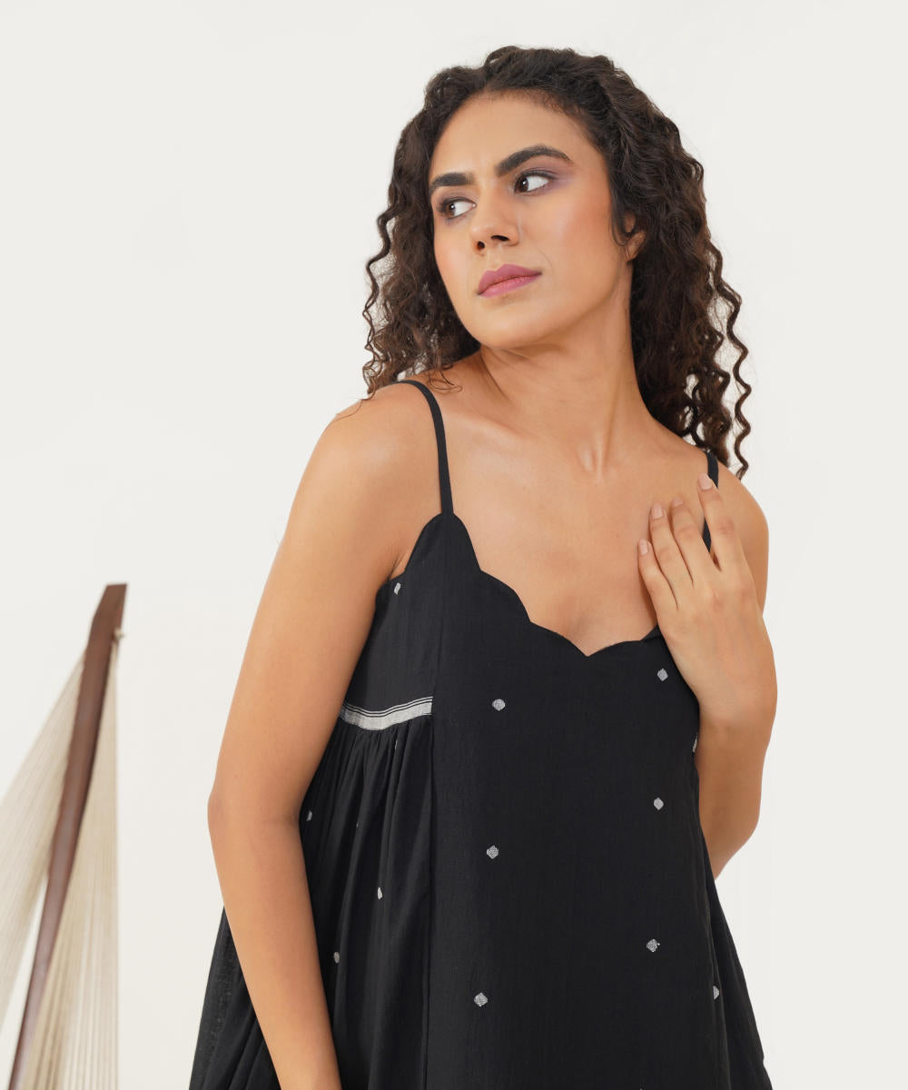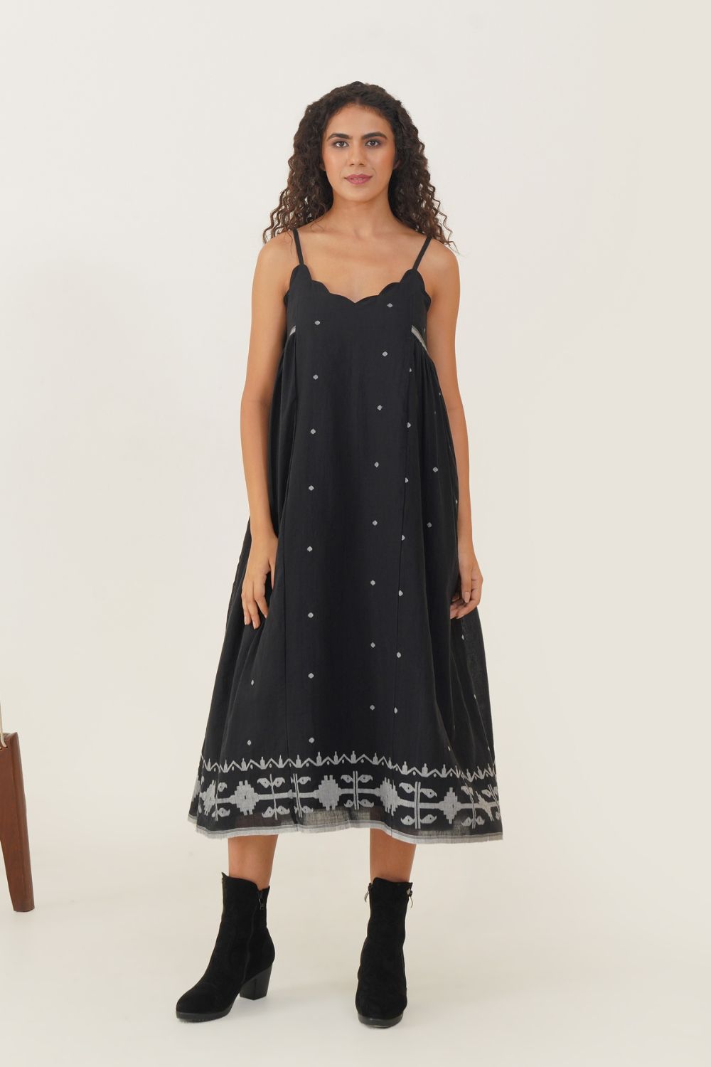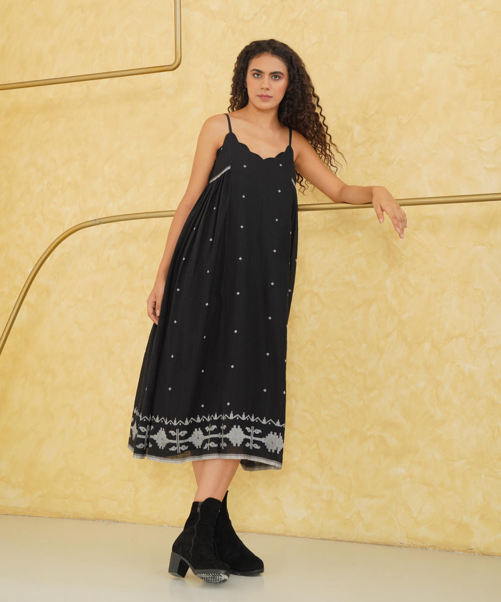 Discover refined elegance with our Jamdani dress, designed with a scalloped neckline and slender spaghetti straps for a touch of grace. The relaxed silhouette drapes effortlessly, enhanced by delicate side gathers that allow for easy, fluid movement. This dress combines timeless sophistication with a breezy, comfortable fit, perfect for any occasion where style and ease are paramount.