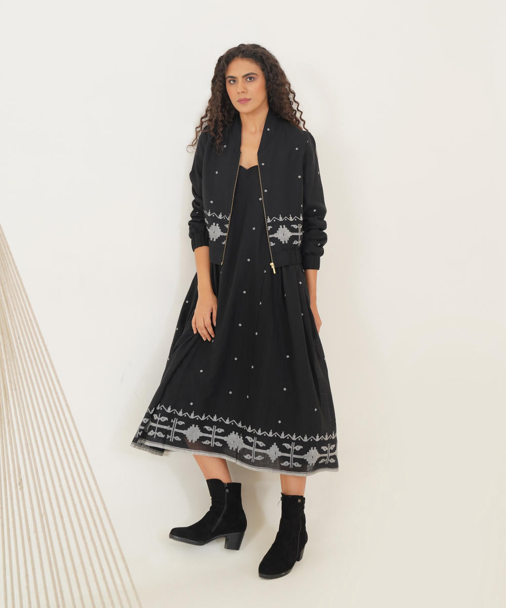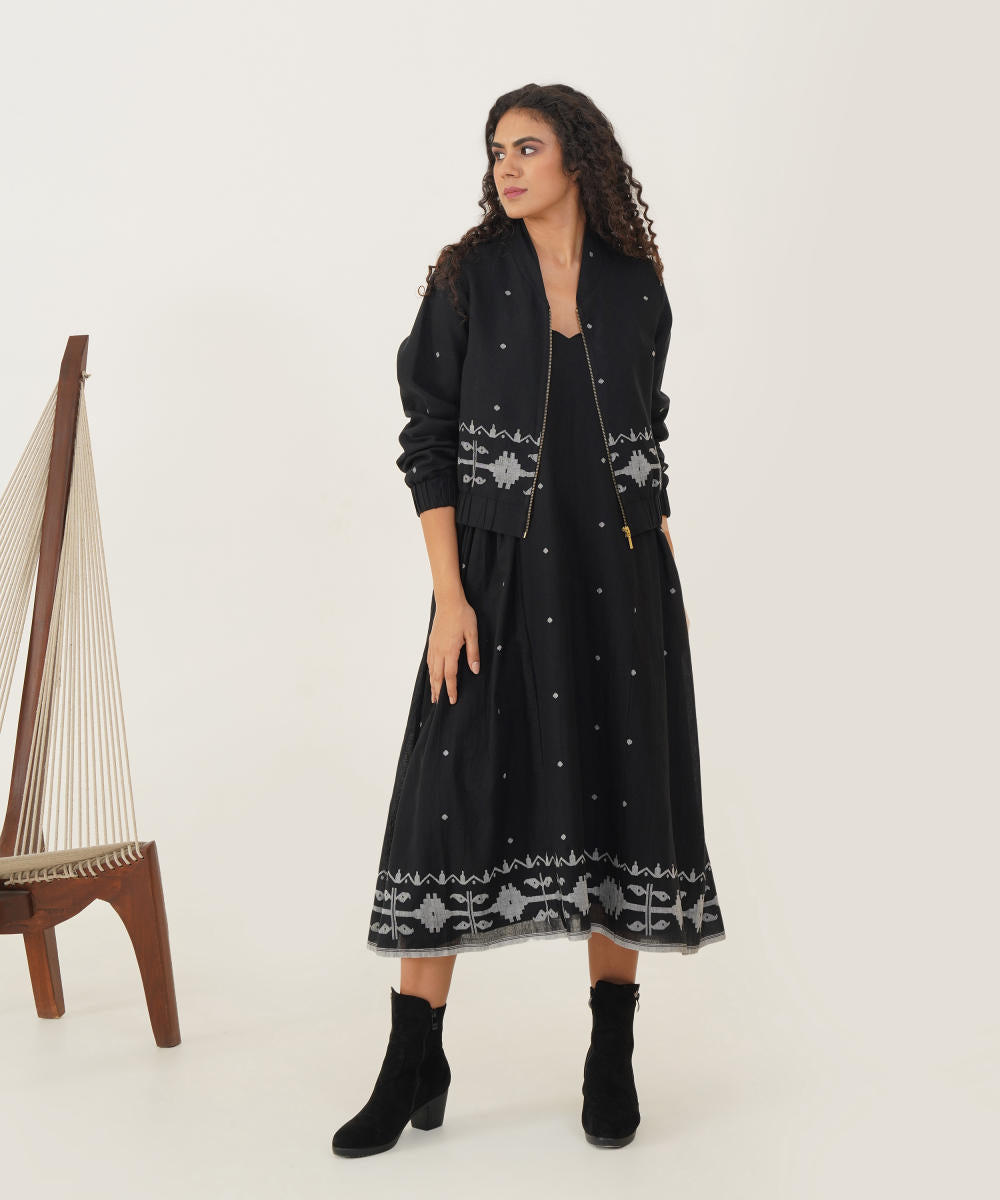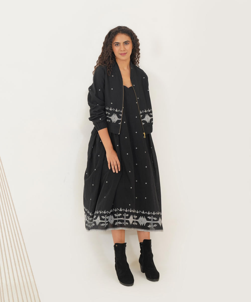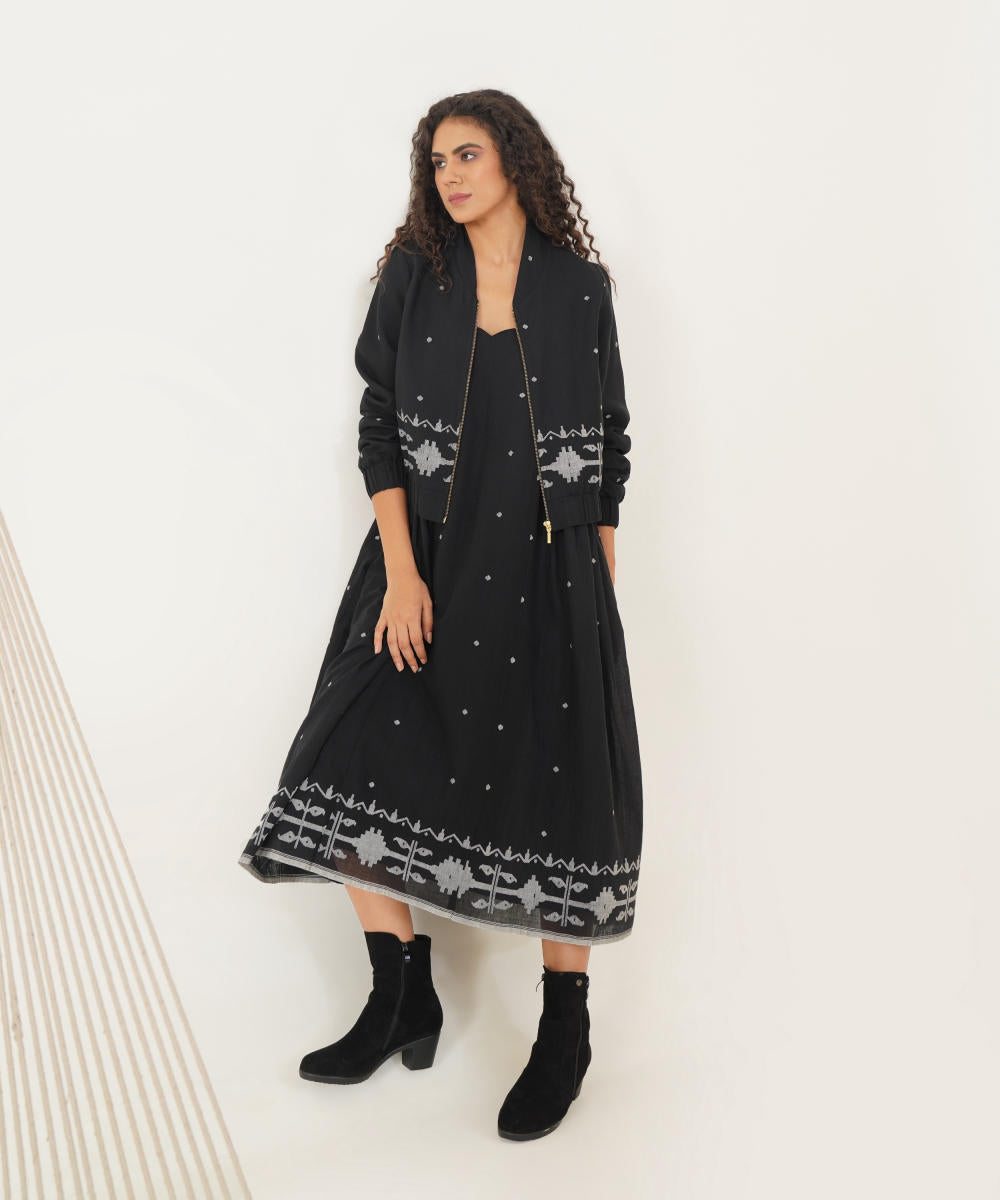 Discover the allure of timeless sophistication with our classic Jamdani ensemble. The scalloped neckline dress, adorned with delicate spaghetti straps and gentle side gathers, offers a flattering and elegant silhouette. Complemented by an intricately woven Jamdani bomber jacket, this set seamlessly blends traditional craftsmanship with modern style. Together, they create a look that is both refined and unique, perfect for making a lasting impression.