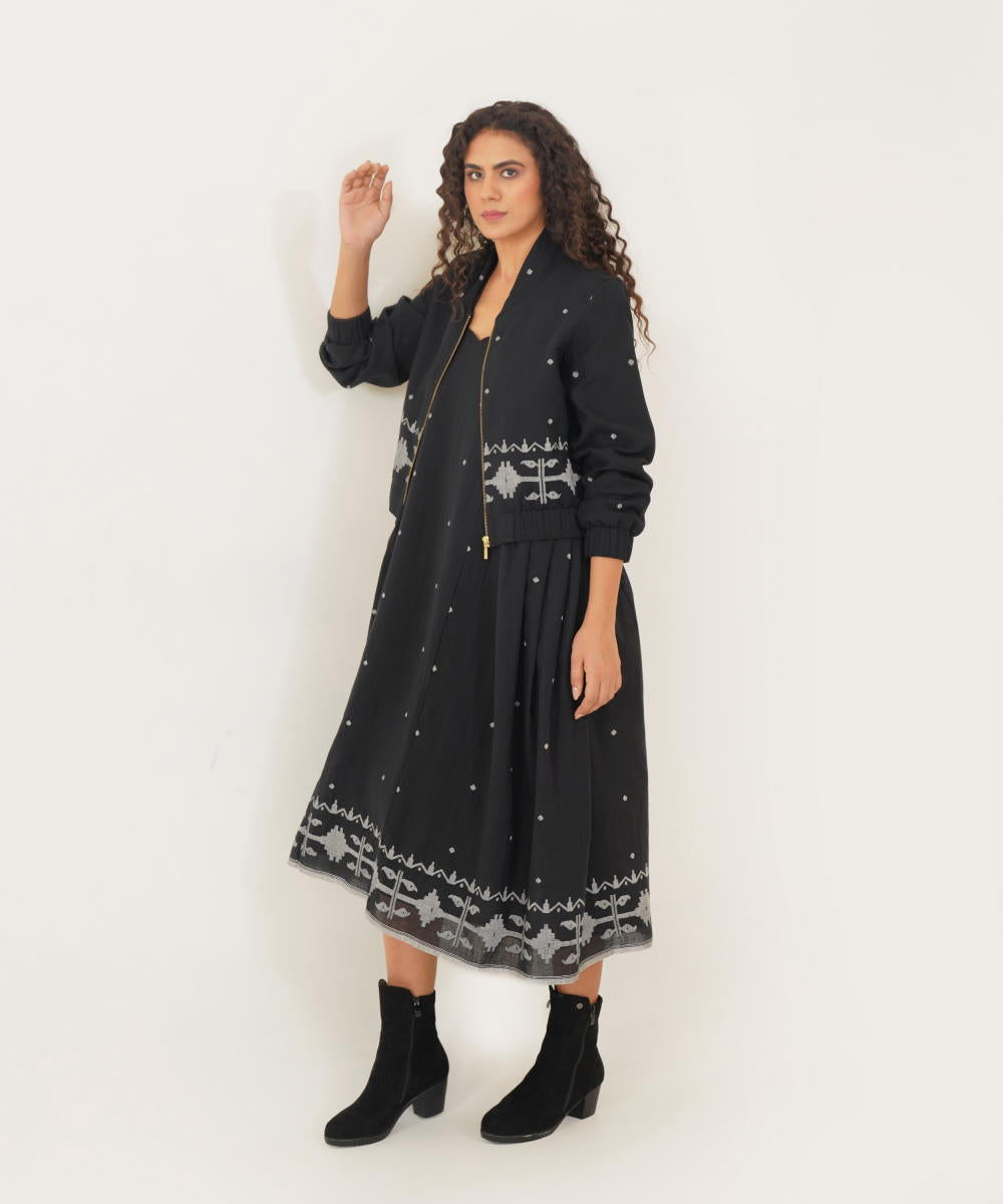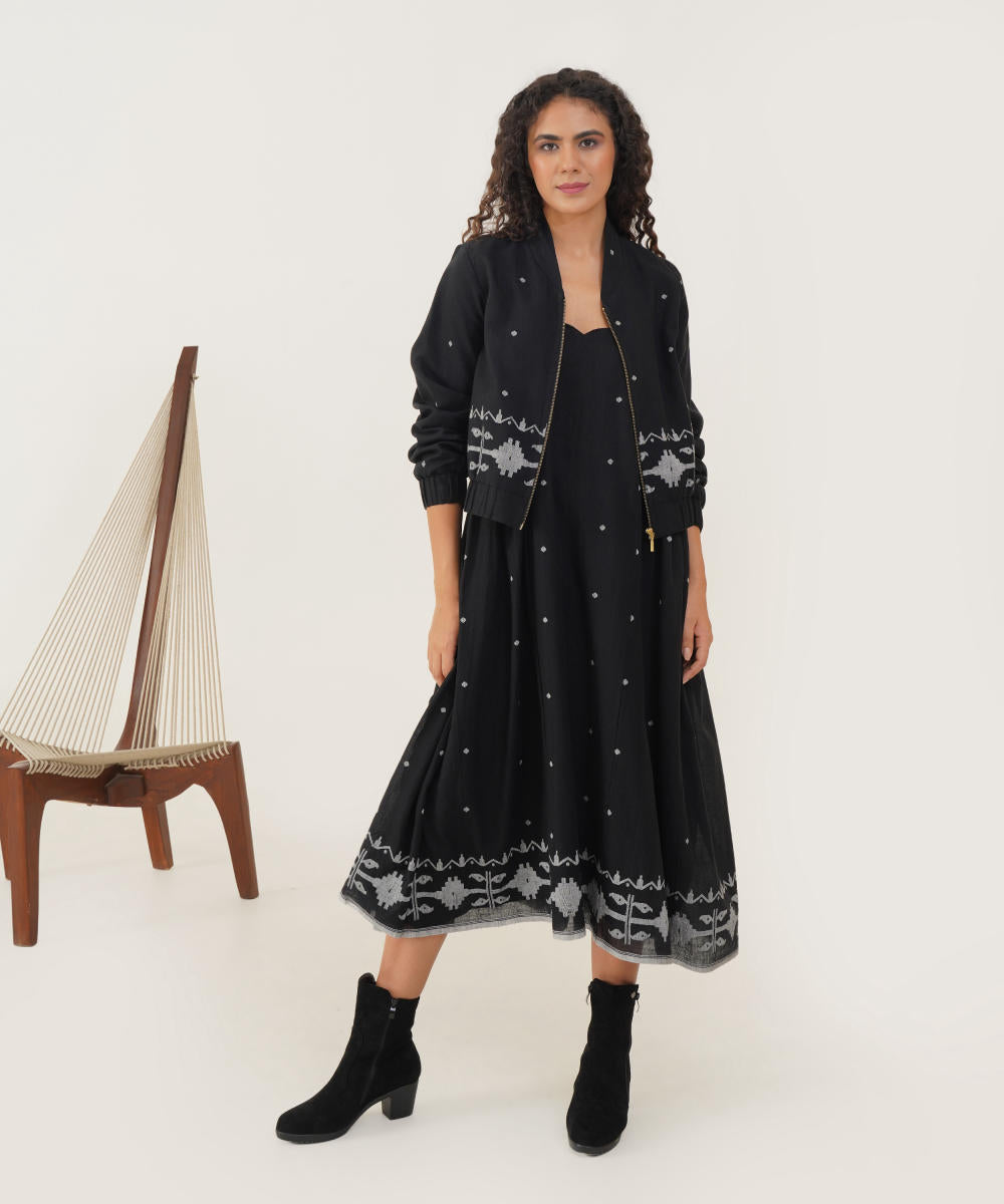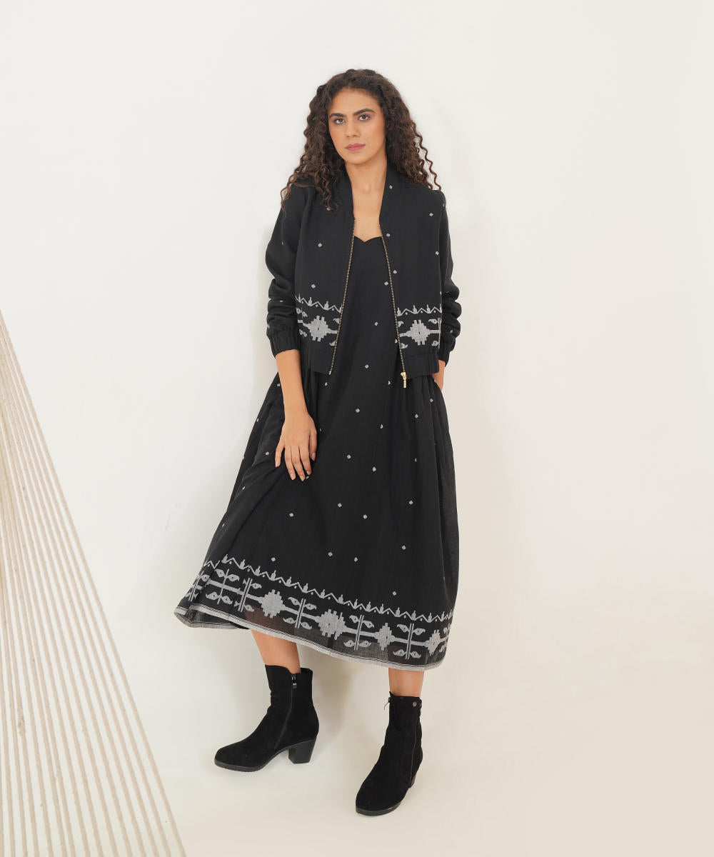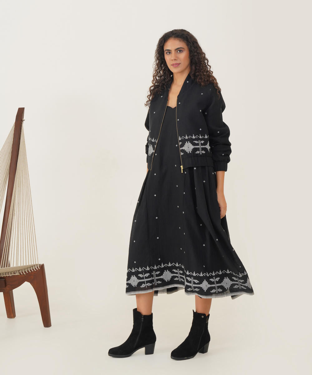 Discover the allure of timeless sophistication with our classic Jamdani ensemble. The scalloped neckline dress, adorned with delicate spaghetti straps and gentle side gathers, offers a flattering and elegant silhouette. Complemented by an intricately woven Jamdani bomber jacket, this set seamlessly blends traditional craftsmanship with modern style. Together, they create a look that is both refined and unique, perfect for making a lasting impression.