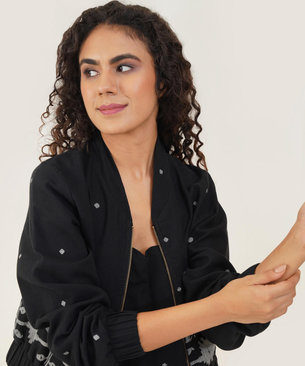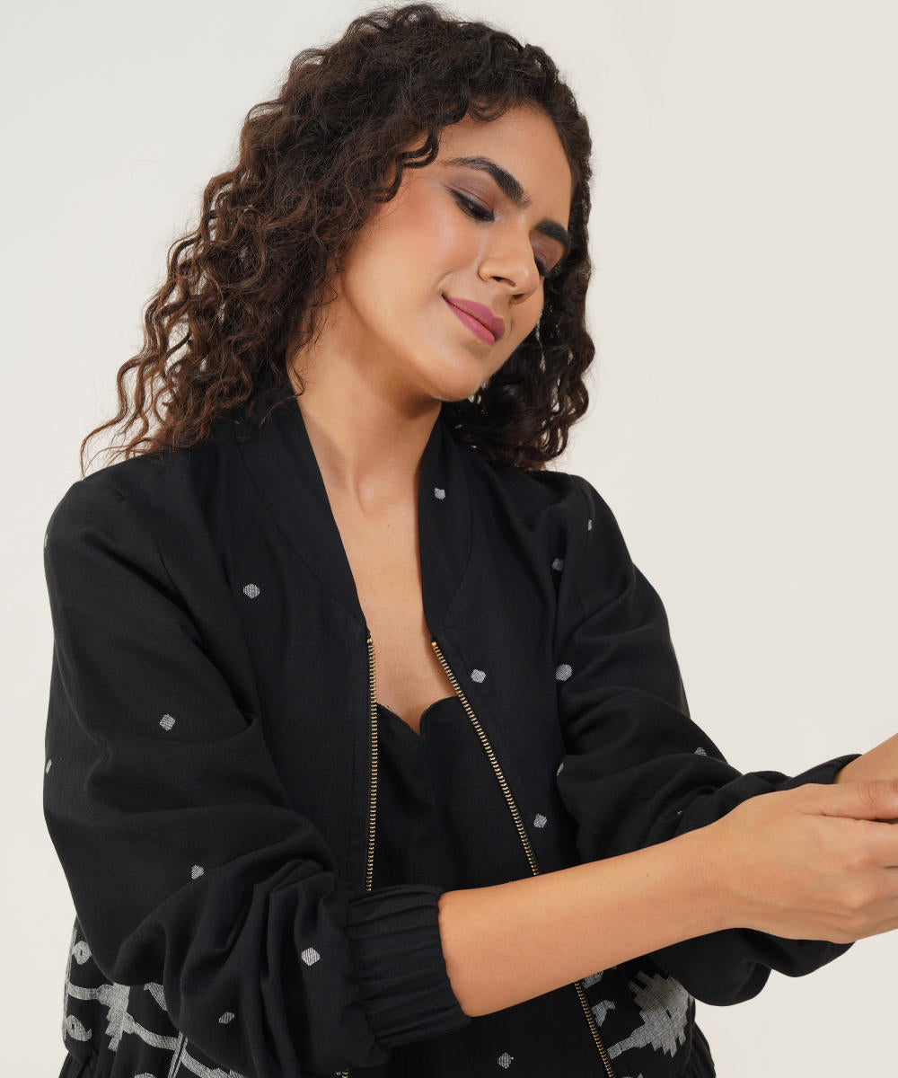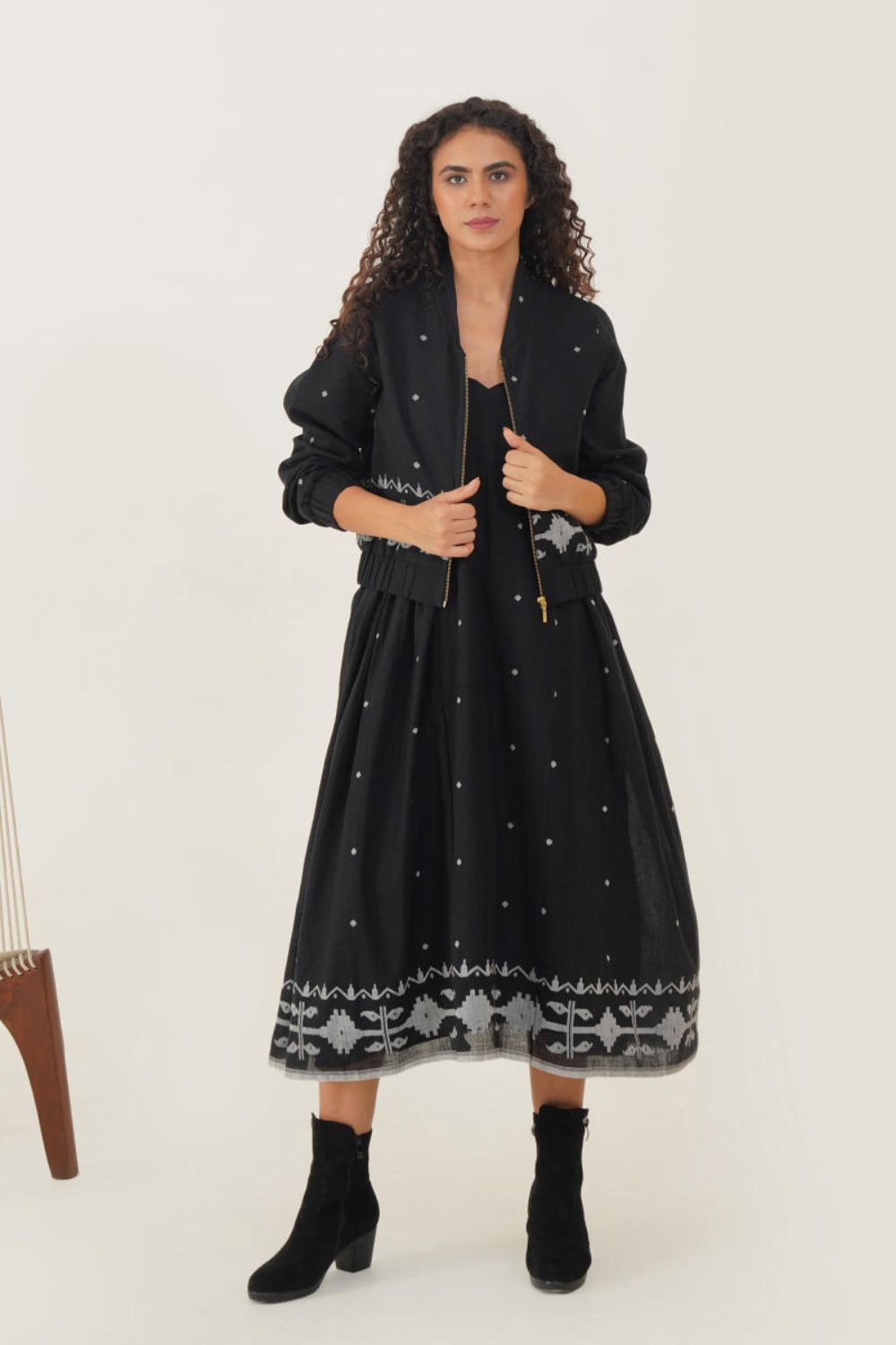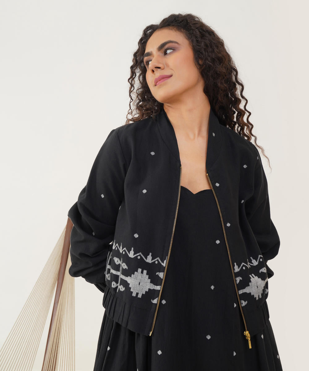 Discover the allure of timeless sophistication with our classic Jamdani ensemble. The scalloped neckline dress, adorned with delicate spaghetti straps and gentle side gathers, offers a flattering and elegant silhouette. Complemented by an intricately woven Jamdani bomber jacket, this set seamlessly blends traditional craftsmanship with modern style. Together, they create a look that is both refined and unique, perfect for making a lasting impression.