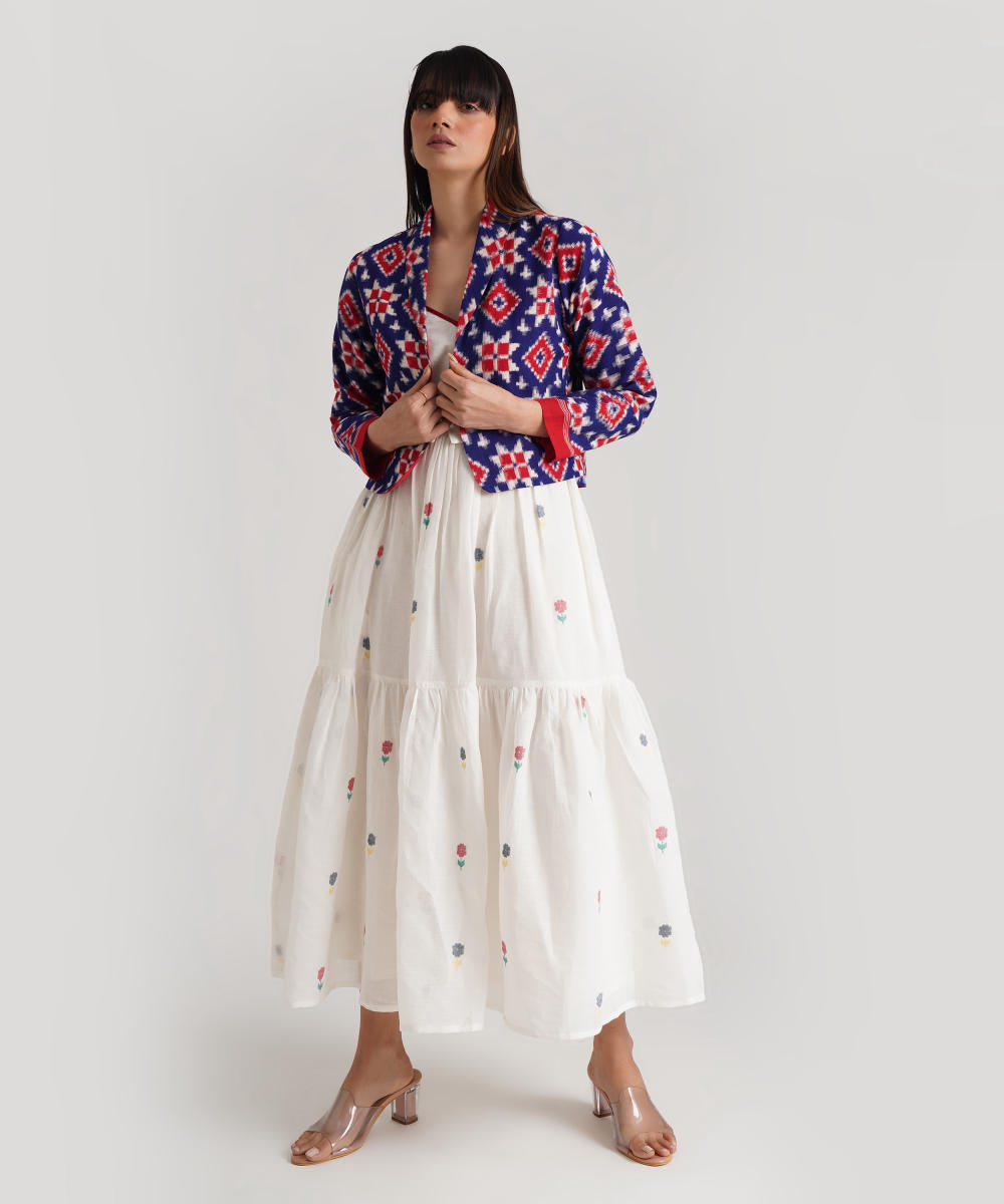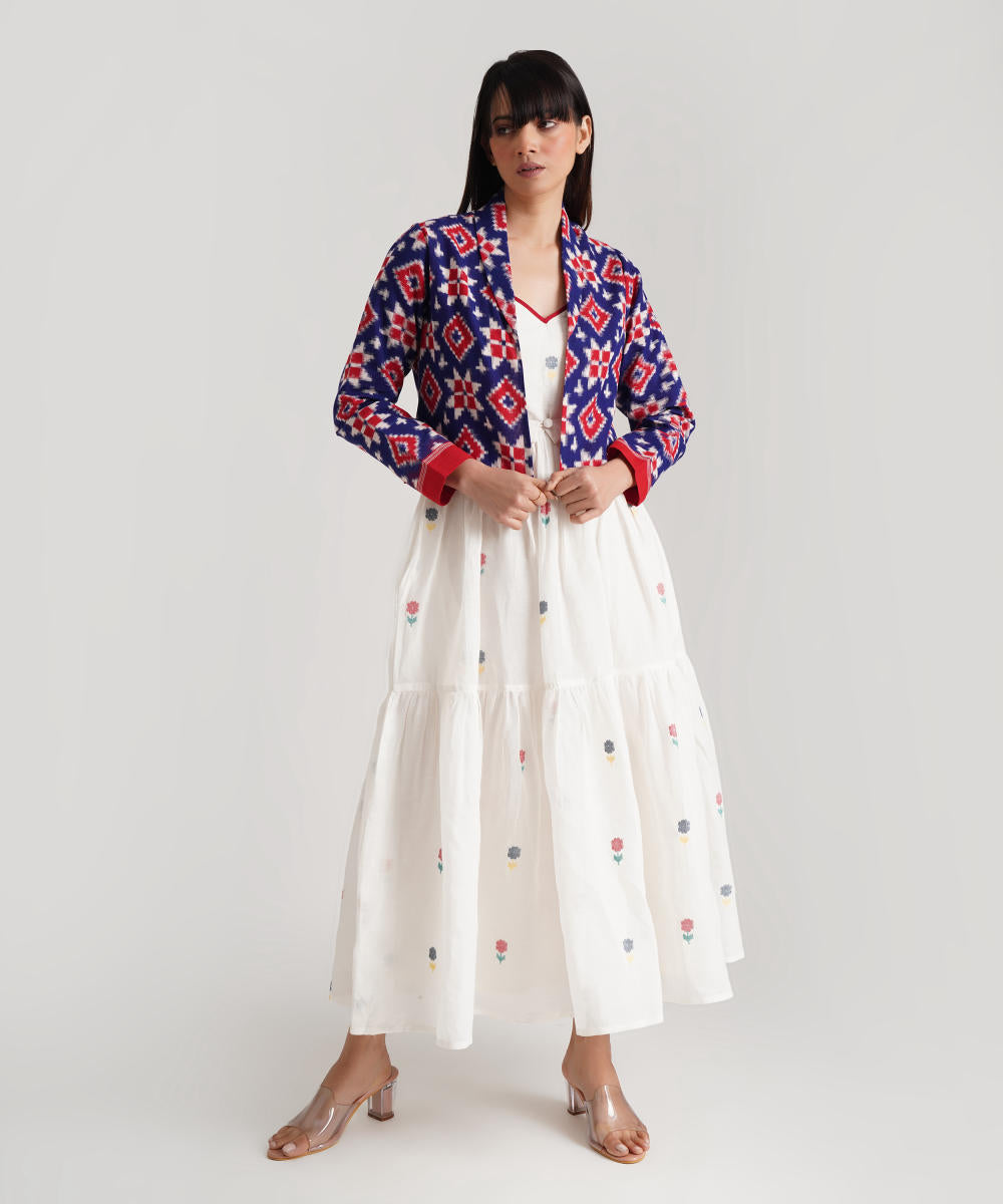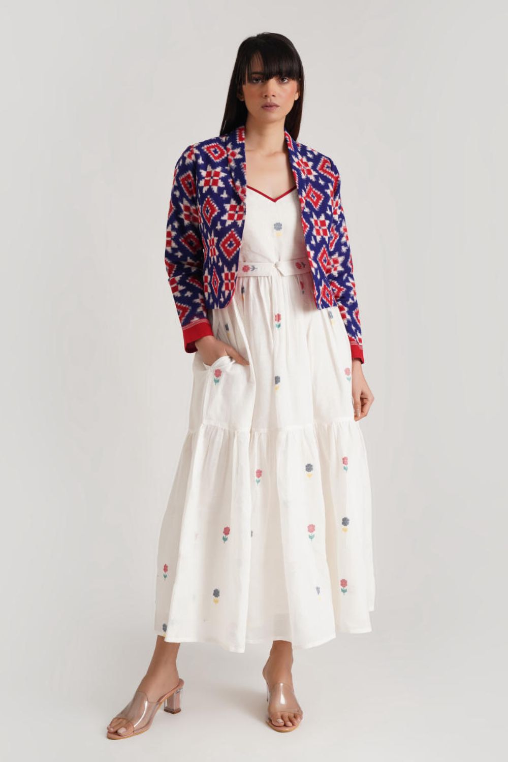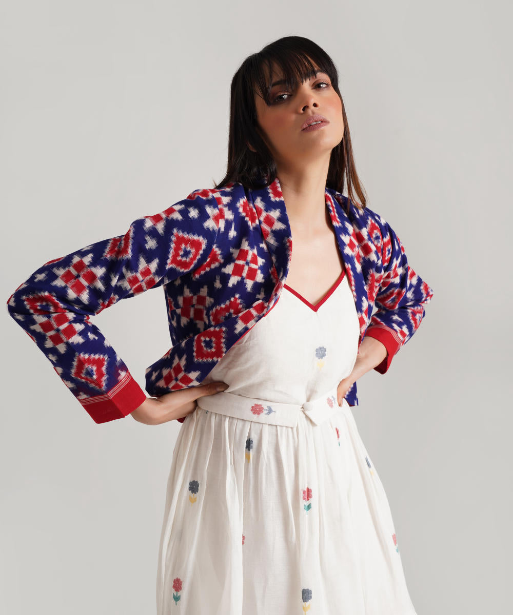 A classic ensemble is a juxtaposition of heritage-rich Jamdani weaves and a Telia jacket uniquely crafted to enhance elegance. Handwoven by Indian artisans, the ensemble features a signature fabric belt to add glam.