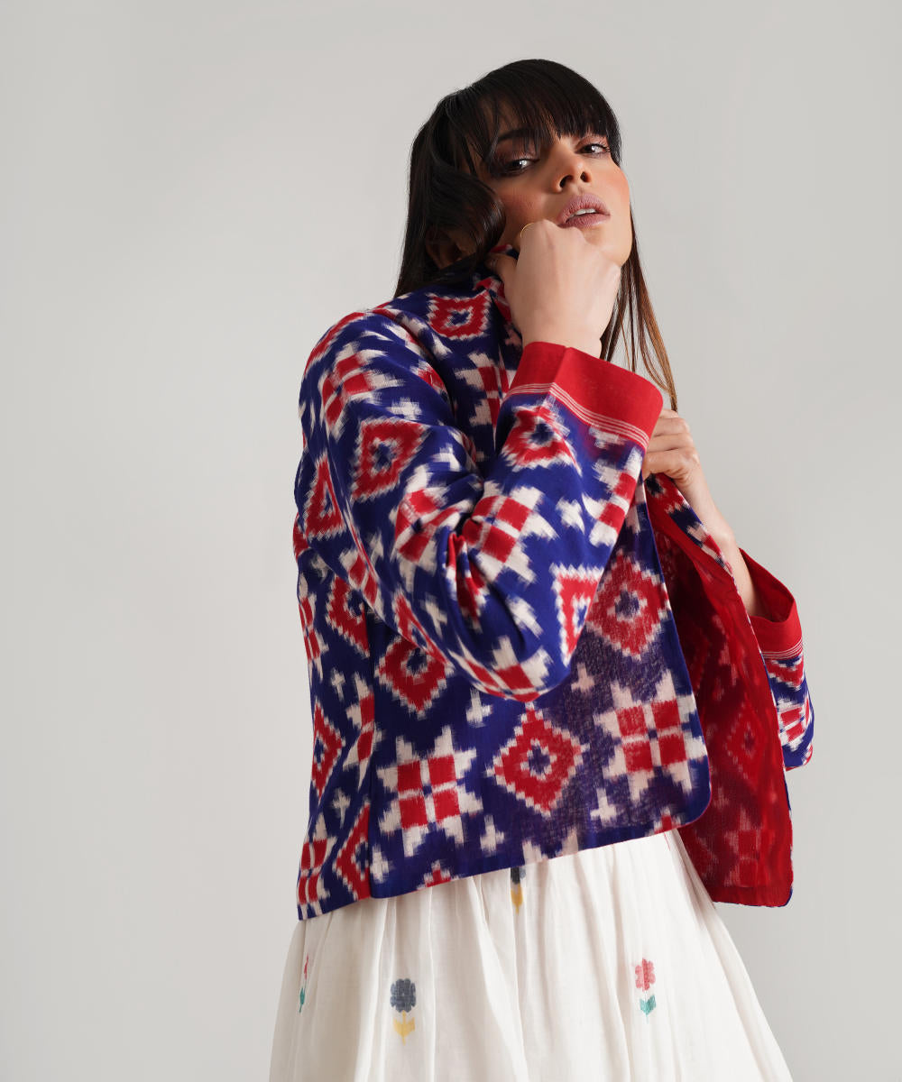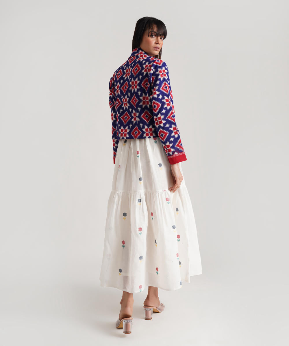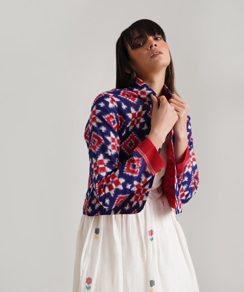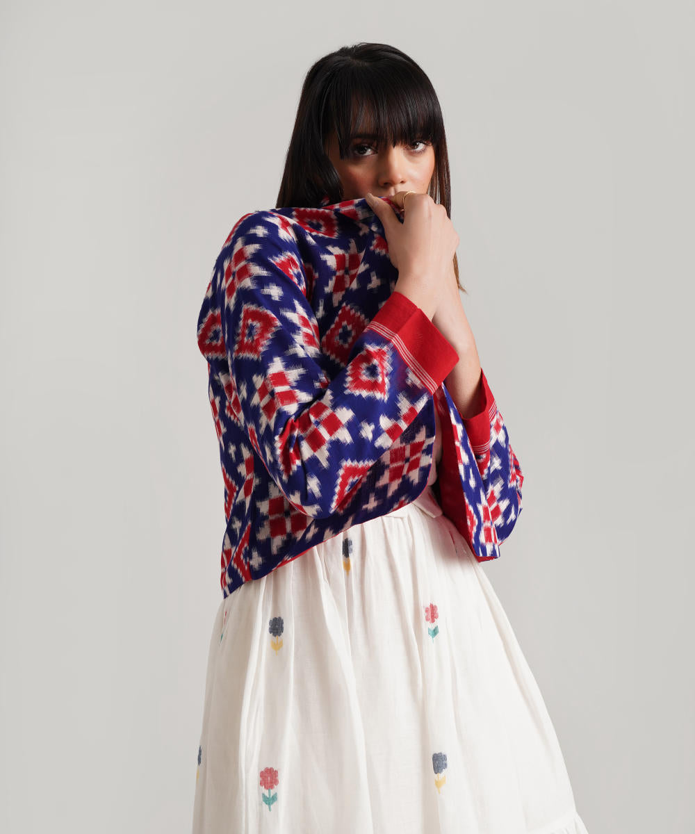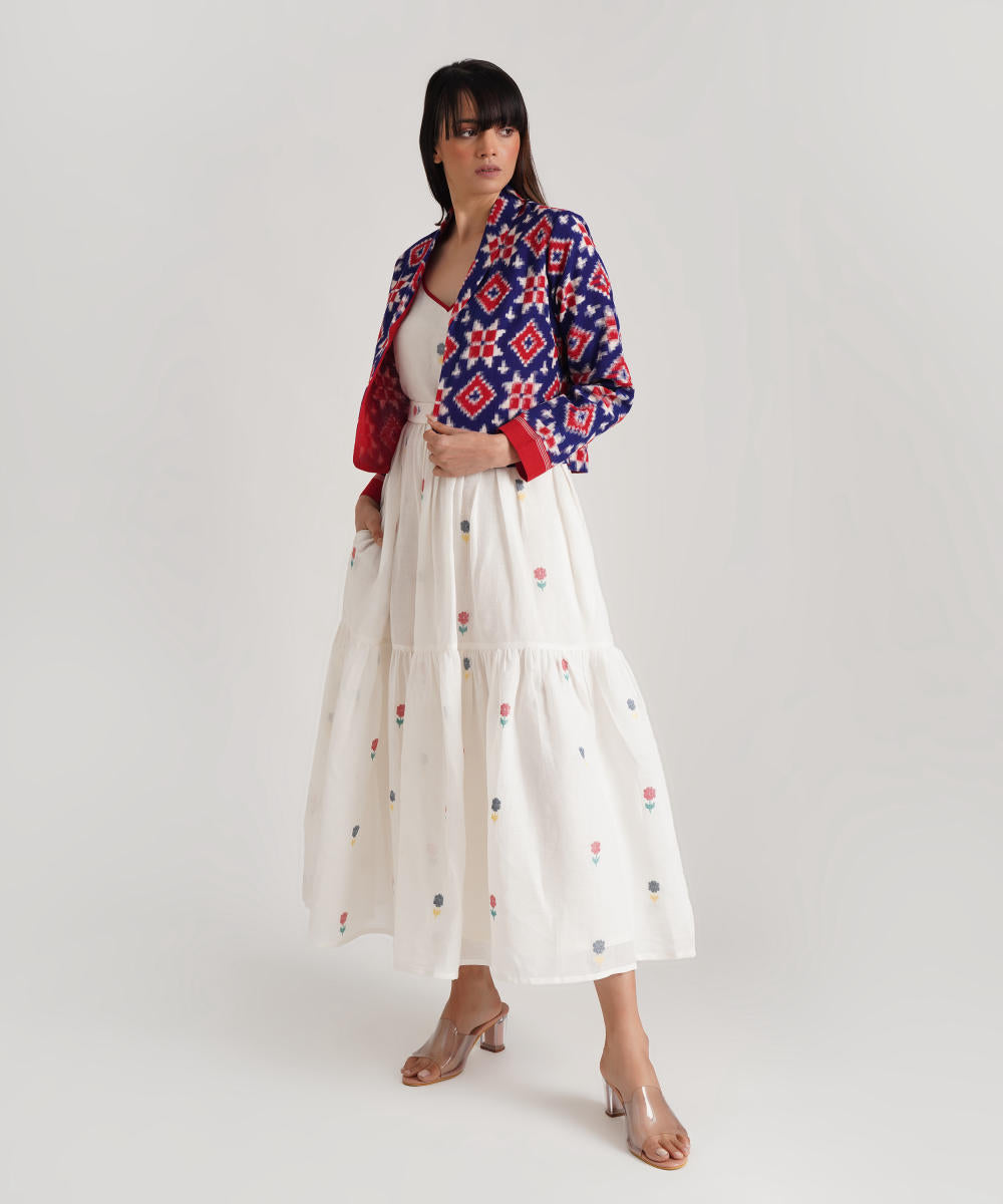 A classic ensemble is a juxtaposition of heritage-rich Jamdani weaves and a Telia jacket uniquely crafted to enhance elegance. Handwoven by Indian artisans, the ensemble features a signature fabric belt to add glam.
