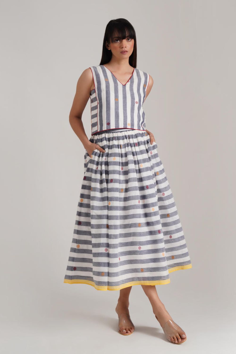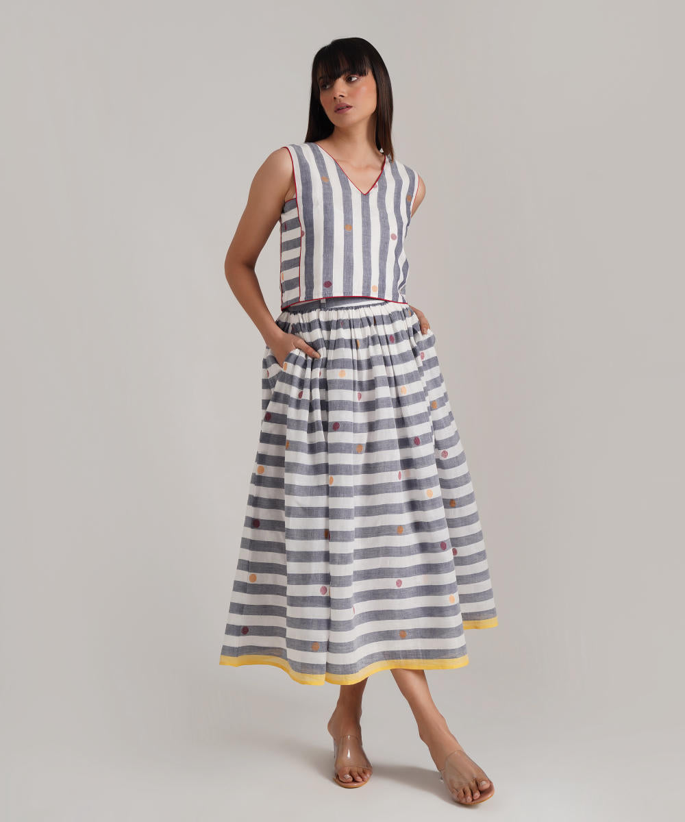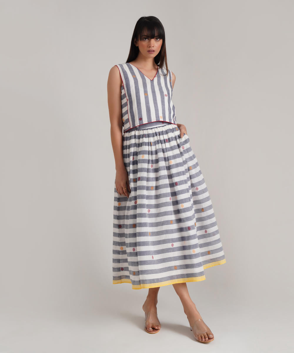 A classic jamdani ensemble featuring a gathered skirt with side pockets, a coordinated top with contrast piping detailing along with jacket zipper at the back is a perfect choice for the sustainable wardrobe.