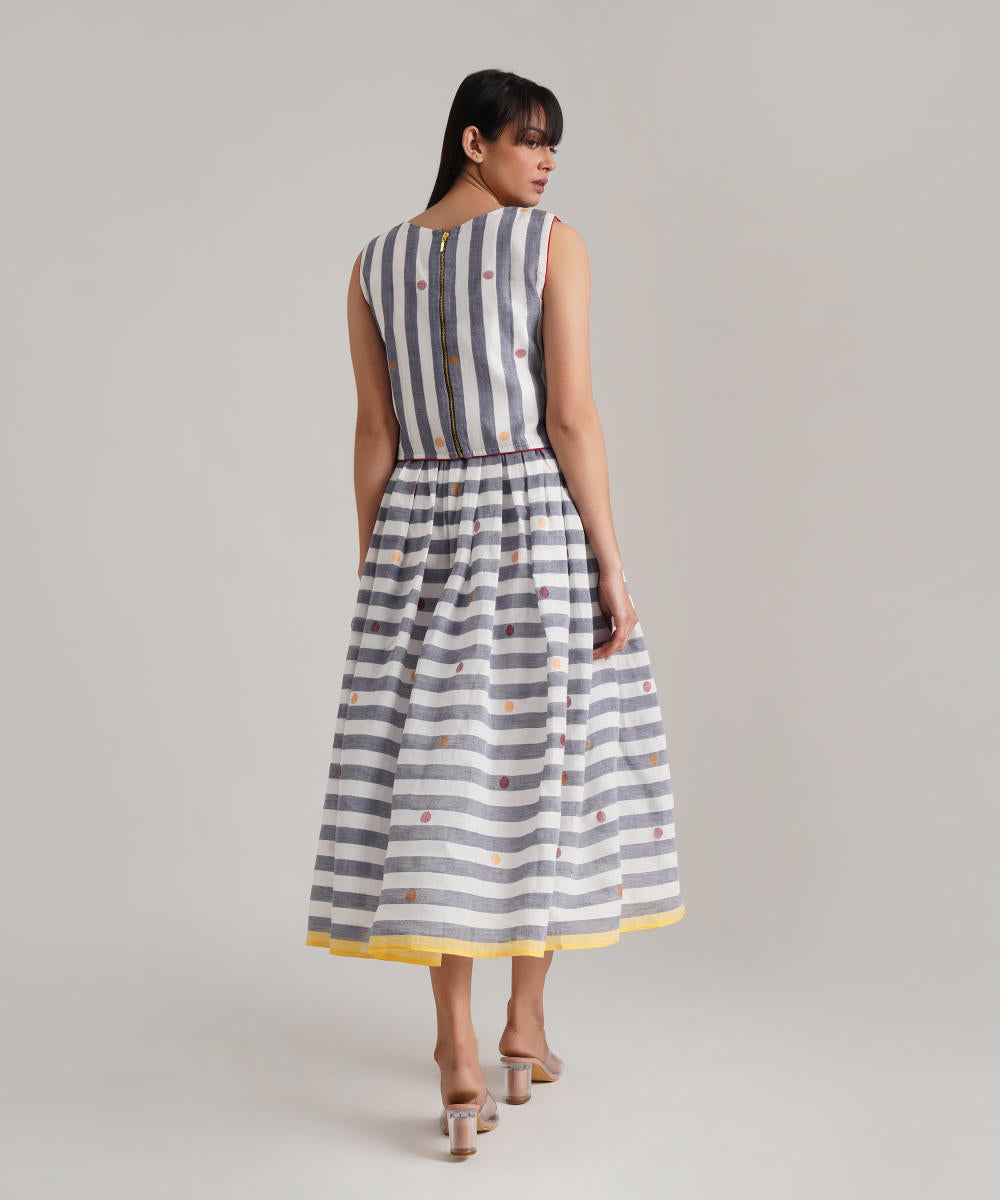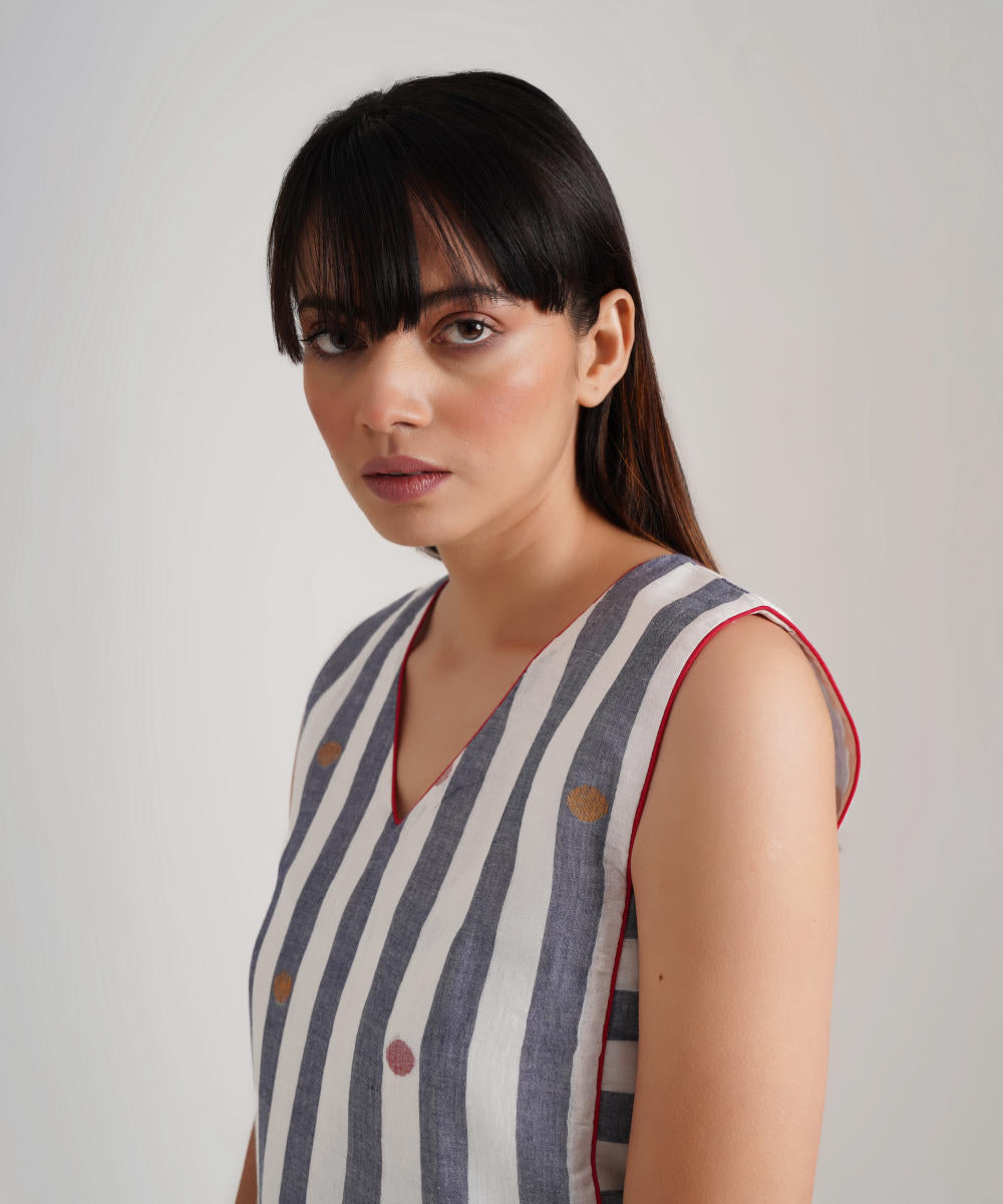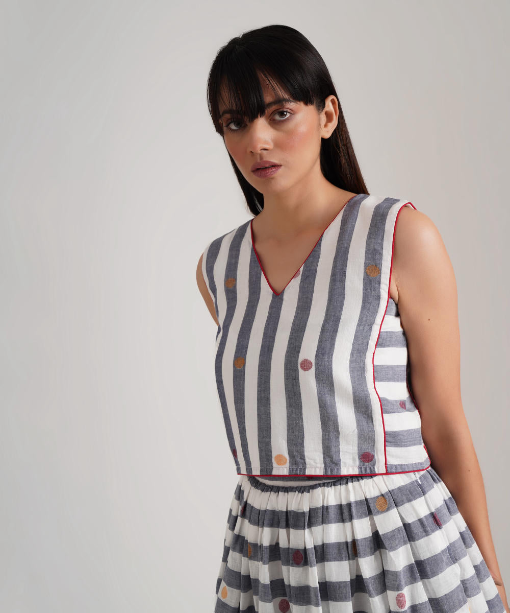 A classic jamdani ensemble featuring a gathered skirt with side pockets, a coordinated top with contrast piping detailing along with jacket zipper at the back is a perfect choice for the sustainable wardrobe.