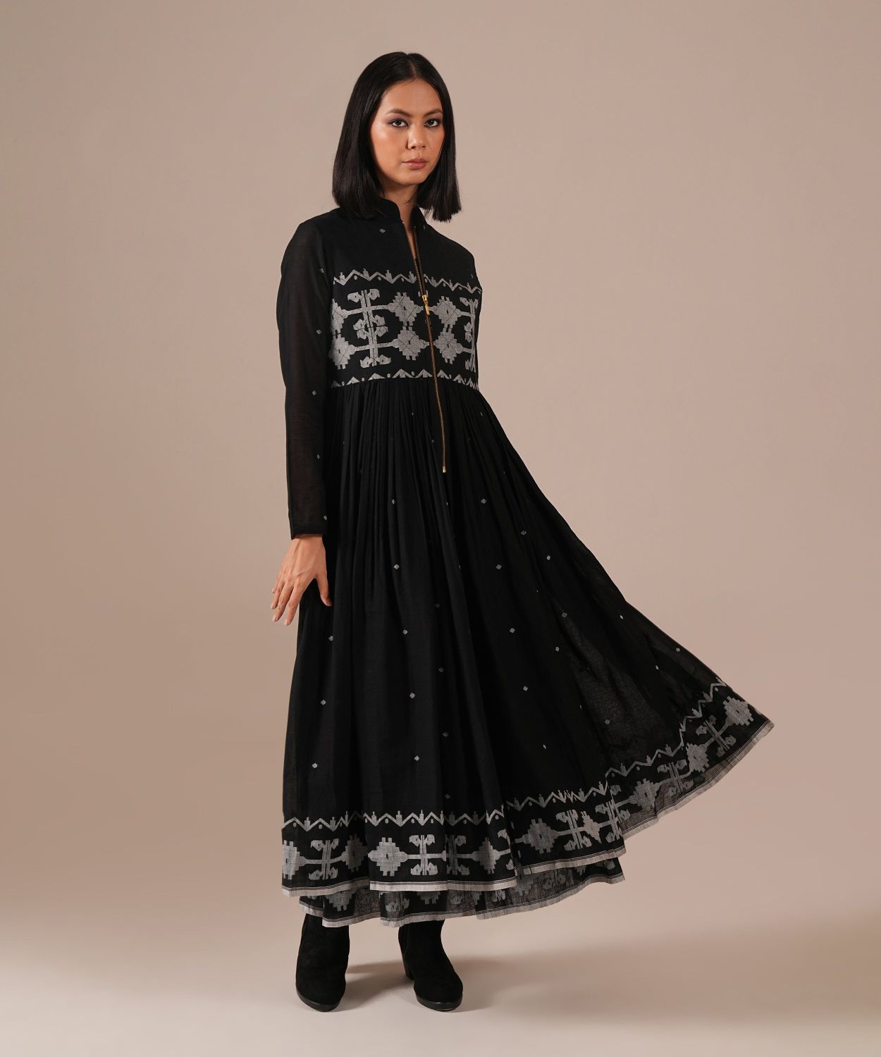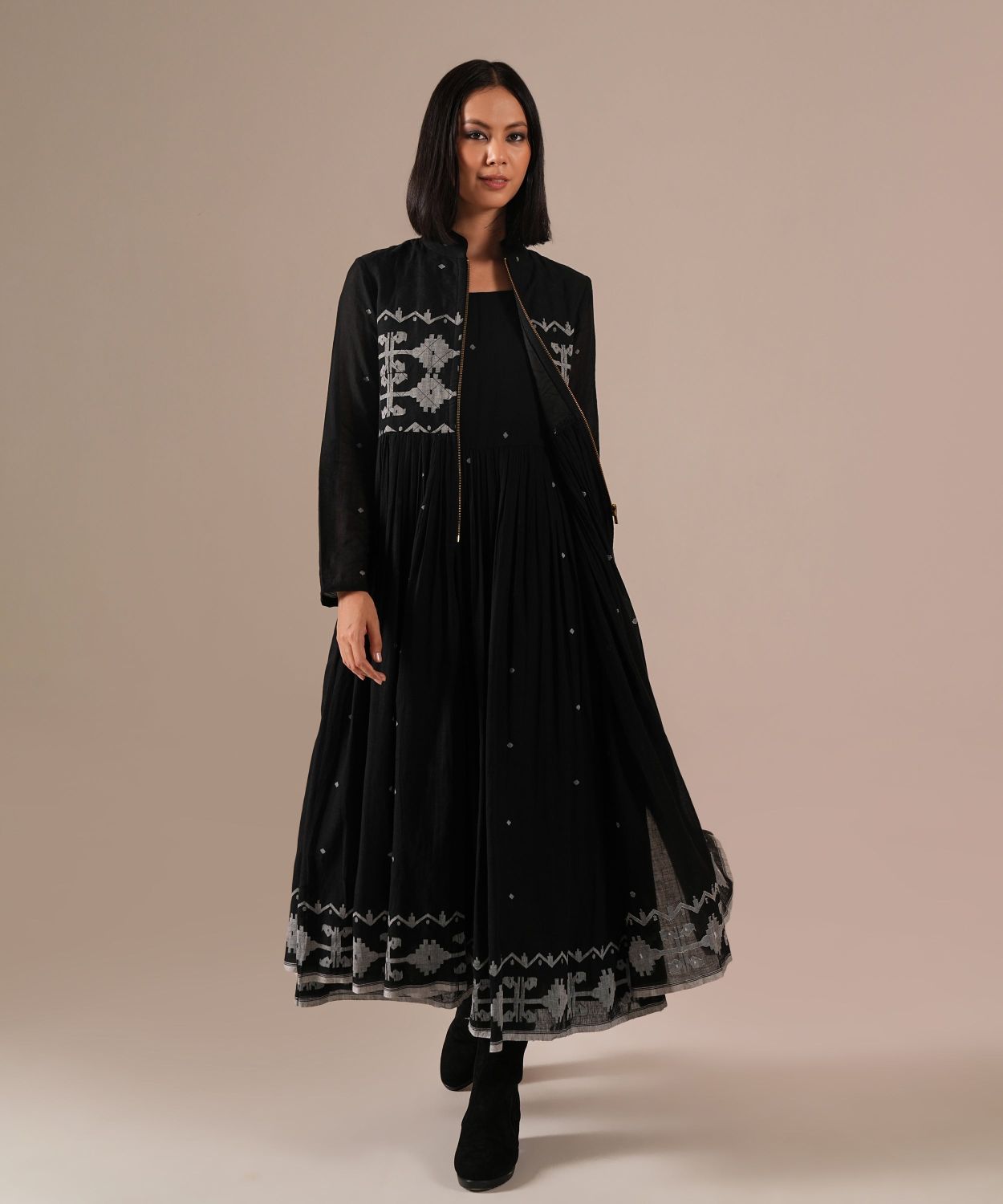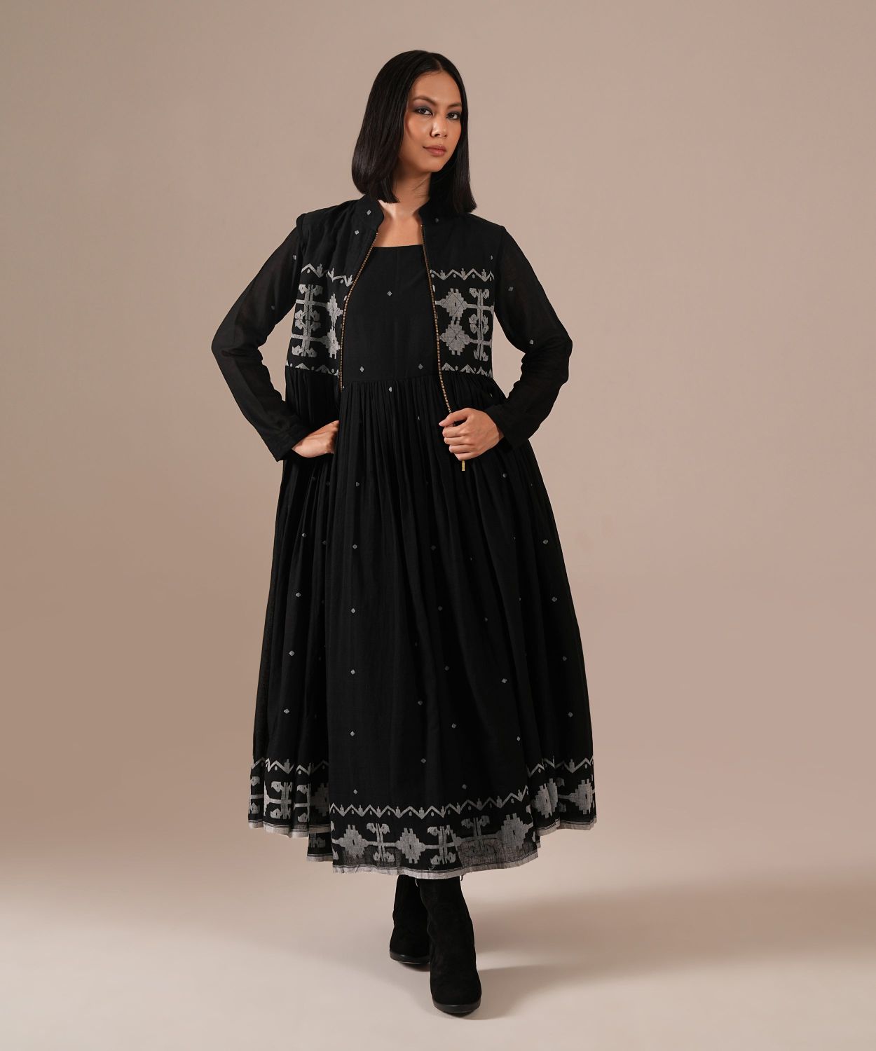Jamdani over Jamdani. A wearable work of art featuring an intricately woven gathered inner dress paired with a matching Jamdani overlay with voluminous gathers, quilted bodice and front metal zipper.