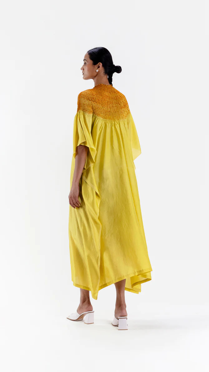 Free-size silk kaftan with our signature shibori neckline, dyed in shades of lime and brown.