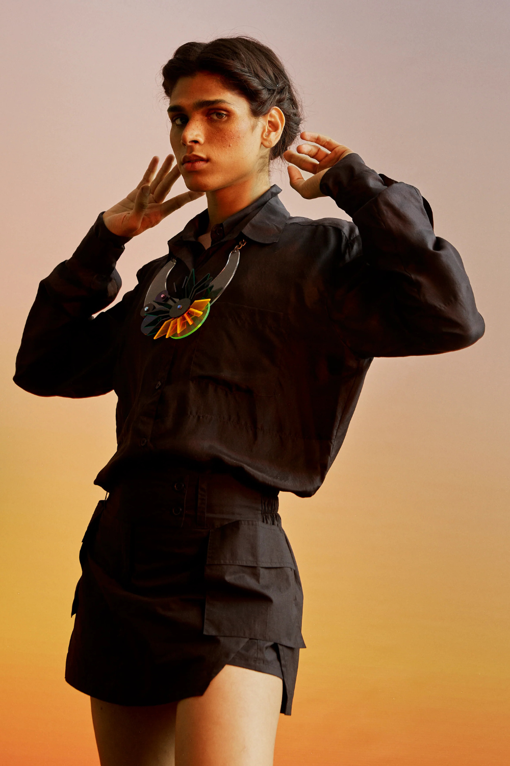 A modern duo-tone ensemble combining a fine silk shirt with contrast collar and cuffs, and a cotton poplin skirt with hidden shorts and contrast pockets, versatile for both combined and separate wear.
