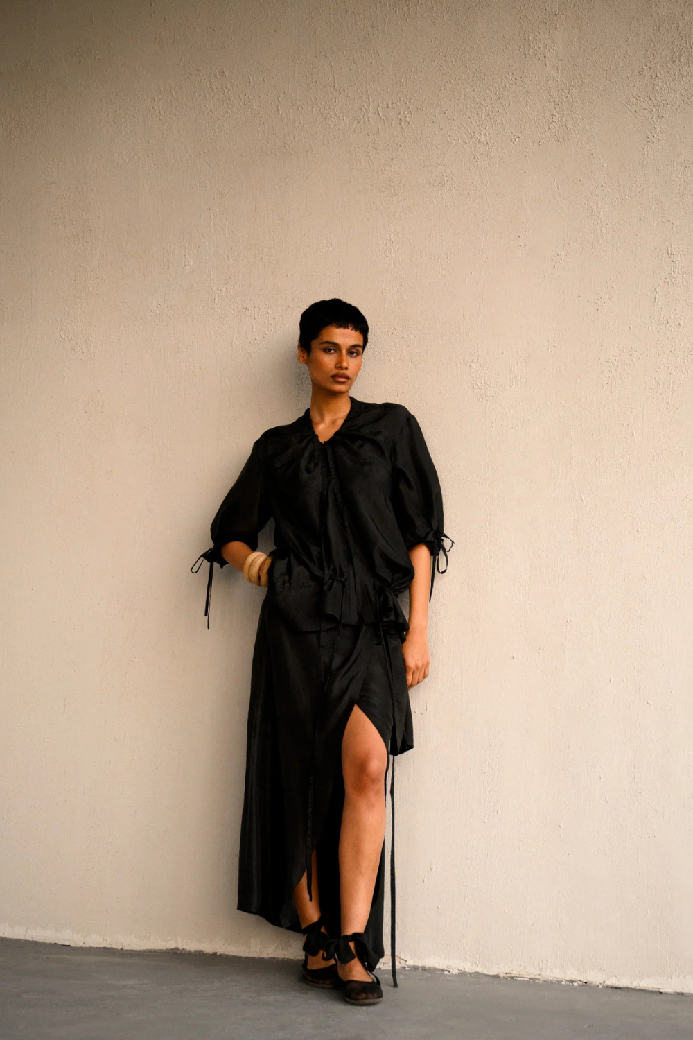 An adjustable silk ensemble, featuring versatile ties for endless styling possibilities; effortlessly elegant and adaptable to any size.