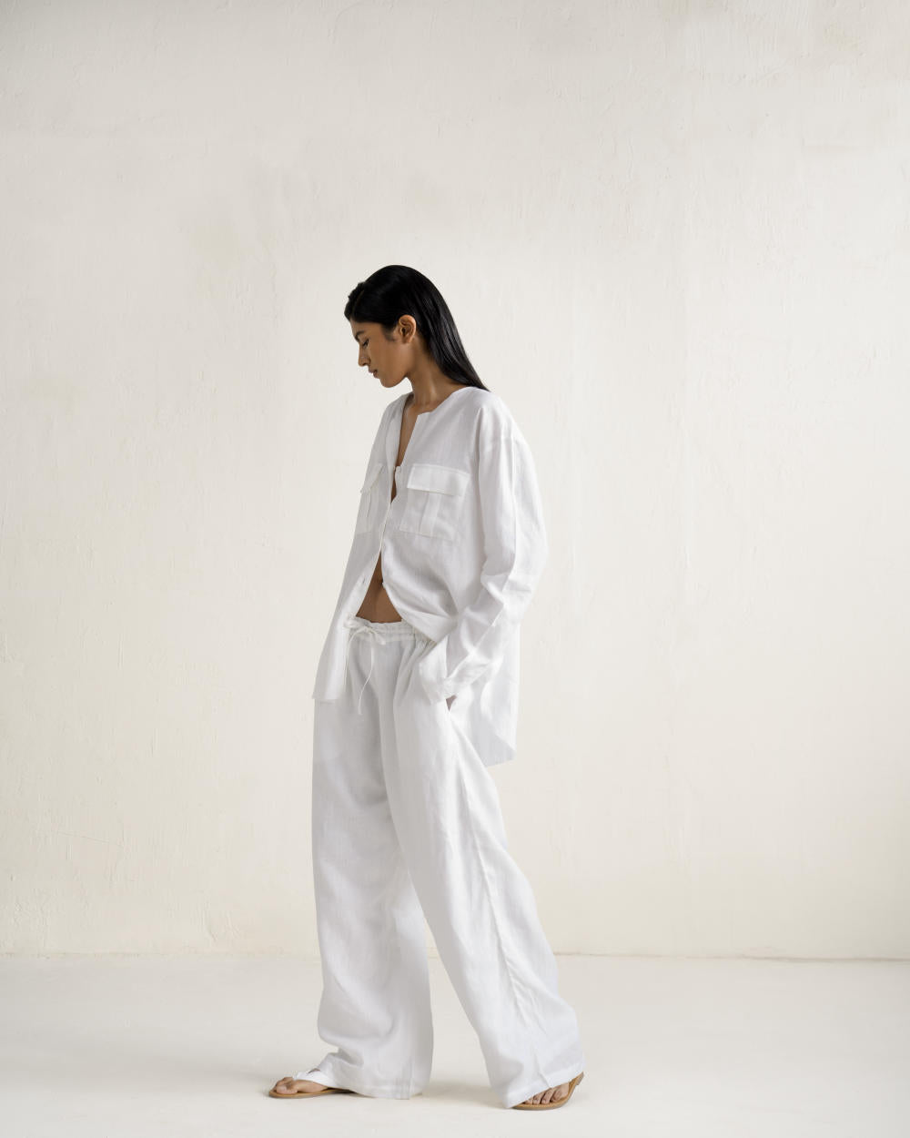 This unisex relaxed shirt set embodies everyday luxury with its rough-trimmed neckline, cuffs, and hem, paired with wide-legged pants for a timeless, laid-back style. A wardrobe essential for effortless, versatile dressing.