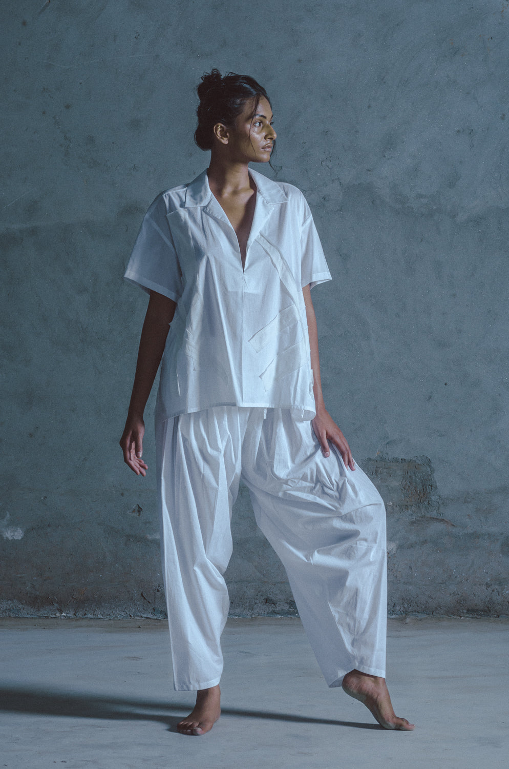 Made from featherlight cotton, this effortless set pairs a collared shirt with signature appliqué and draped salwar. Each piece offers versatile wearability, perfect for laid-back styling.