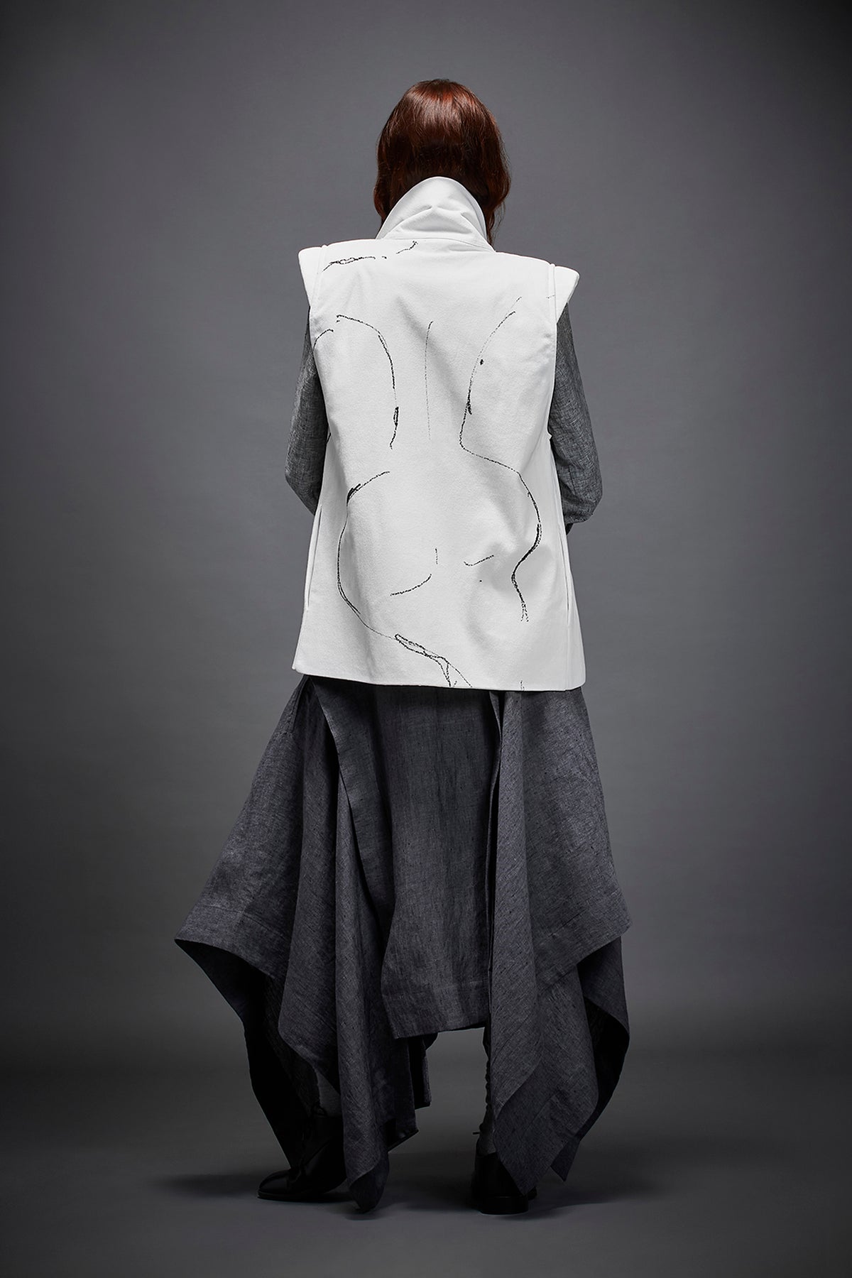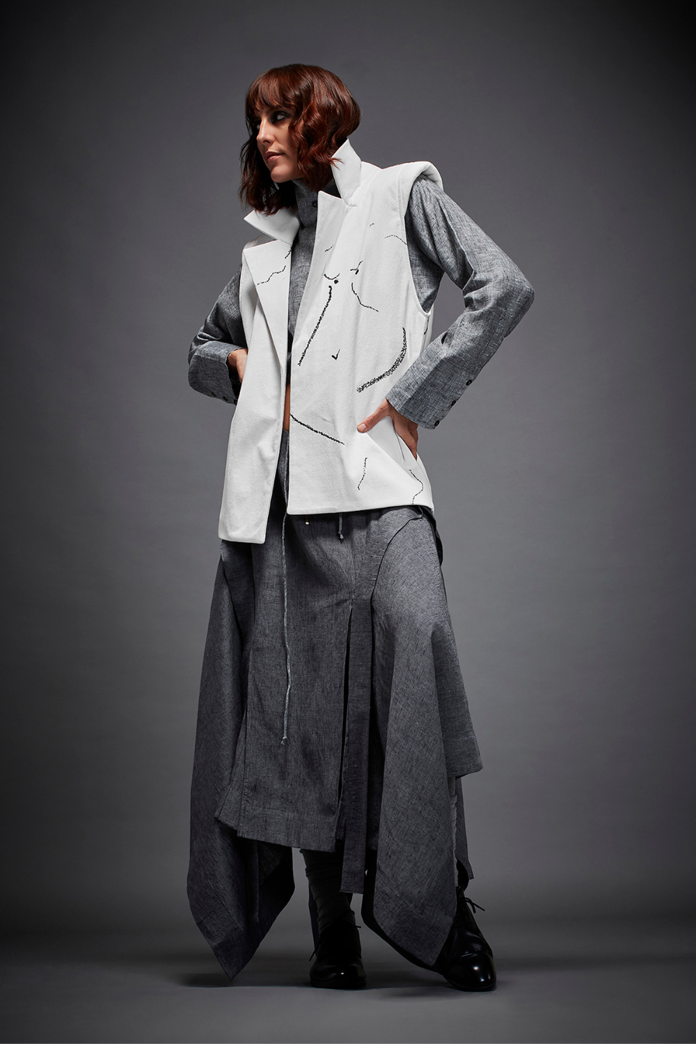 Chola’s universe begins with thoughtful materials. Recycled cottons, post-consumer fabrics, and free-cutting techniques come together in a kind of mindful choreography—one that honours form without creating waste, and prioritises movement over rigidity. This is clothing that feels lived-in yet architectural; pared-back yet quietly avant-garde.