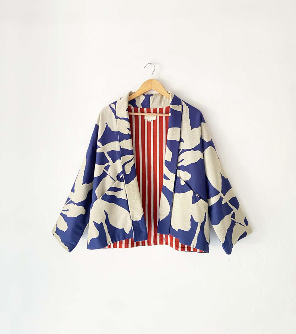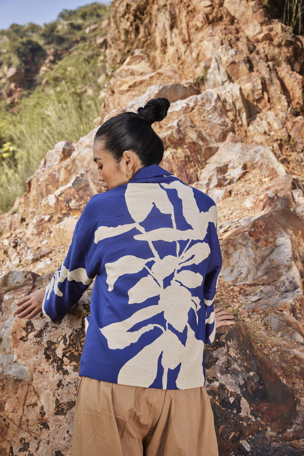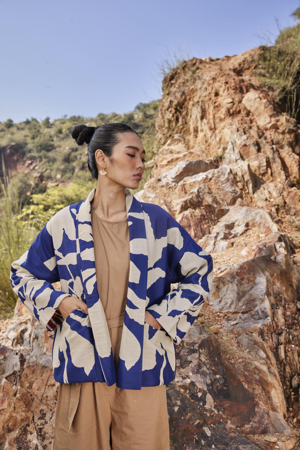 A indigo blue hip length kimono style jacket handcrafted in cotton with warm sandwich fabric. It comes with front pocket.