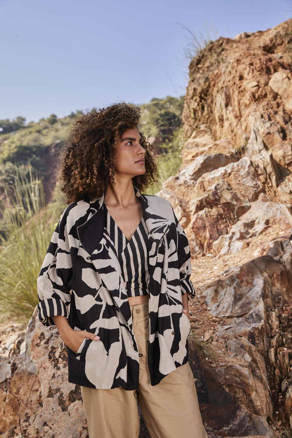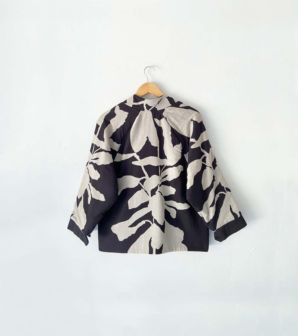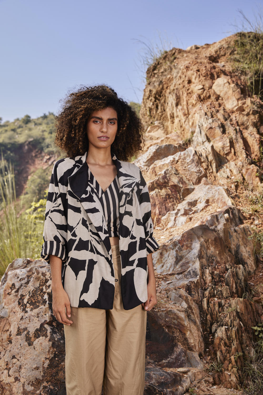 A hip length black and white abstract printed jacket handcrafted in cotton with warm sandwich fabric and front button closure. It comes with black and white striped lining.