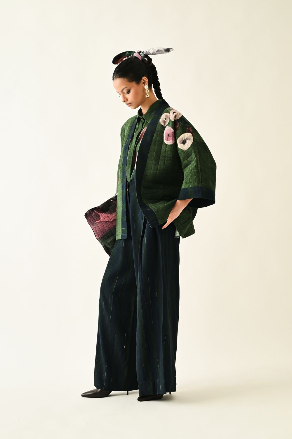 Jacket: A handcrafted quilted jacket featuring a vibrant floral hand-painted pattern on a textured grid base. Designed with a relaxed, open-front silhouette and a contrasting striped lapel.